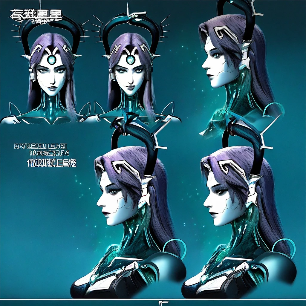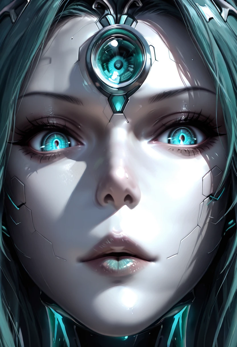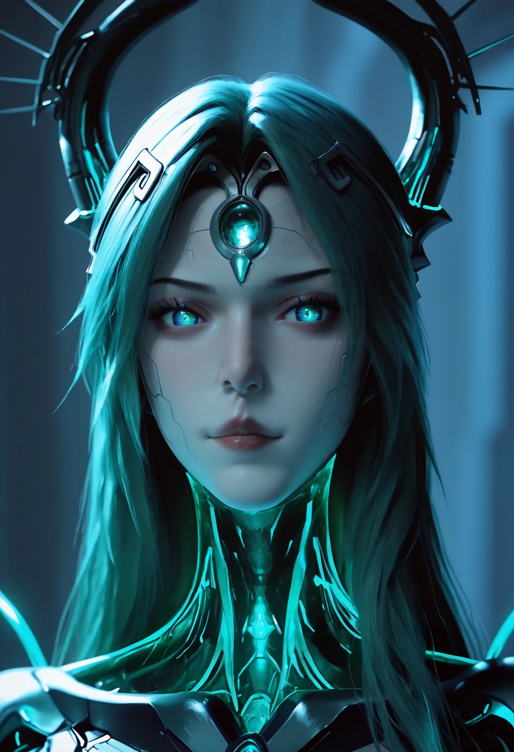 Keywords also used: snake woman, cyborg lamia, futuristic snake-themed character, biomechanical hybrid, snake tail lower body, green hair, long hair, forehead jewel, hologram, android, makeup, robot joints, metallic body parts, teal glowing eyes, forehead jewel, cyberpunk aesthetic, techno-organic design, snake horns, glowing teal highlights, holographic elements, snake tail