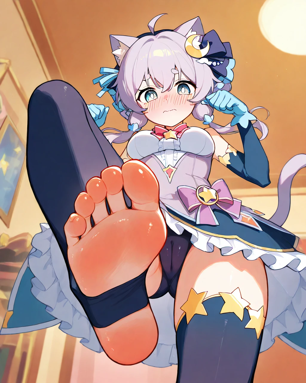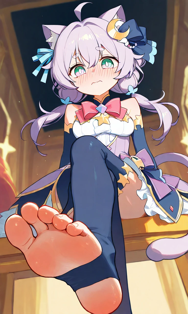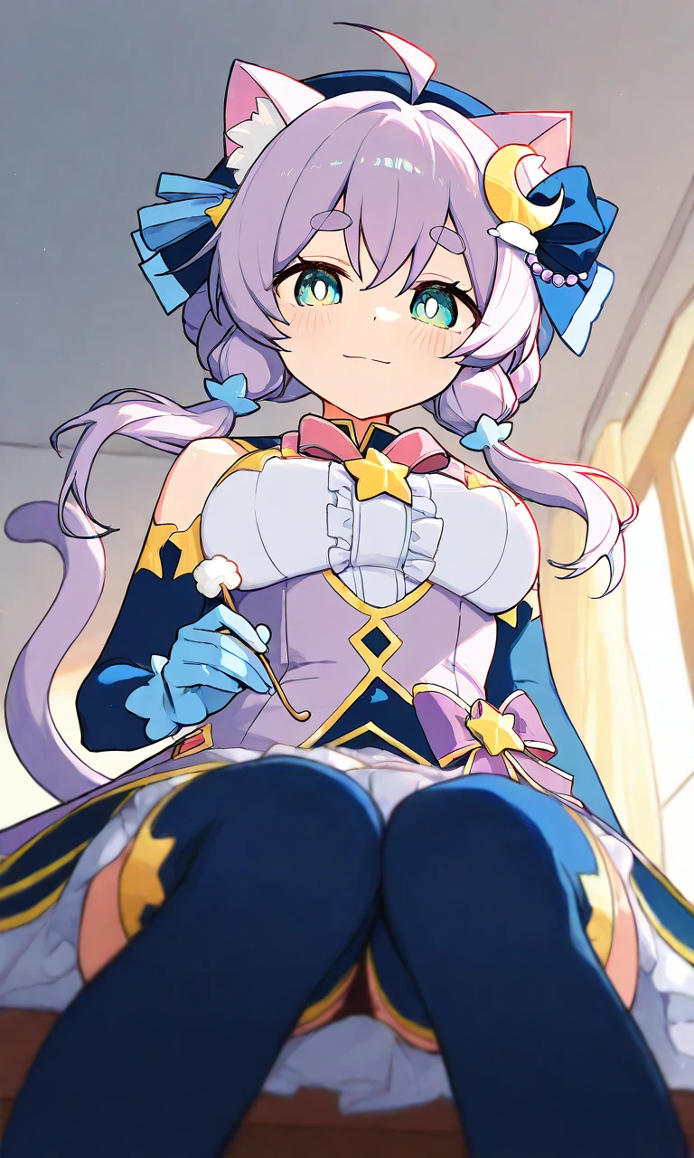salt\(maimai\), thick eyebrows, ahoge, hair between eyes, cat ears, cat tail, animal ear fluff, green eyes, (grey purple hair:1.1), hair ornament, small breasts, star ribbon,star \(symbol\), star decorations, crescent hair ornament, blue elbow gloves, frills,