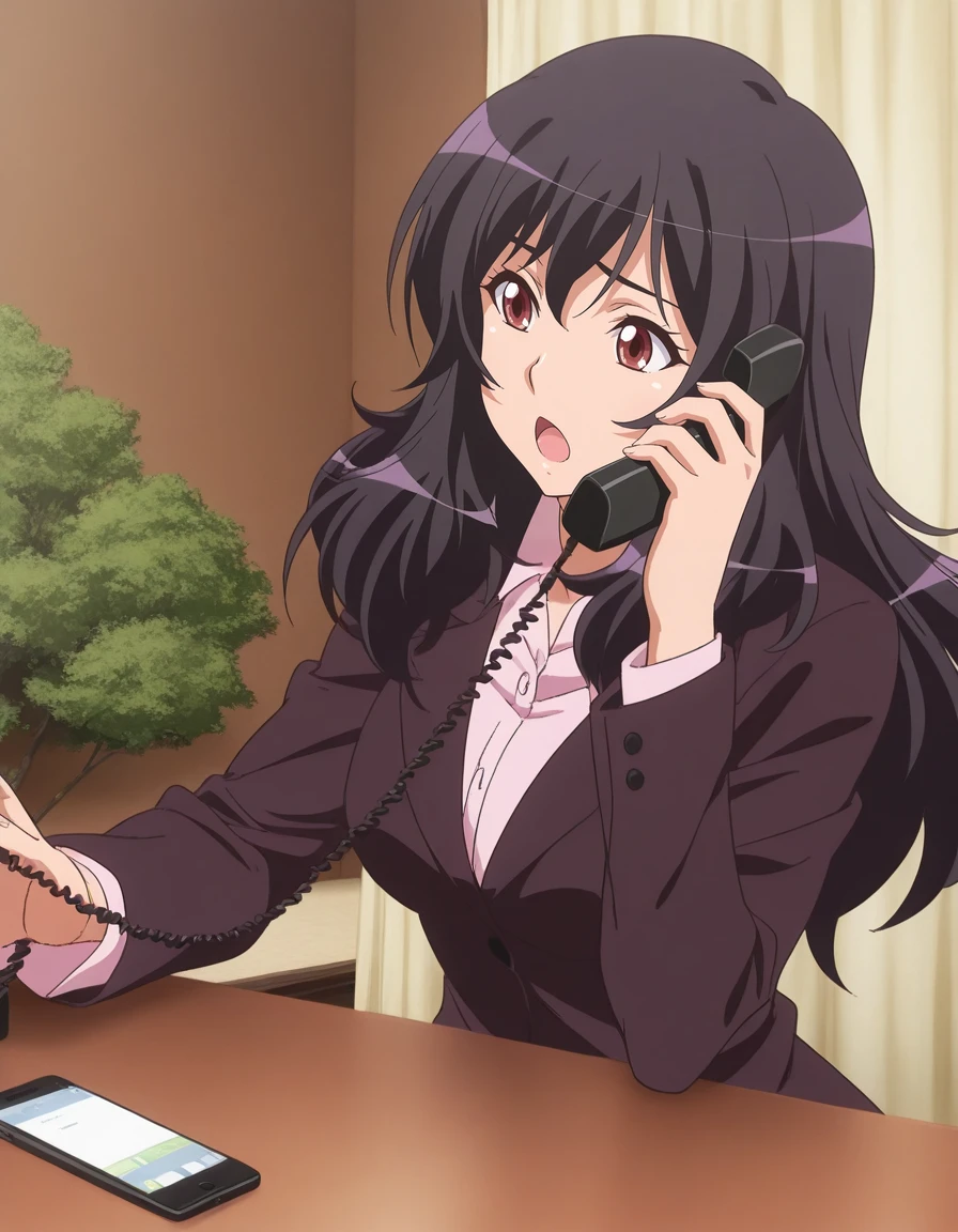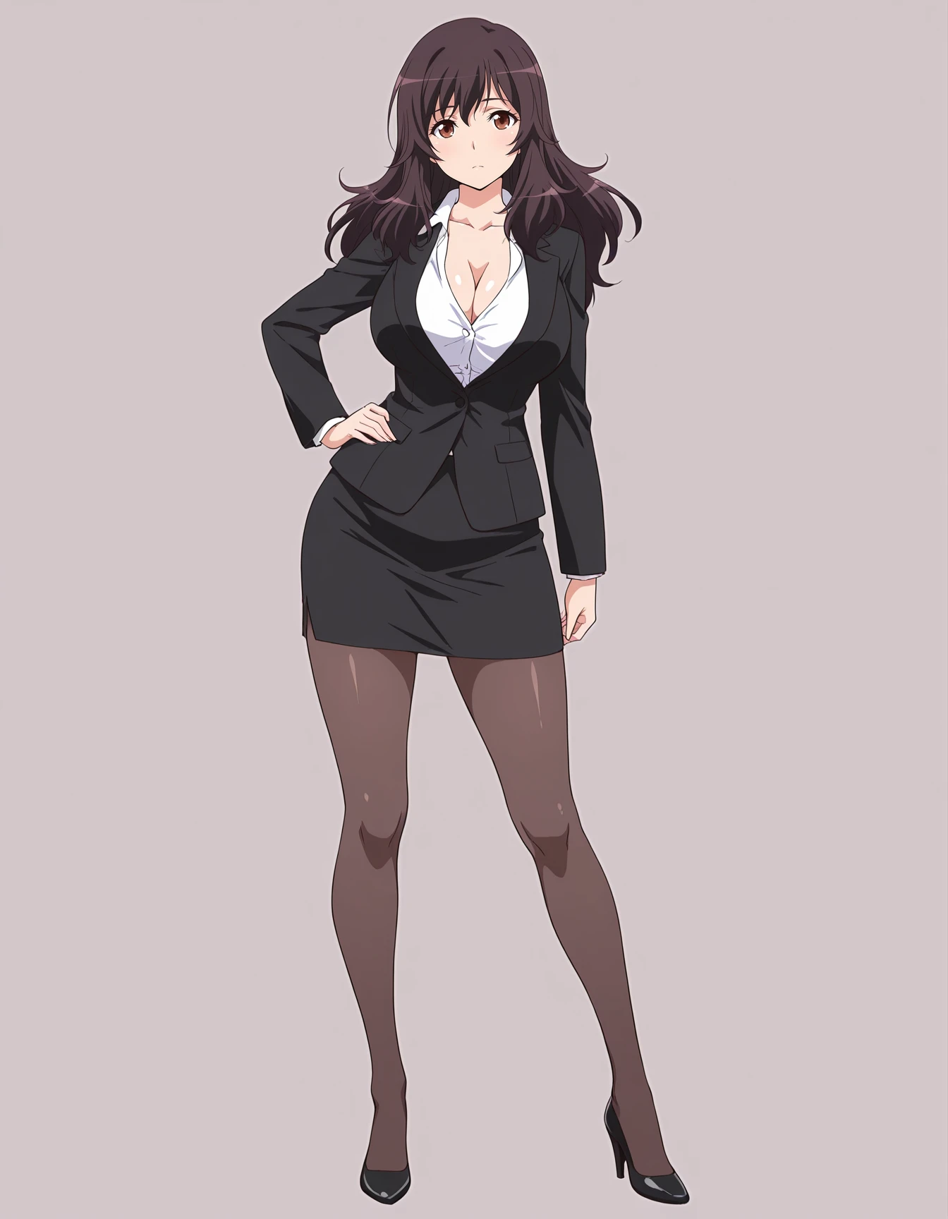 mai_marb,mai_sayakamb,anime_coloring,long_hair,brown_hair,brown_eyes,suit,cleavage,collared_shirt,white_shirt,black_jacket,black_pencil_skirt,pantyhose,high_heels