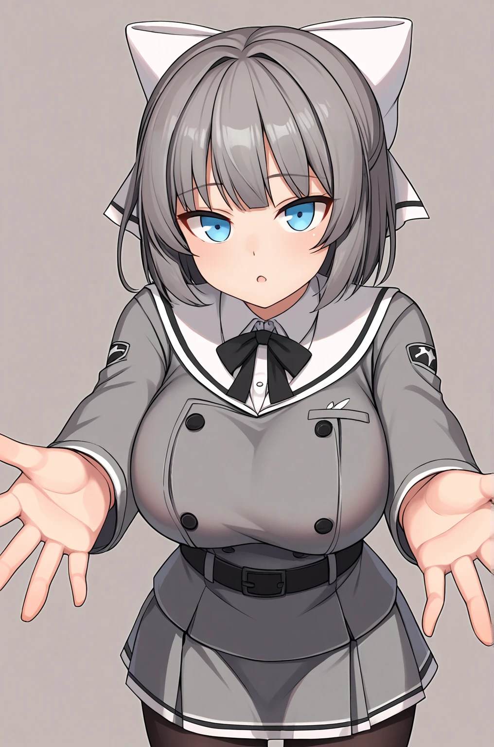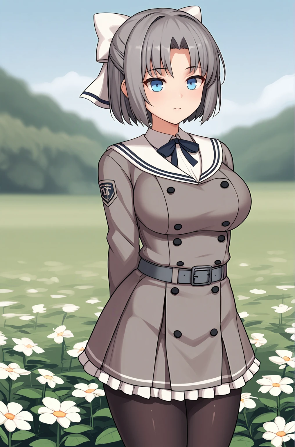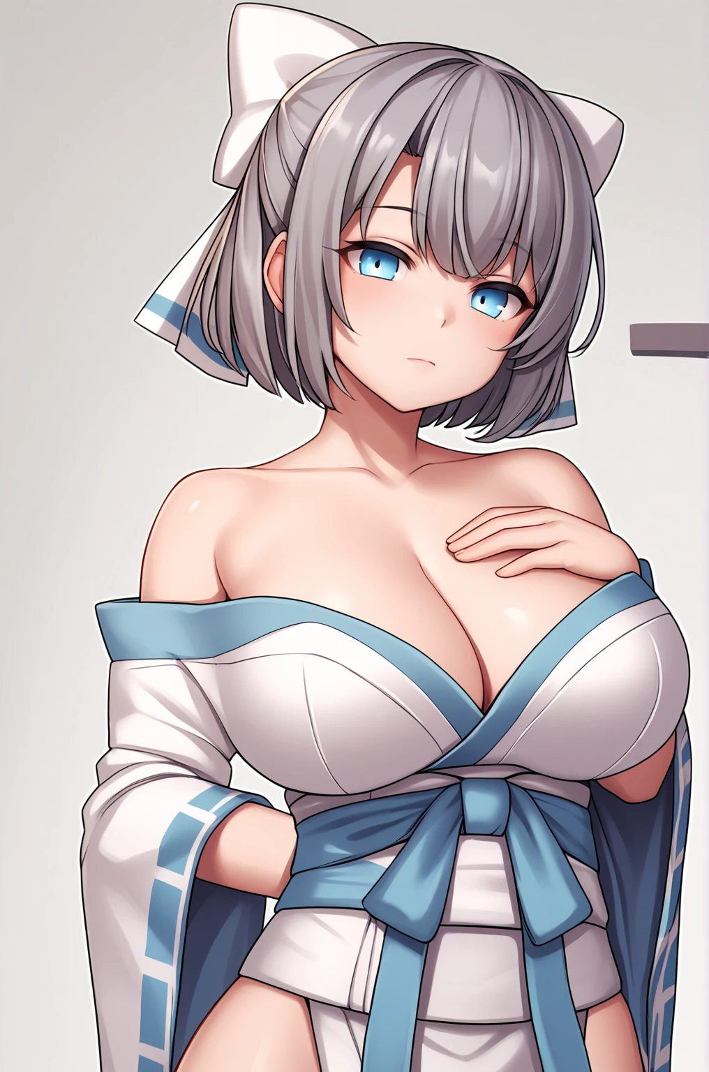 Trigger Word for the LoRA are "Yumi_XL, blue eyes, short hair, grey hair, hair bow, white bow, large breasts,". Of course you can remove the "large breasts".