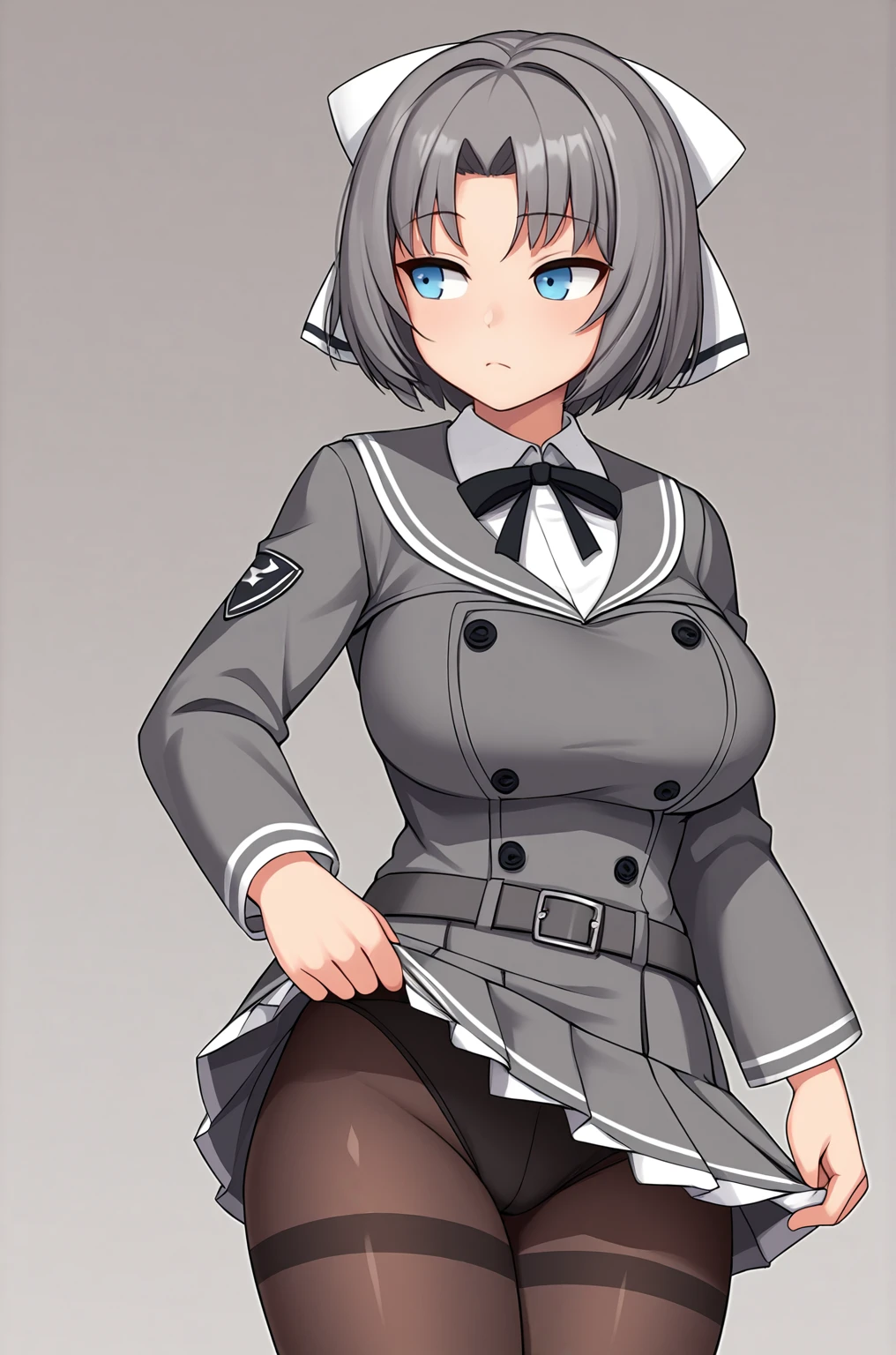 Trigger Words for school outfit are "Yumi_Gessen, school uniform, white sailor collar, black neck ribbon, grey jacket, black buttons, grey skirt, skirt frills, grey belt, black pantyhose, grey loafers".