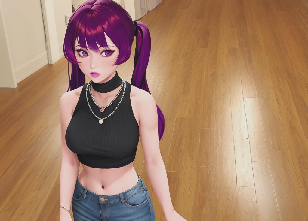 Houseintherift_lyriel, 1girl, bare shoulders, breasts, crop top, indoors, jewelry, large breasts, lips, long hair, looking at viewer, midriff, necklace, parted lips, purple eyes, purple hair, red eyes, red hair, sleeveless, solo, twintails, wooden floor