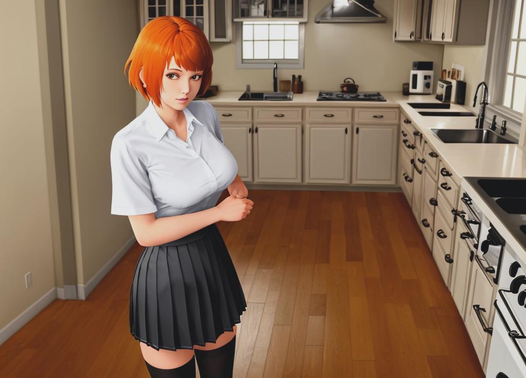 Houseintherift_lyriel, 1girl, breasts, food, kitchen, orange hair, pleated skirt, school uniform, open shirt, short hair, skirt, solo, thighhighs, looking at viewer