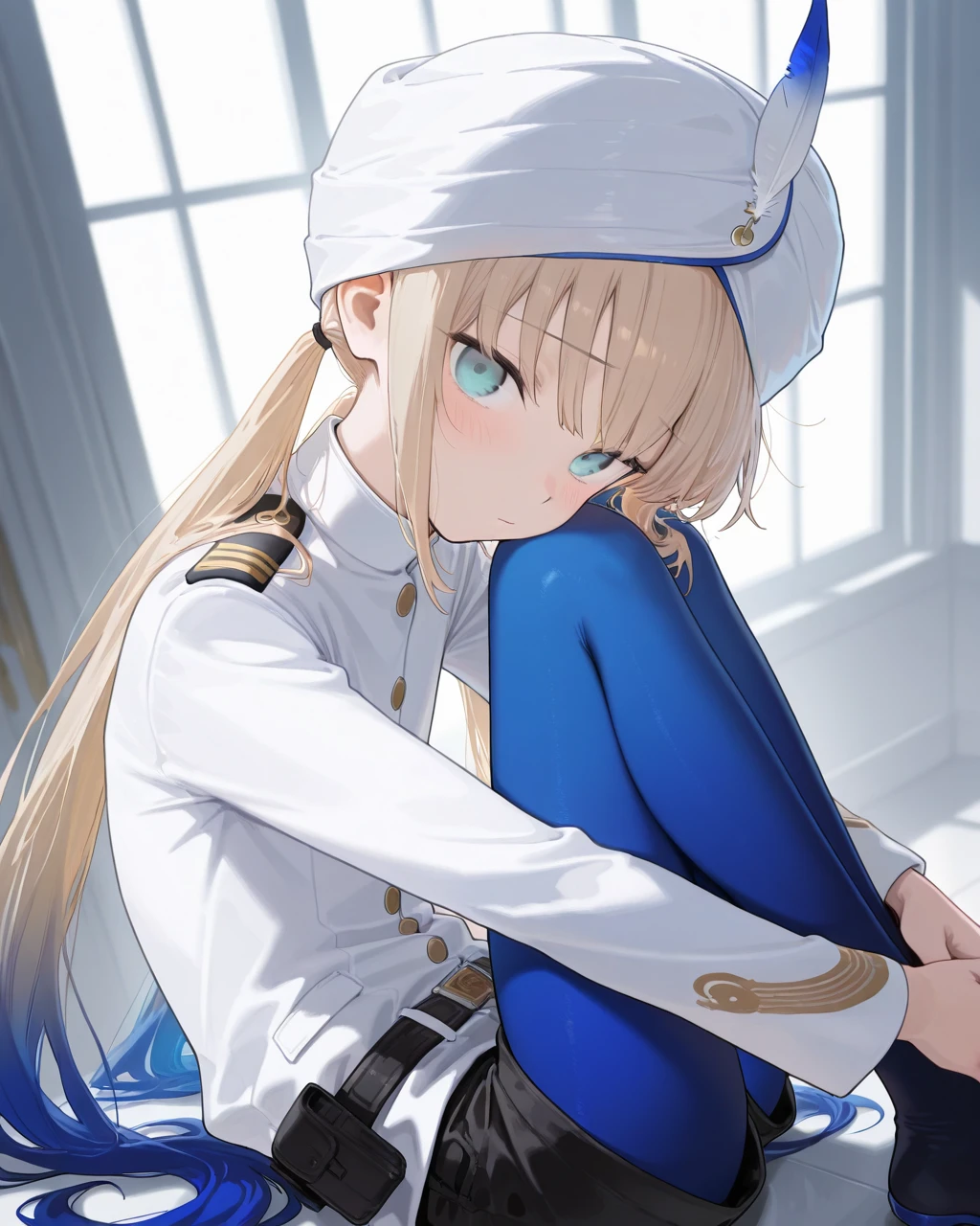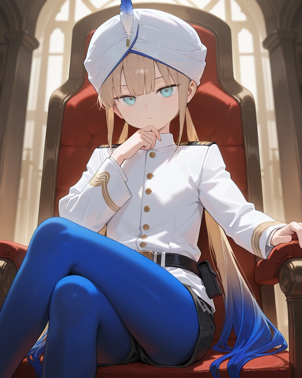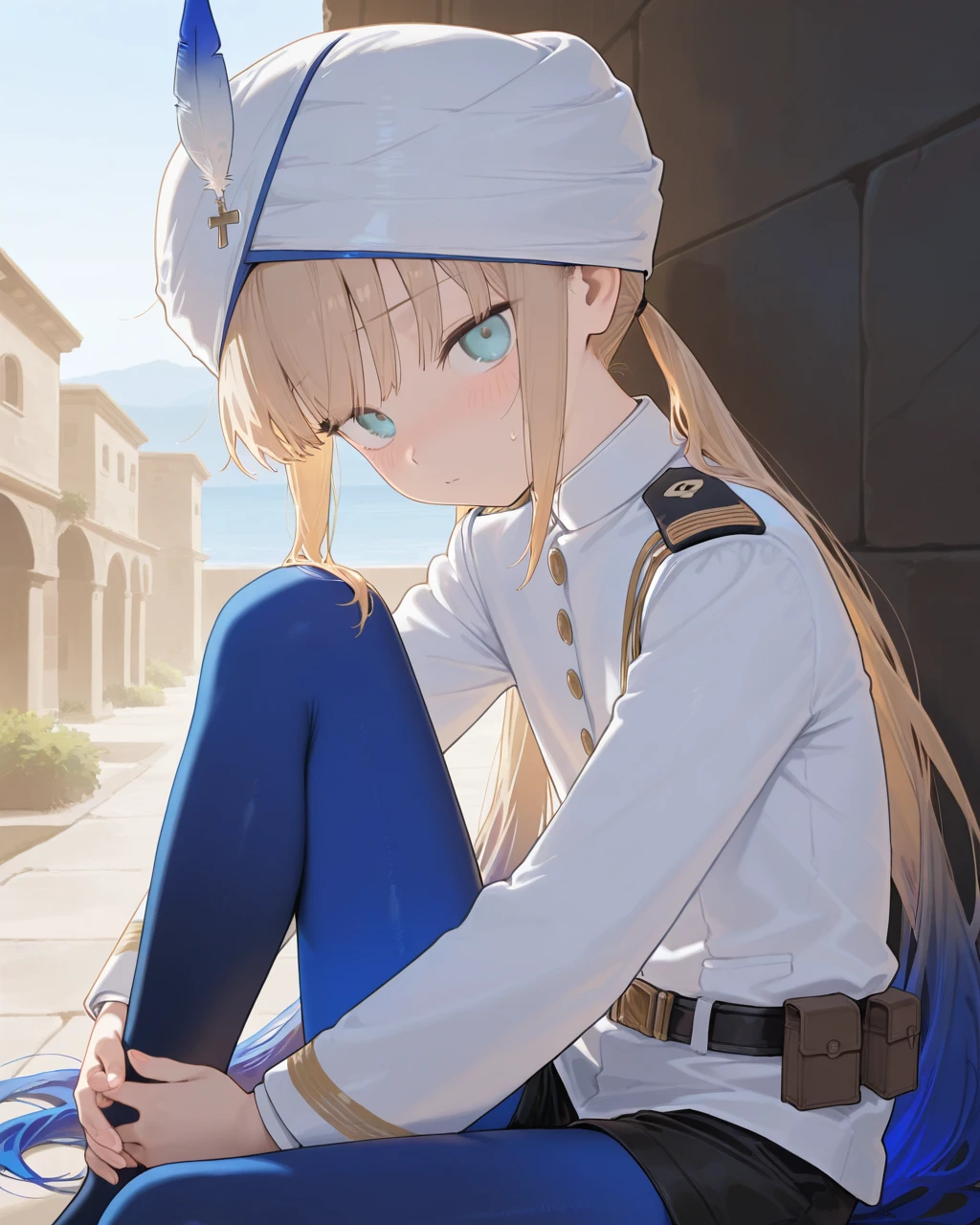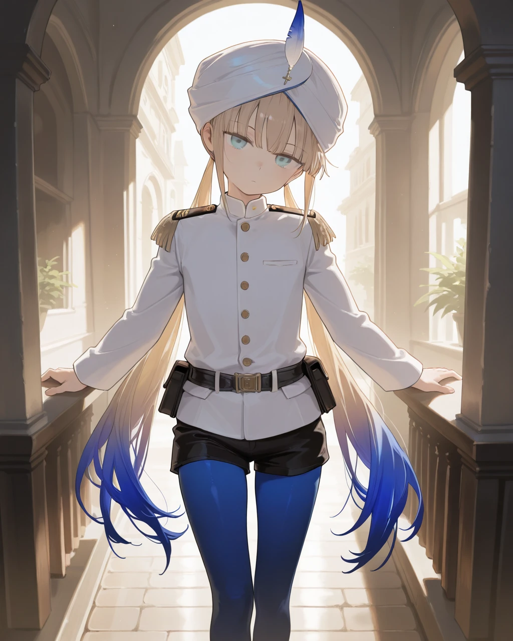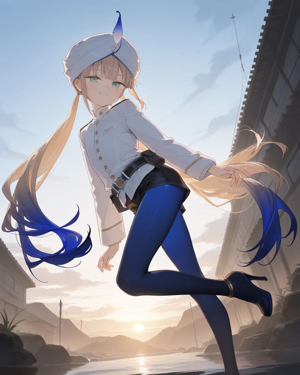 Clothes: white turban, hat feather, white jacket, naval uniform, long sleeves, black belt, belt pouch, black short shorts, pantyhose under shorts, blue pantyhose, high heels