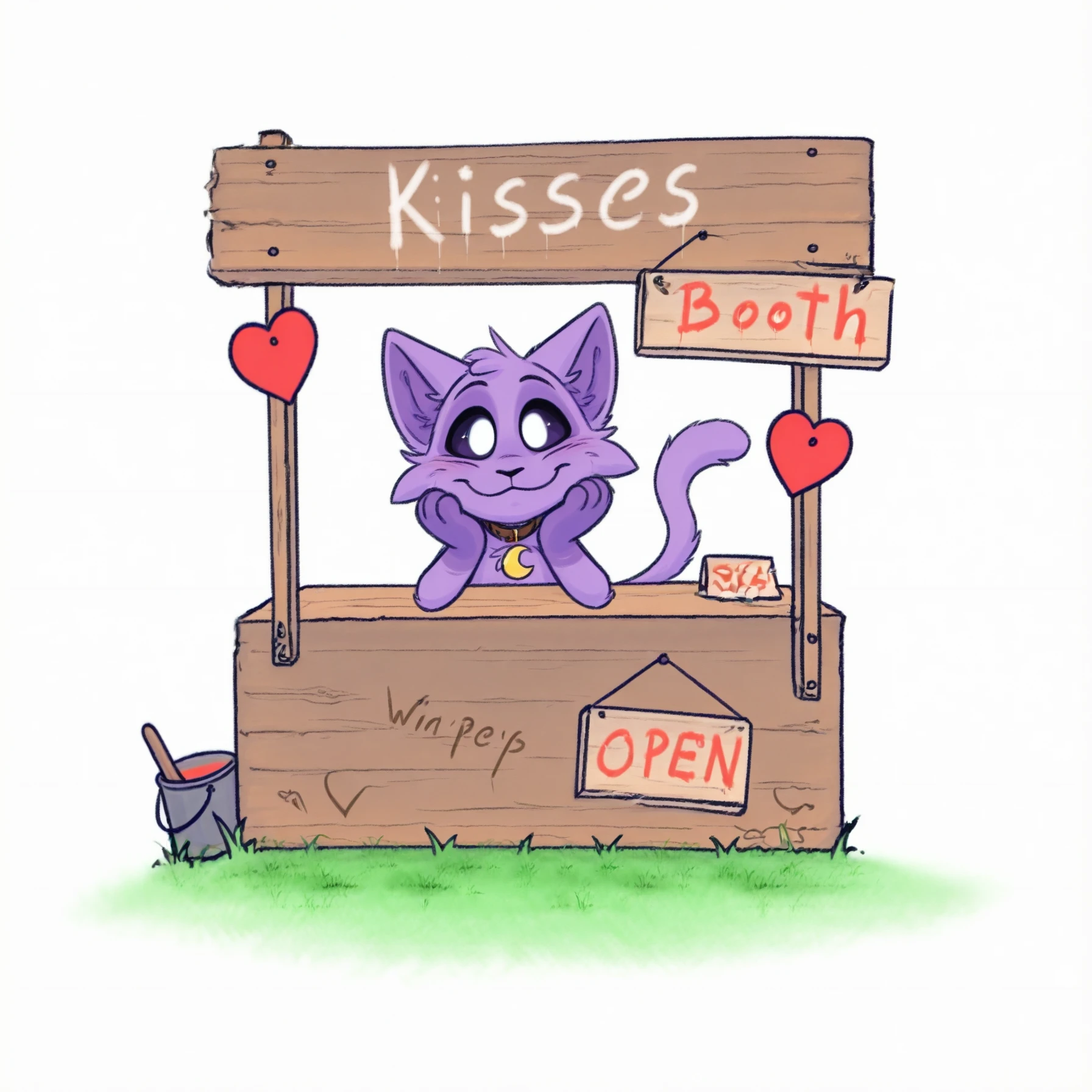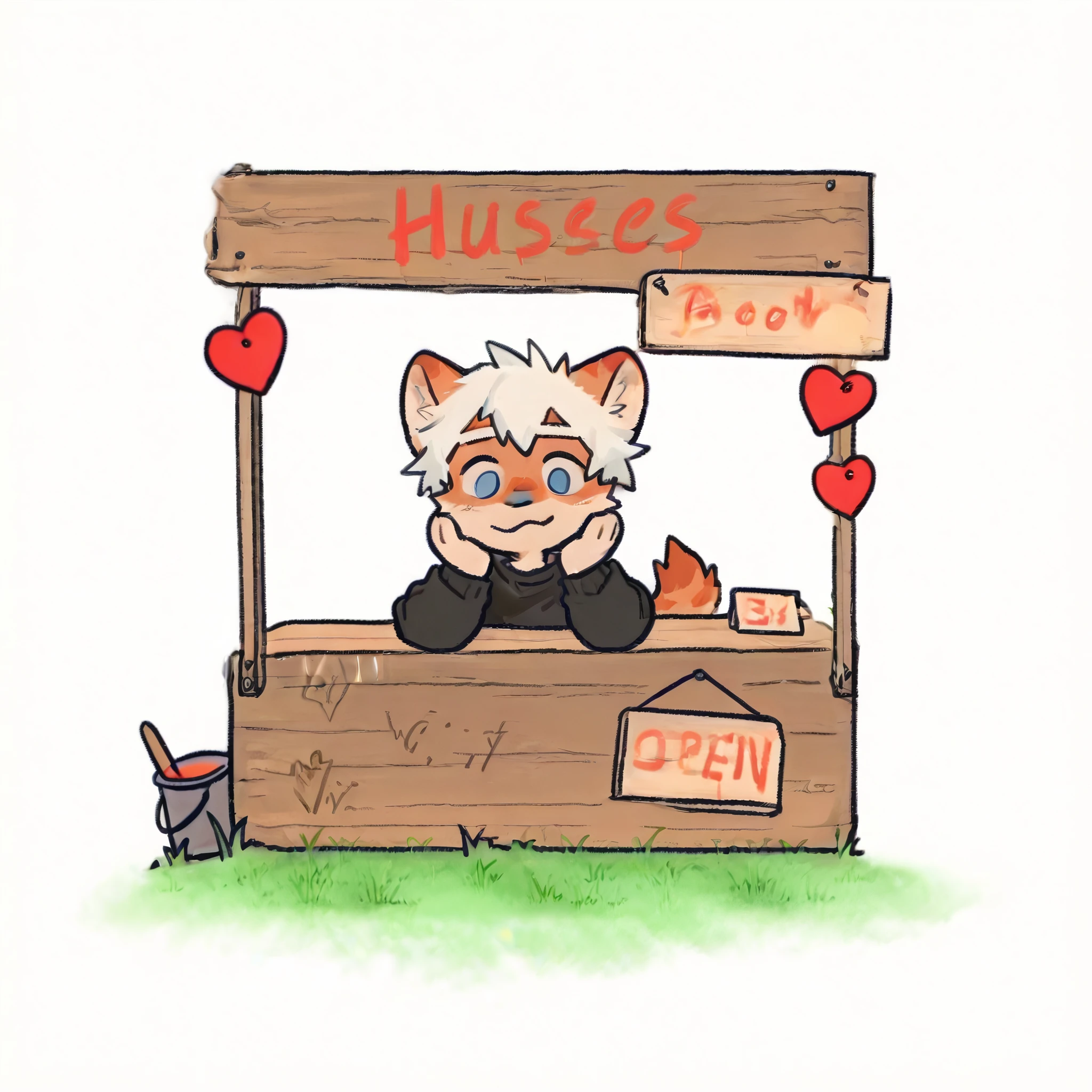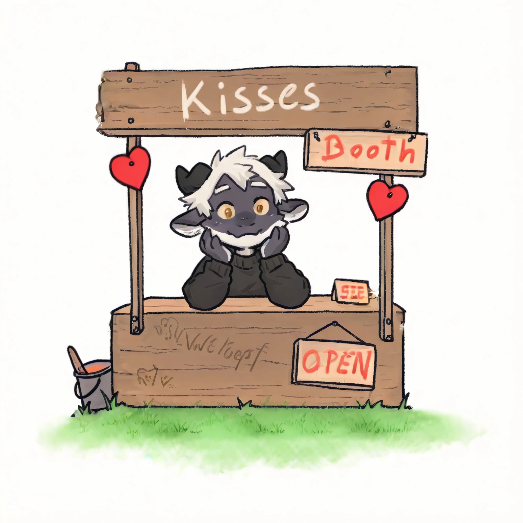 <lora:wooden_booth_valentines-il:1>, mikus-concept, wooden booth, handmade sign, hearts decoration, 5 cents price tag, grass ground, bucket, red hearts hanging, chibi, BREAK, solo, leaning on counter, upper body, hands on cheeks, text, BREAK