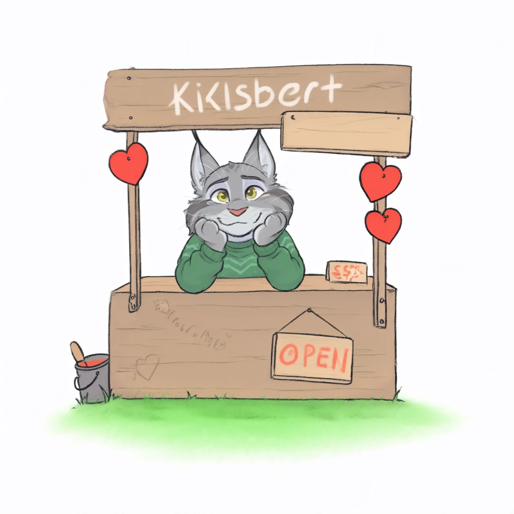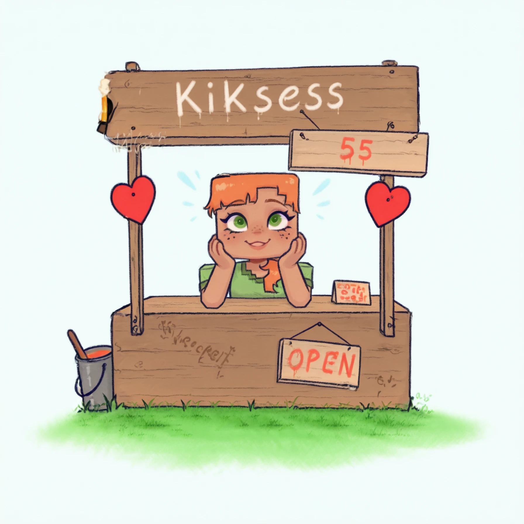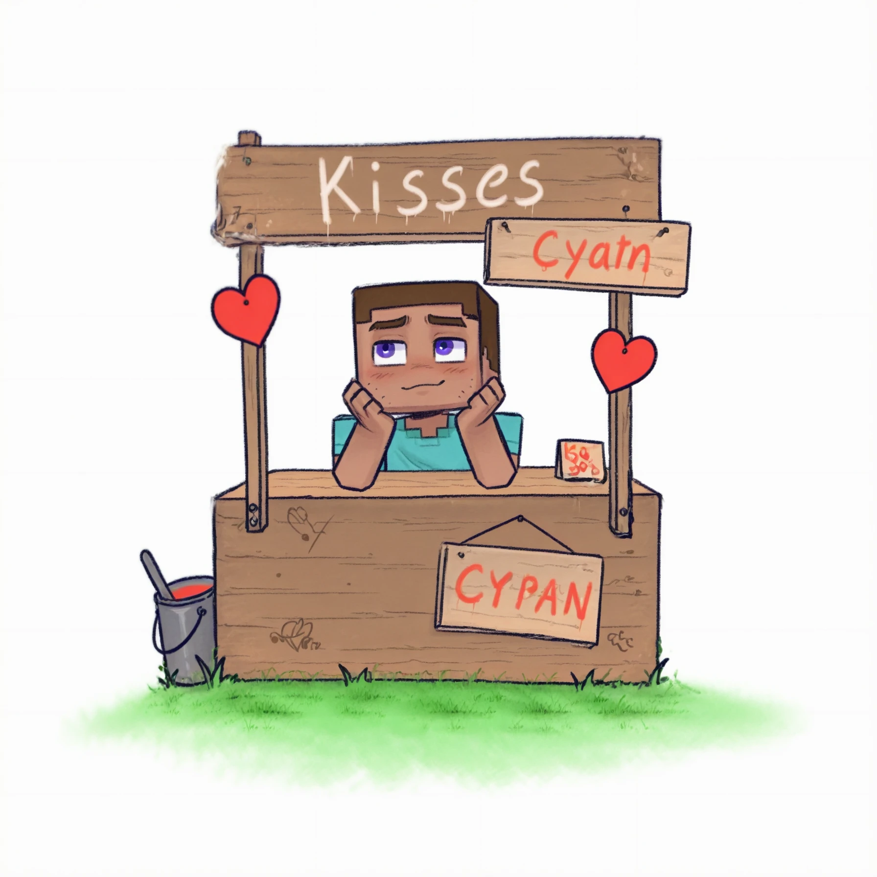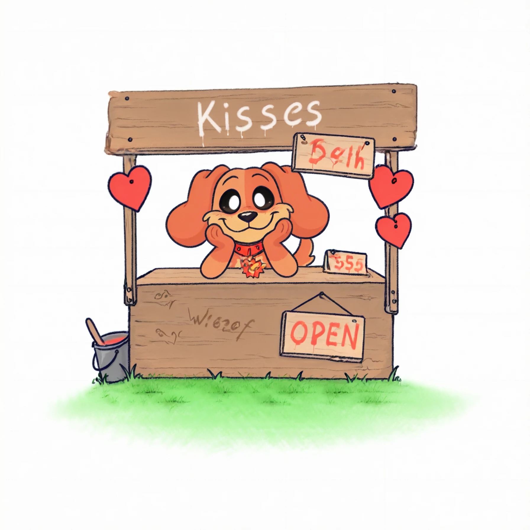 <lora:wooden_booth_valentines-il:1>, mikus-concept, wooden booth, handmade sign, hearts decoration, 5 cents price tag, grass ground, bucket, red hearts hanging, chibi, BREAK, solo, leaning on counter, upper body, hands on cheeks, text, BREAK
