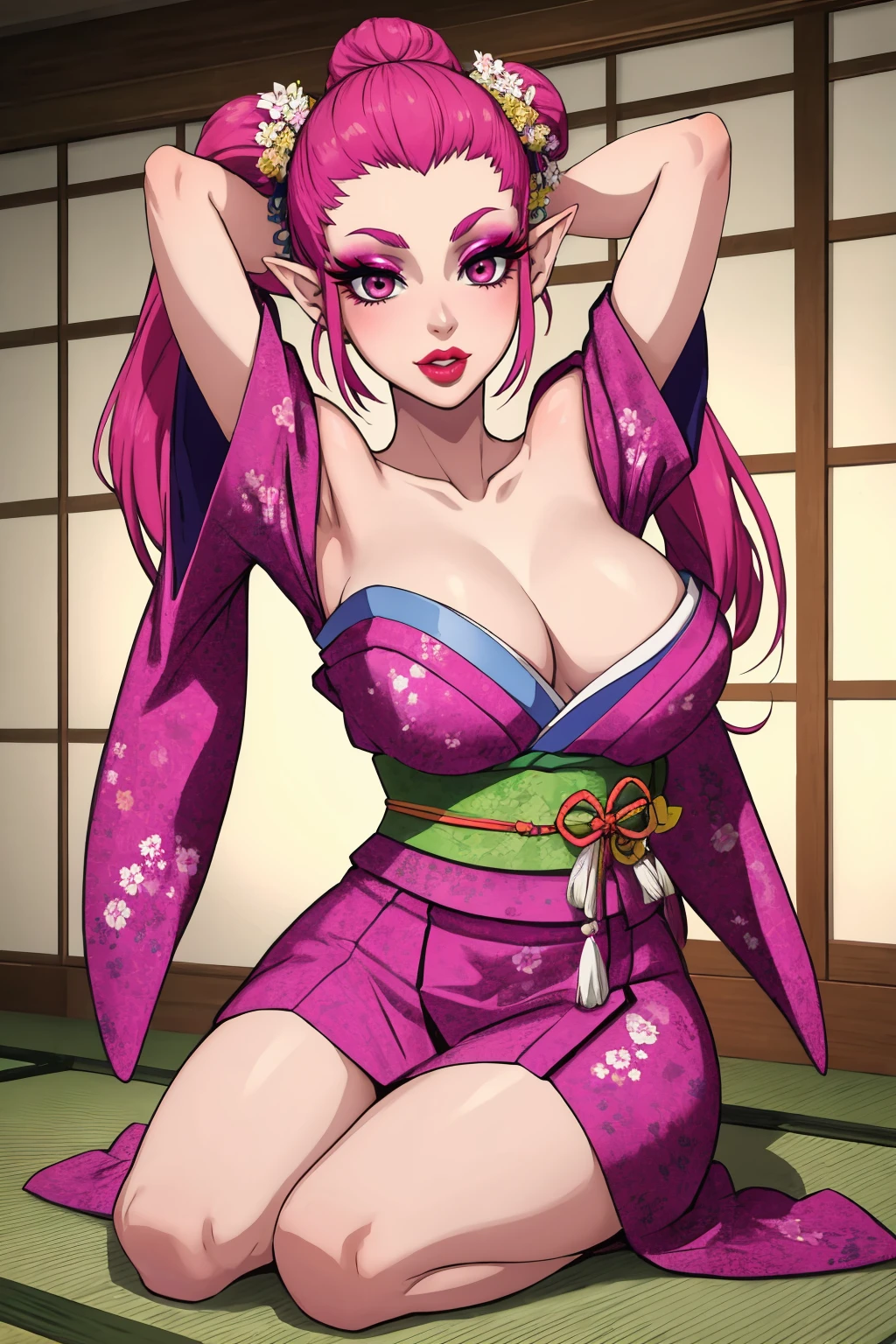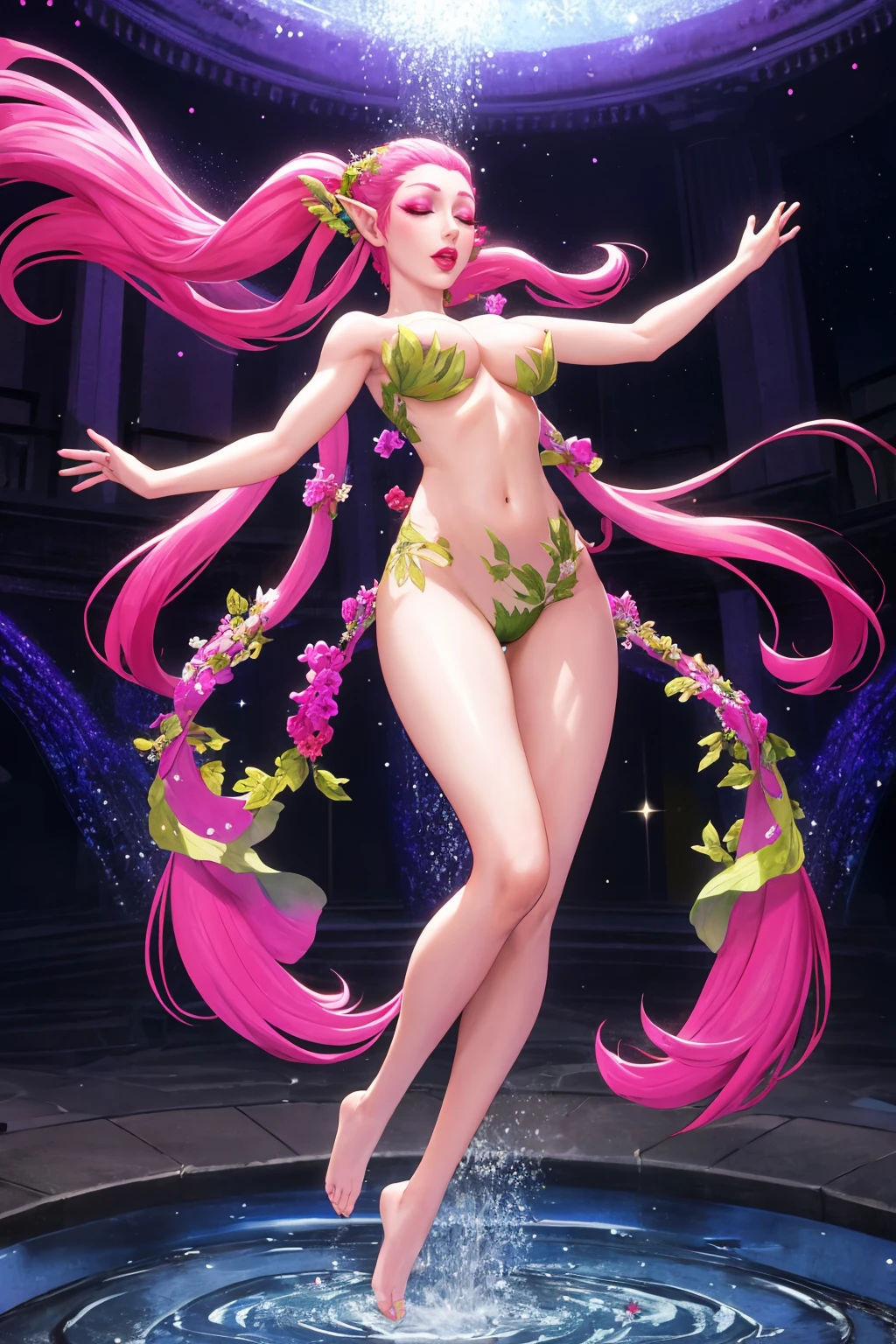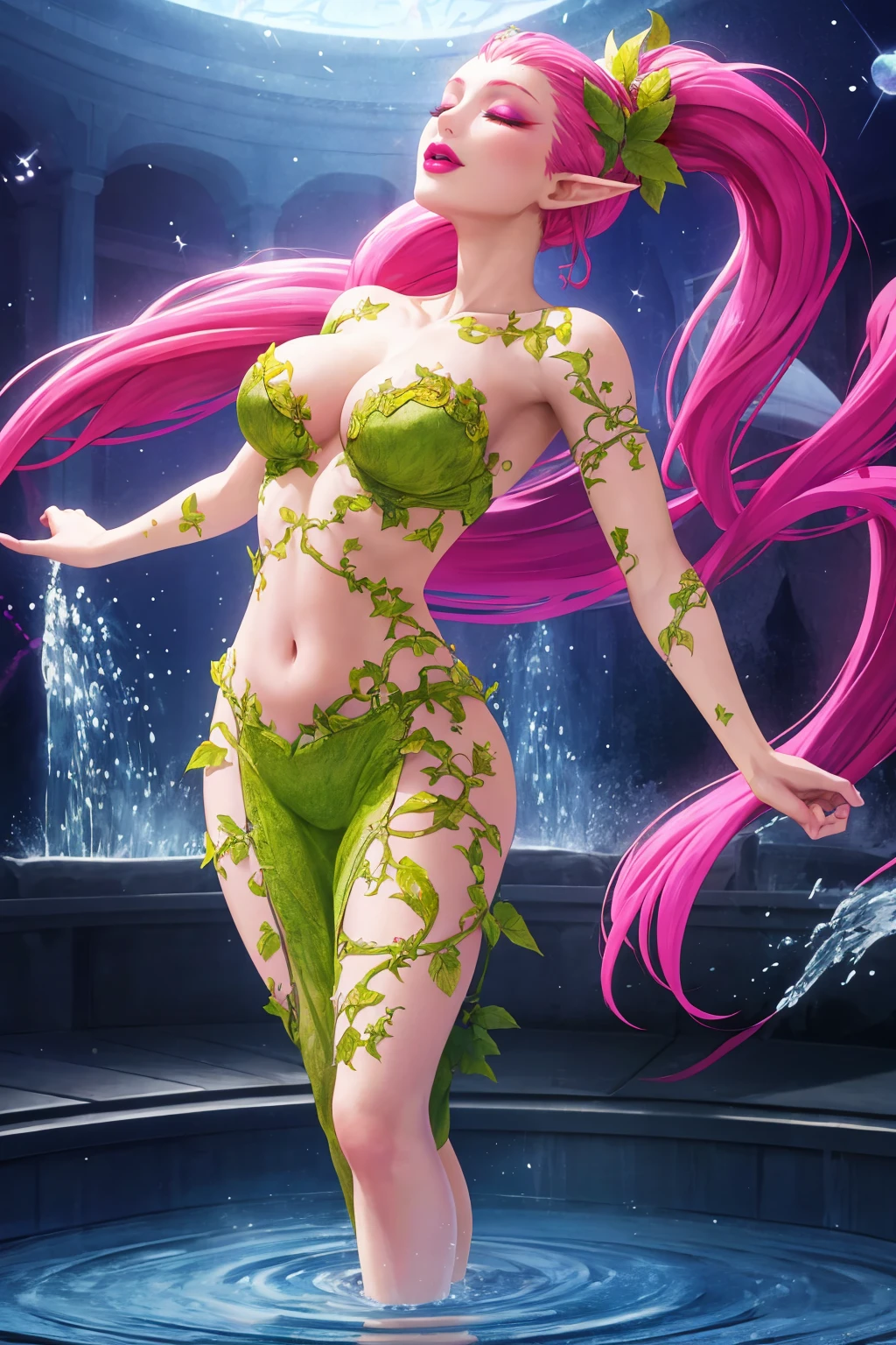 greatfairy, pink hair, eyeshadow, lipstick, leaf, vines, cleavage, navel, floating hair, nude