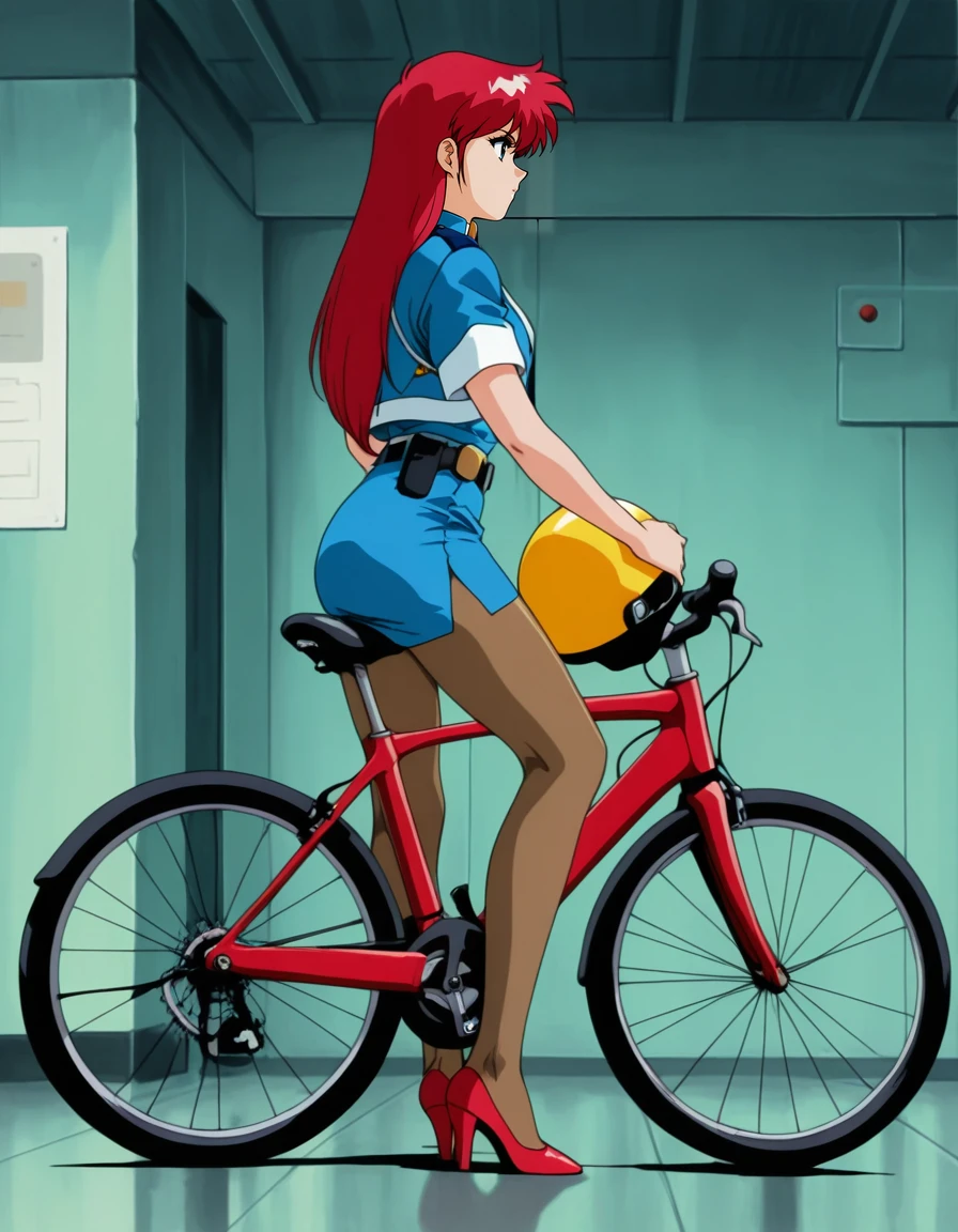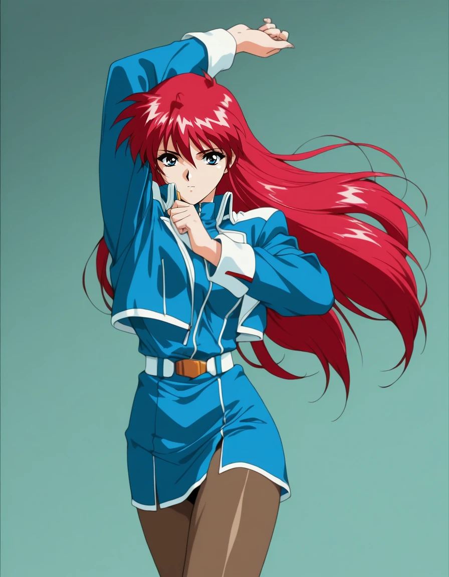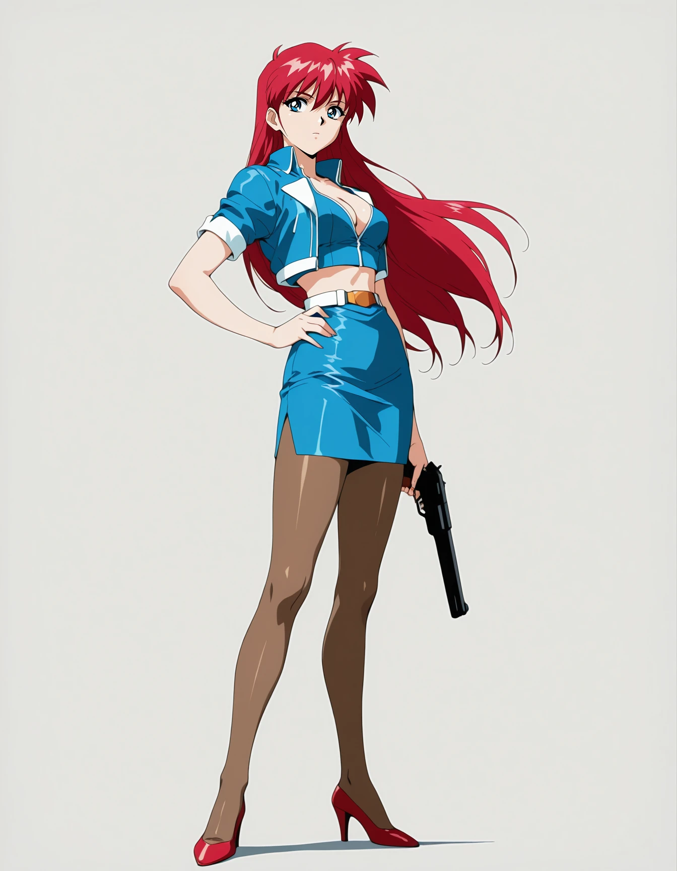 mai-el,retro_artstyle,1990s_(style),long_hair,red_hair,blue_eyes,blue_shirt,cleavage,crop_top,pencil_skirt,brown_pantyhose,high_heels,red_footwearRecommend preferred Strength: 0.7~1.
