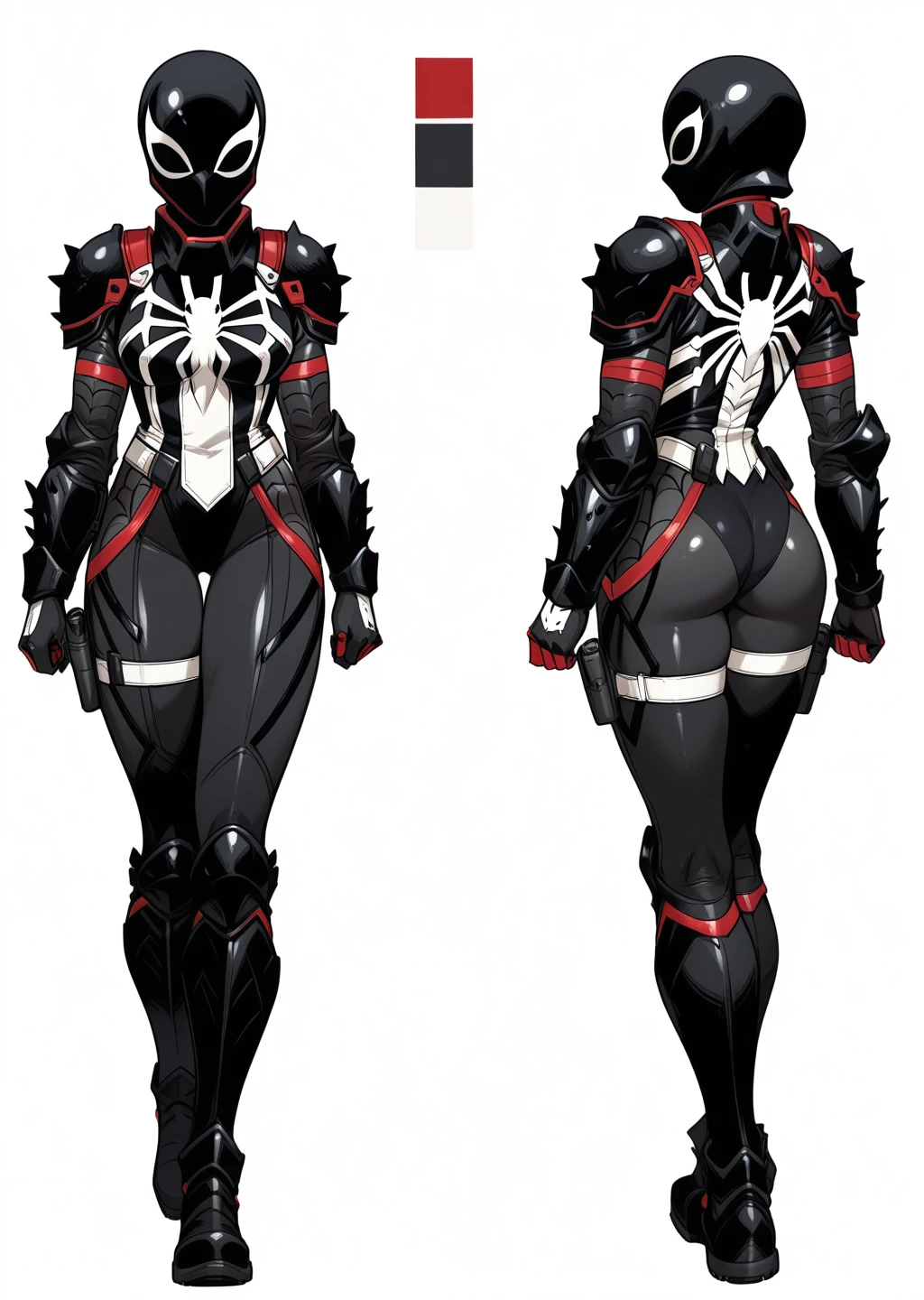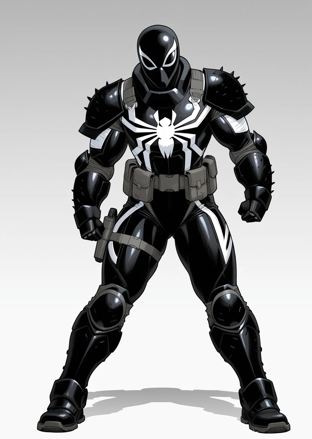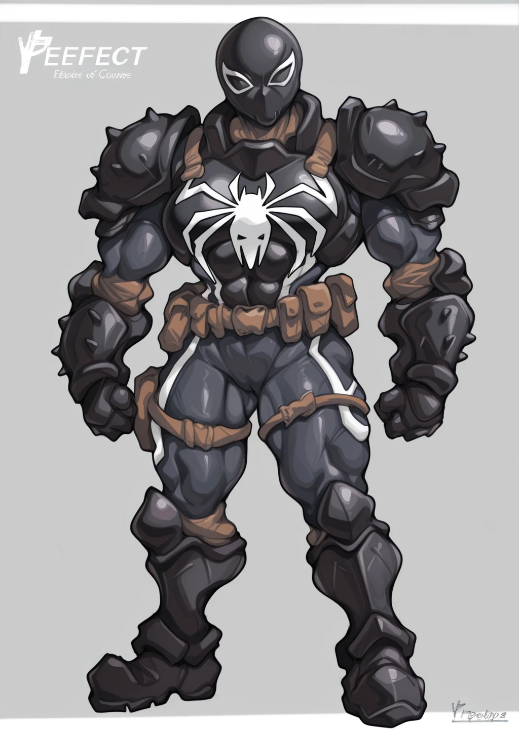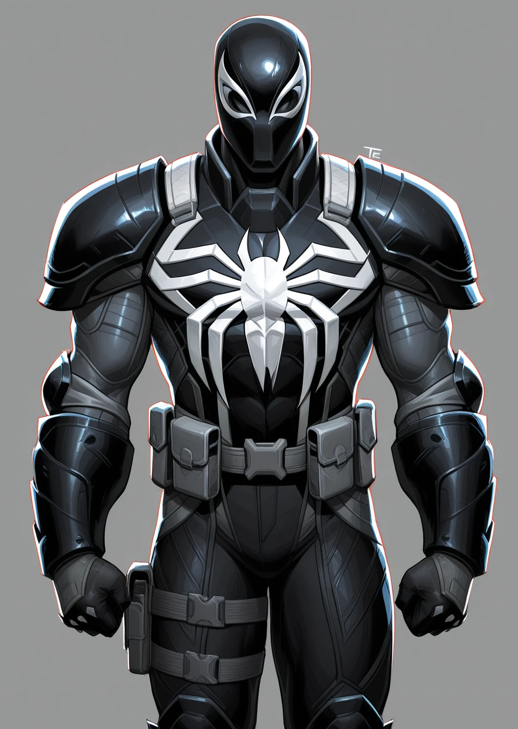 black suit, black armour, spider emblem, over face helmet, guns, black and white outfit, black tendrils,