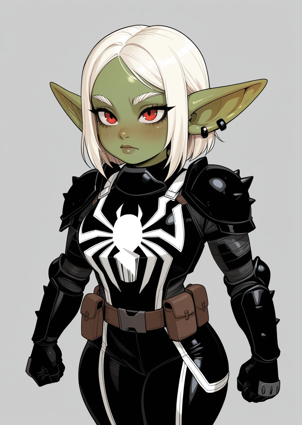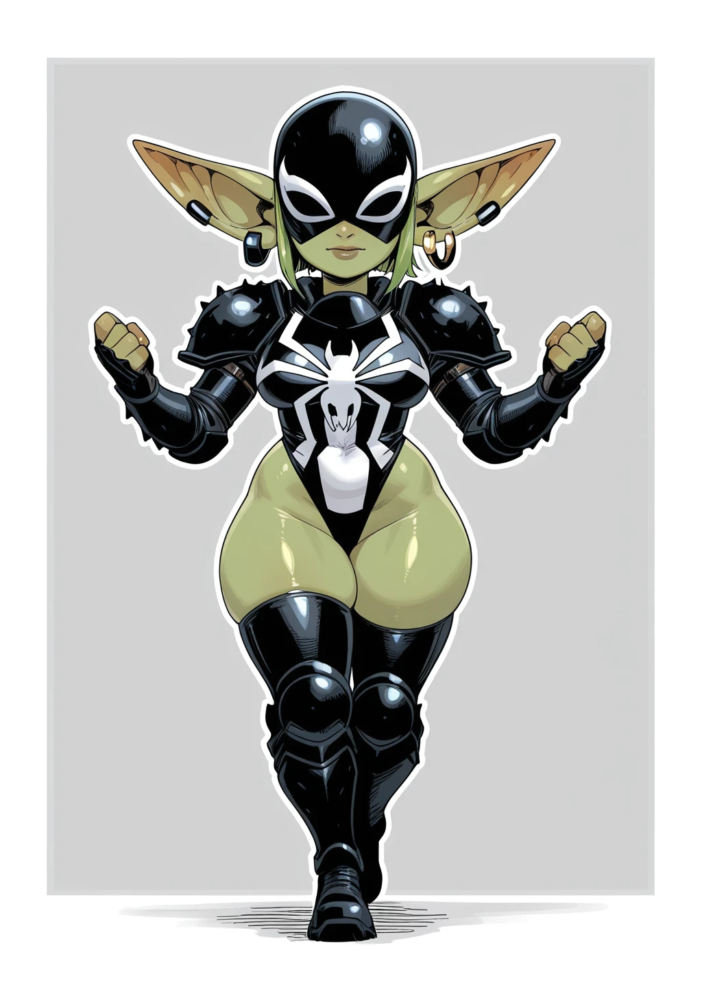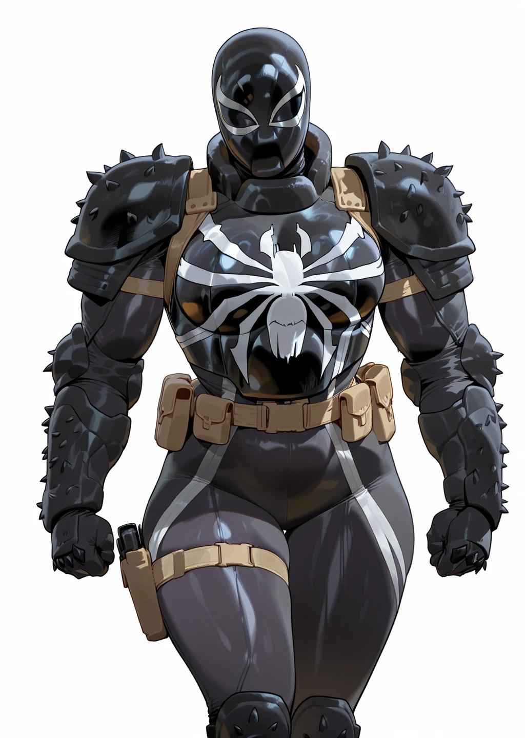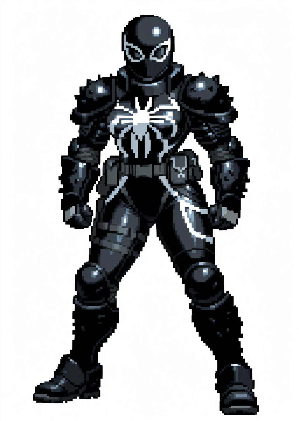 black suit, black armour, spider emblem, over face helmet, guns, black and white outfit, black tendrils,