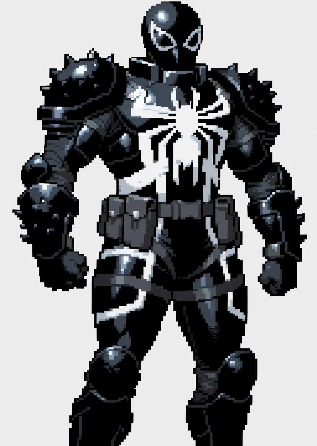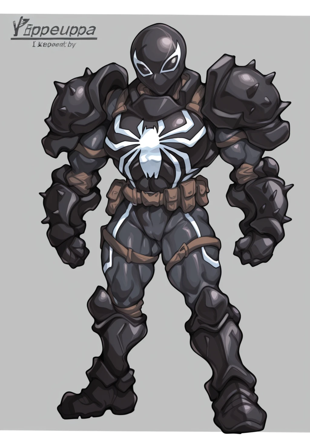 Prompts: black suit, black armour, spider emblem, over face helmet, guns, black and white outfit, black tendrils,