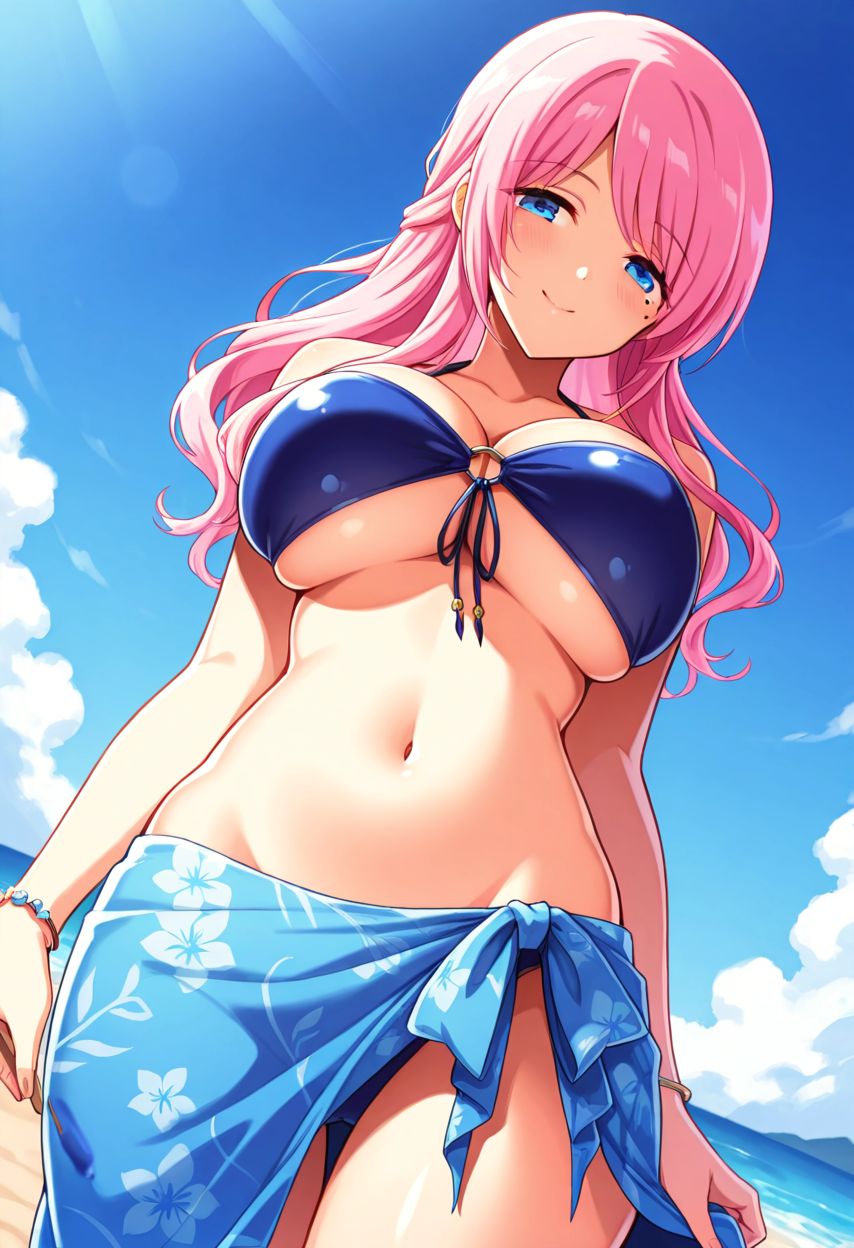 Outfit 3 (Beach): long hair,half updo,navel, bikini, underboob, front-tie tip, blue bikini, blue sarong, print sarong, two rings bracelet on right wrist, bikini with flower pedal design, o-ring top with a tail