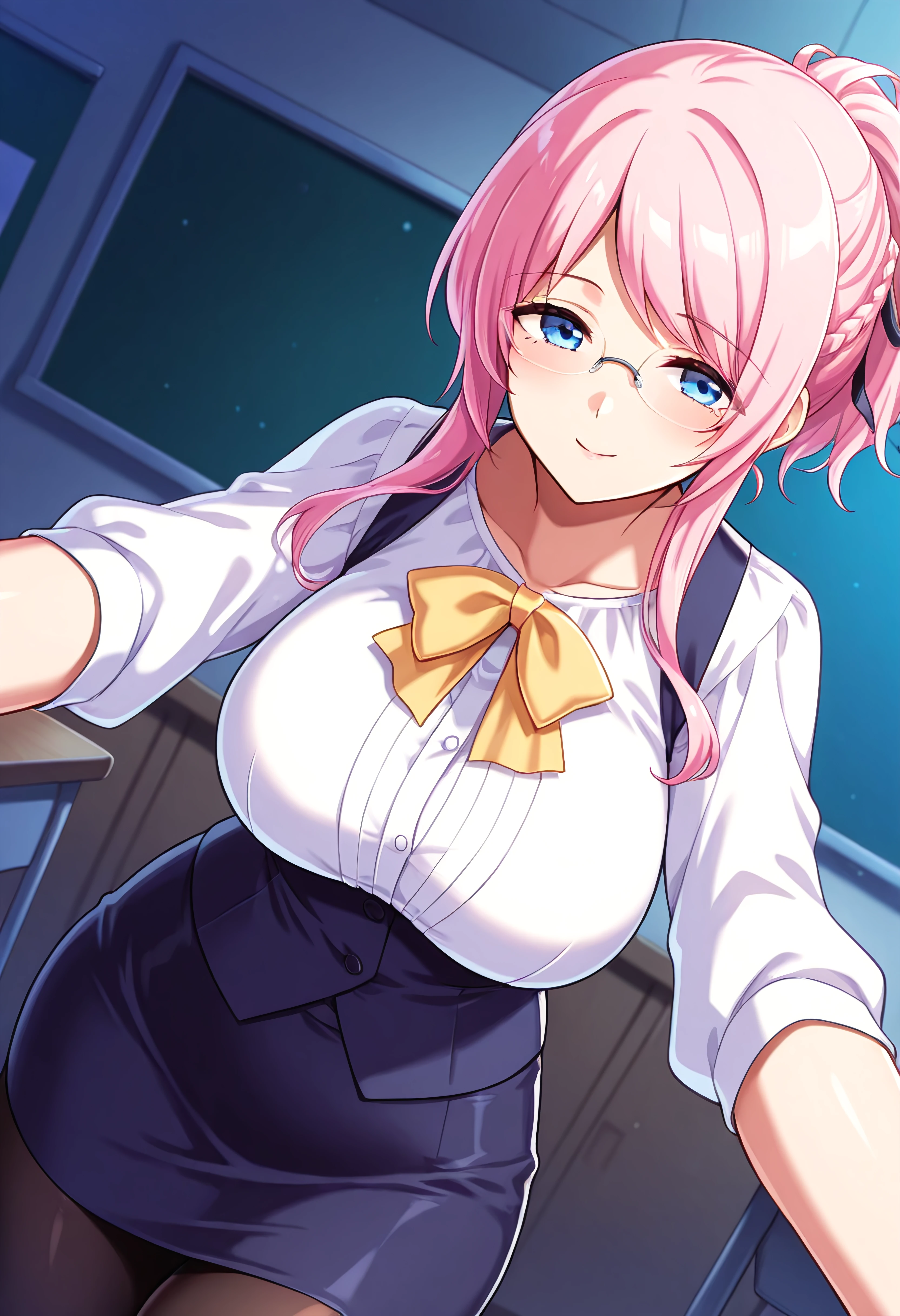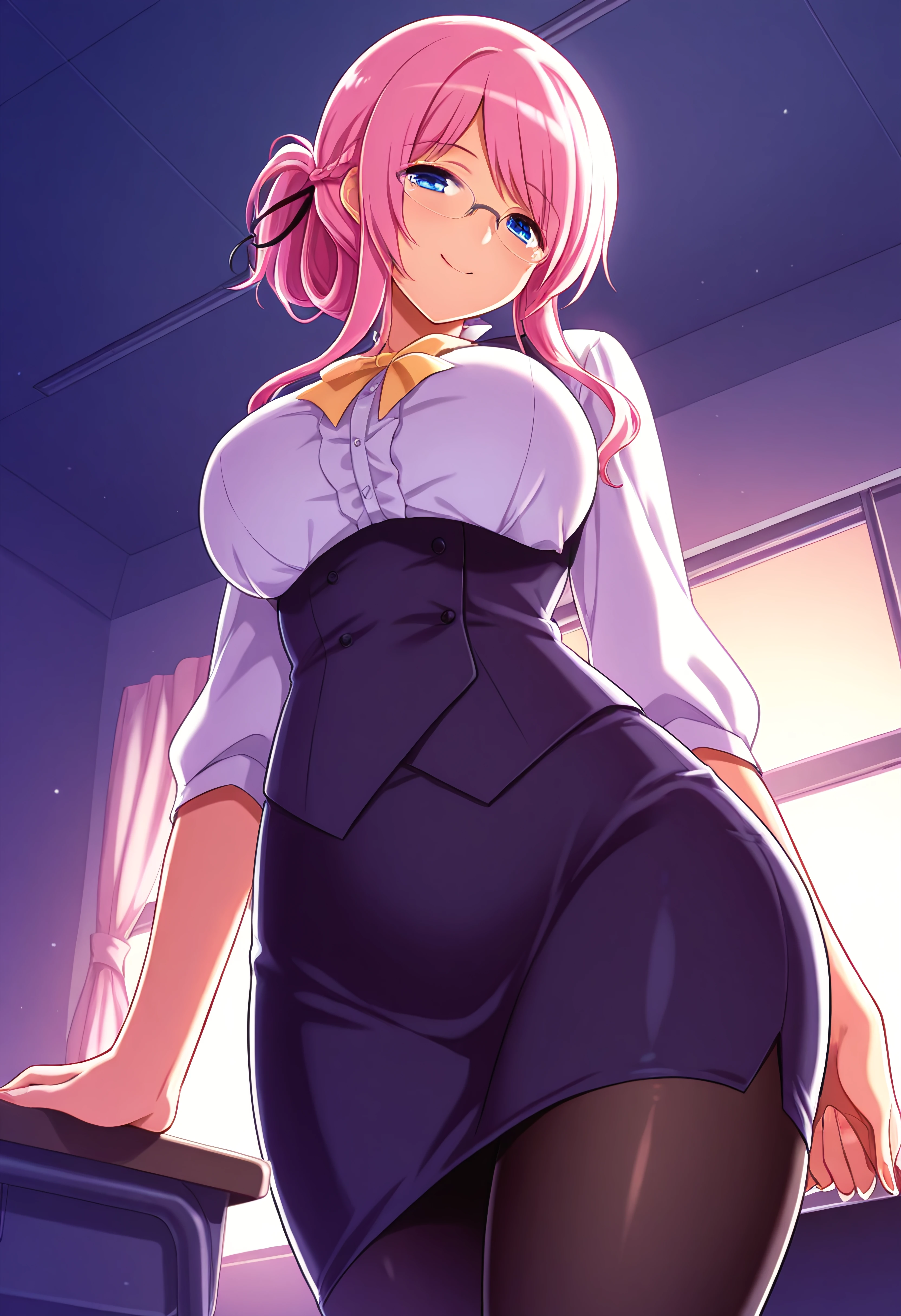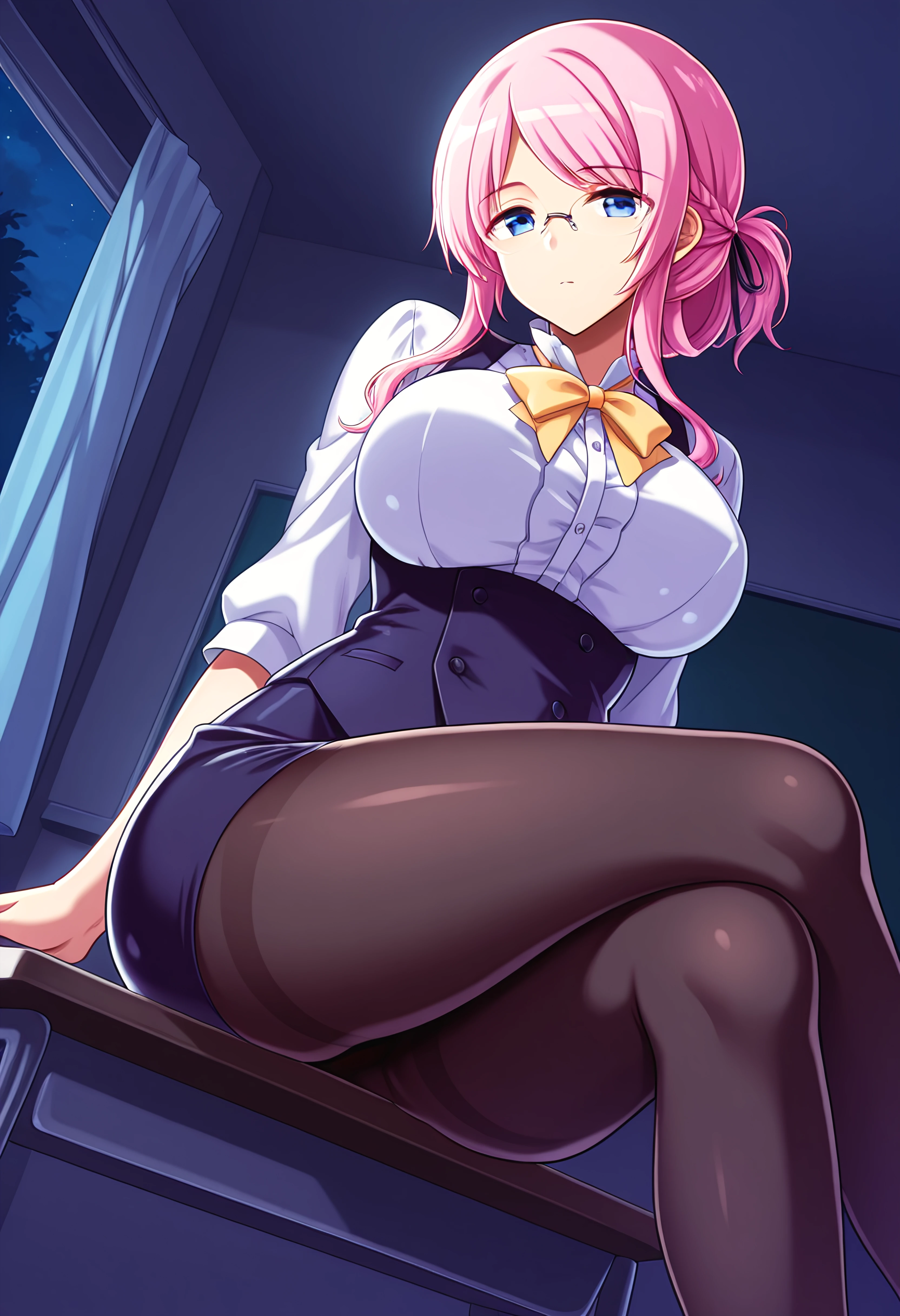 Outfit 1 (Teacher): ponytail, braid, black hair ribbon, glasses, pencil skirt, navy blue vest, white blouse, black pantyhose, yellow bow