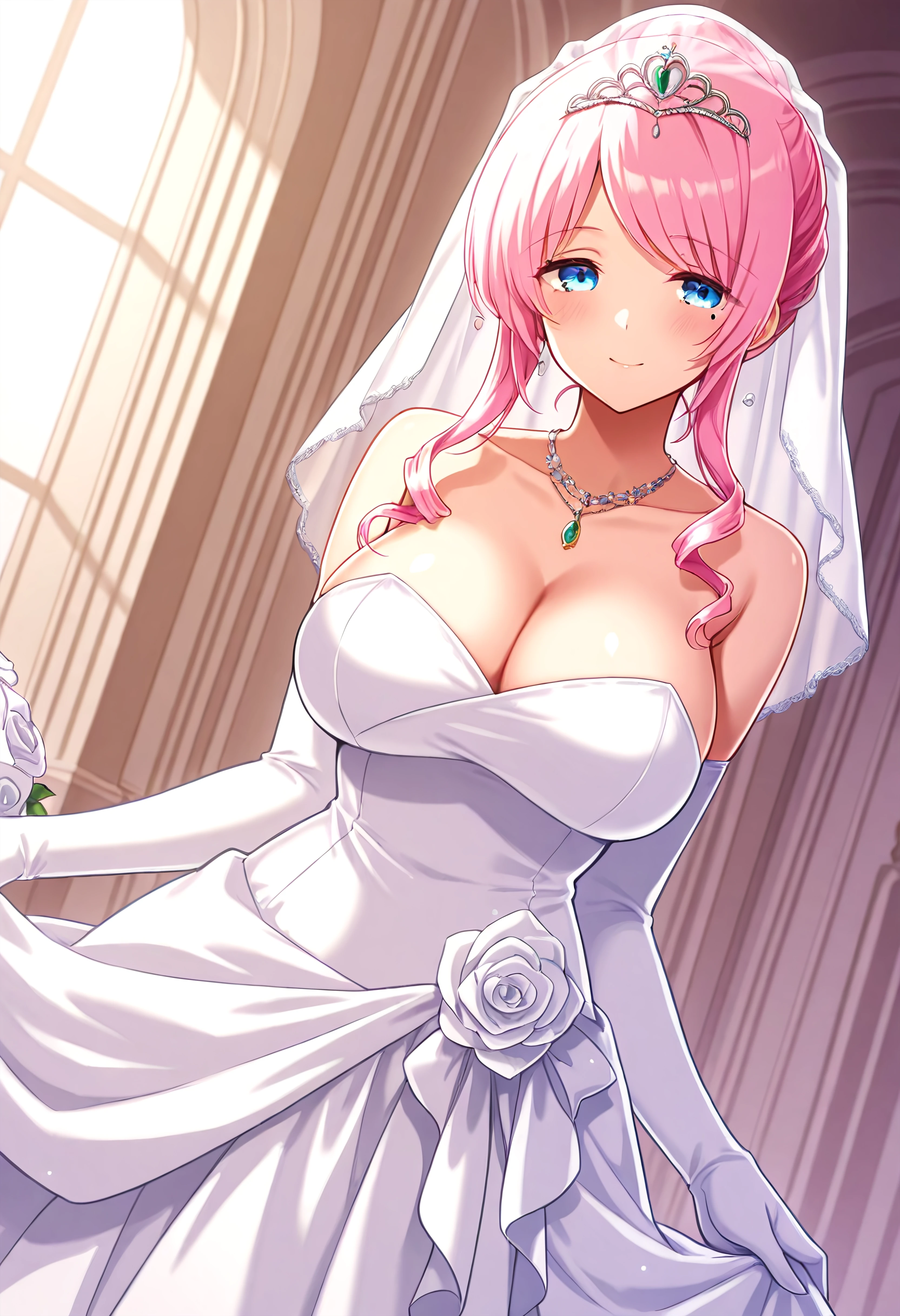 Outfit 5 (Wedding): bare shoulders, yellow tiara with green gem, white veil with black edges, partial drill hair, hair bun, collarbone, bride, white dress, white elbow gloves, white garter belt, white garter straps, white thighhighs, white panties, white high heels