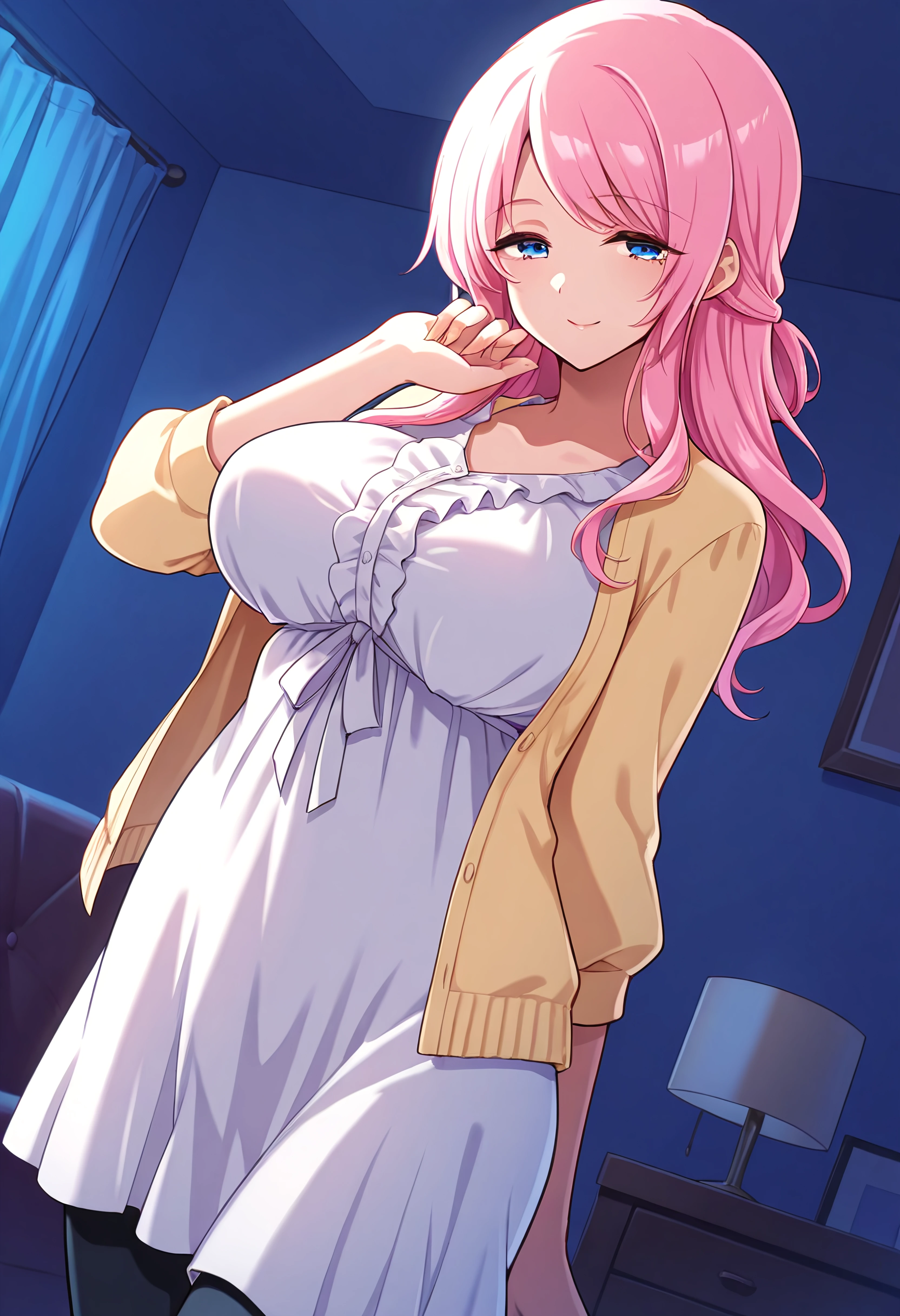 Outfit 2 (Casual): long hair,half updo, black pants, white dress, yellow cardigan with white trim