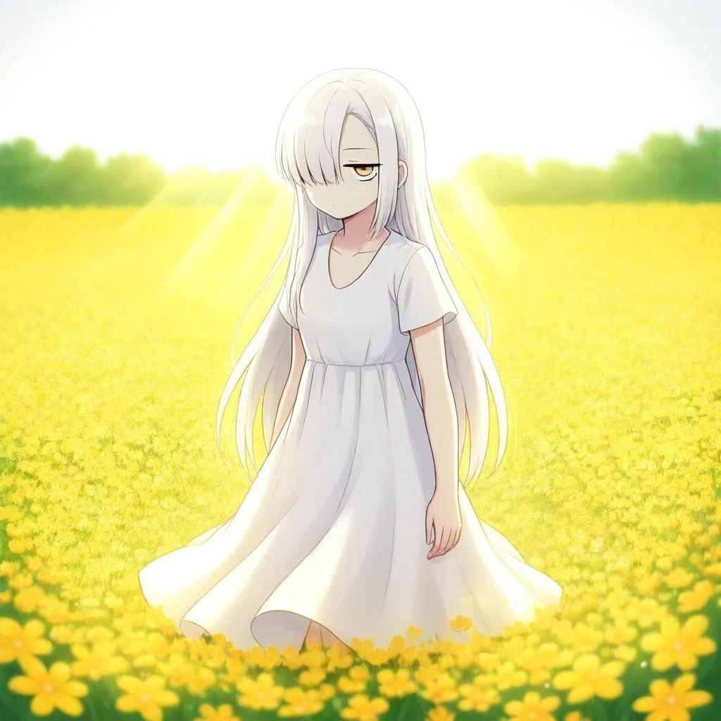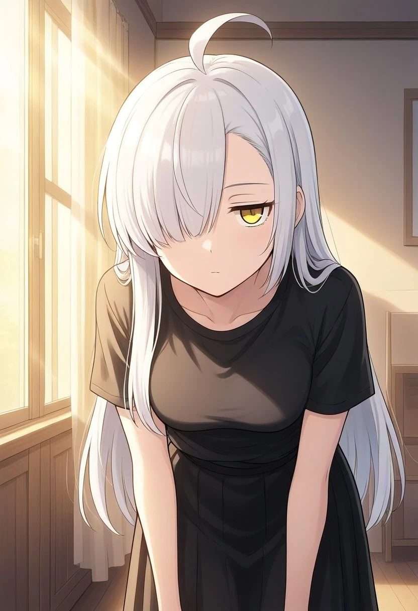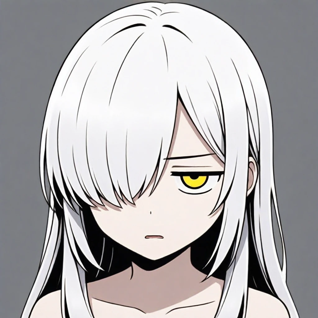 A quiet girl with sleepy golden eyes and very long white hair covering one eye.