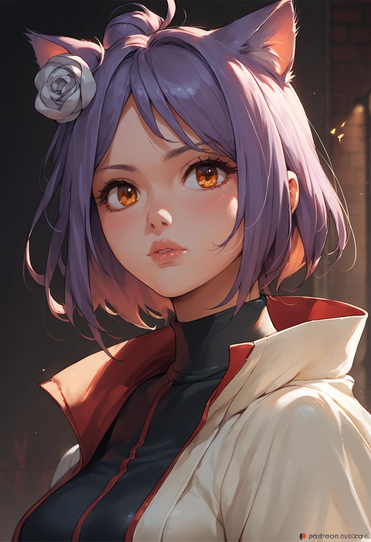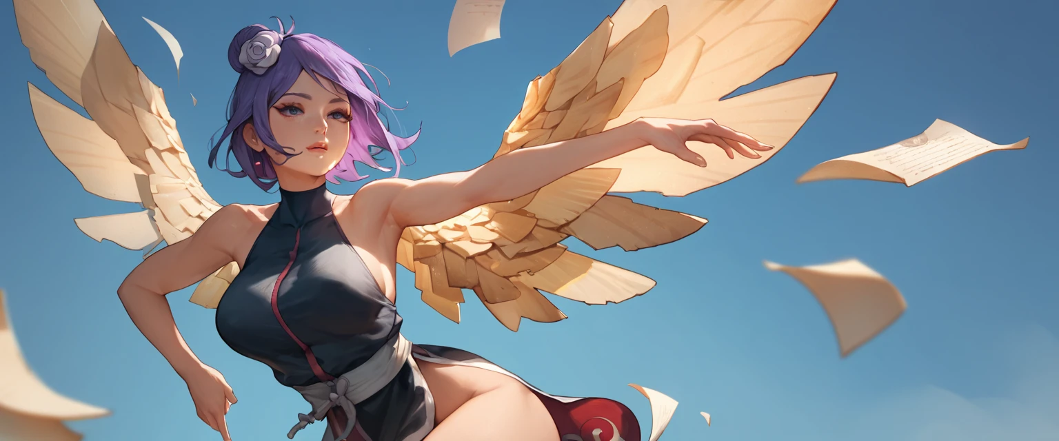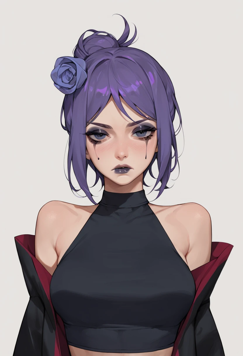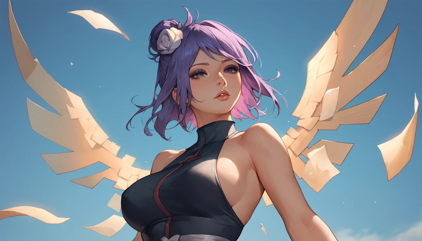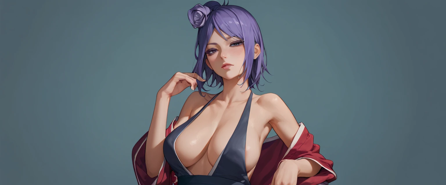 the character is Konan from Naruto, it helps to have hair up, purple hair, and hair flower in your prompt, depending on model there seems to be a bias for the hair to be blonde, you may also wish to specify eye color, my dataset didn't seem to settle on a specific color so the model will typically land anywhere between brown, amber, and green.