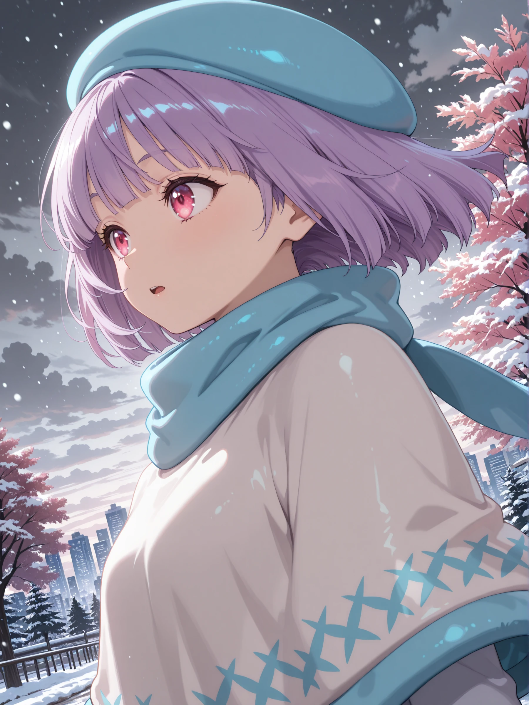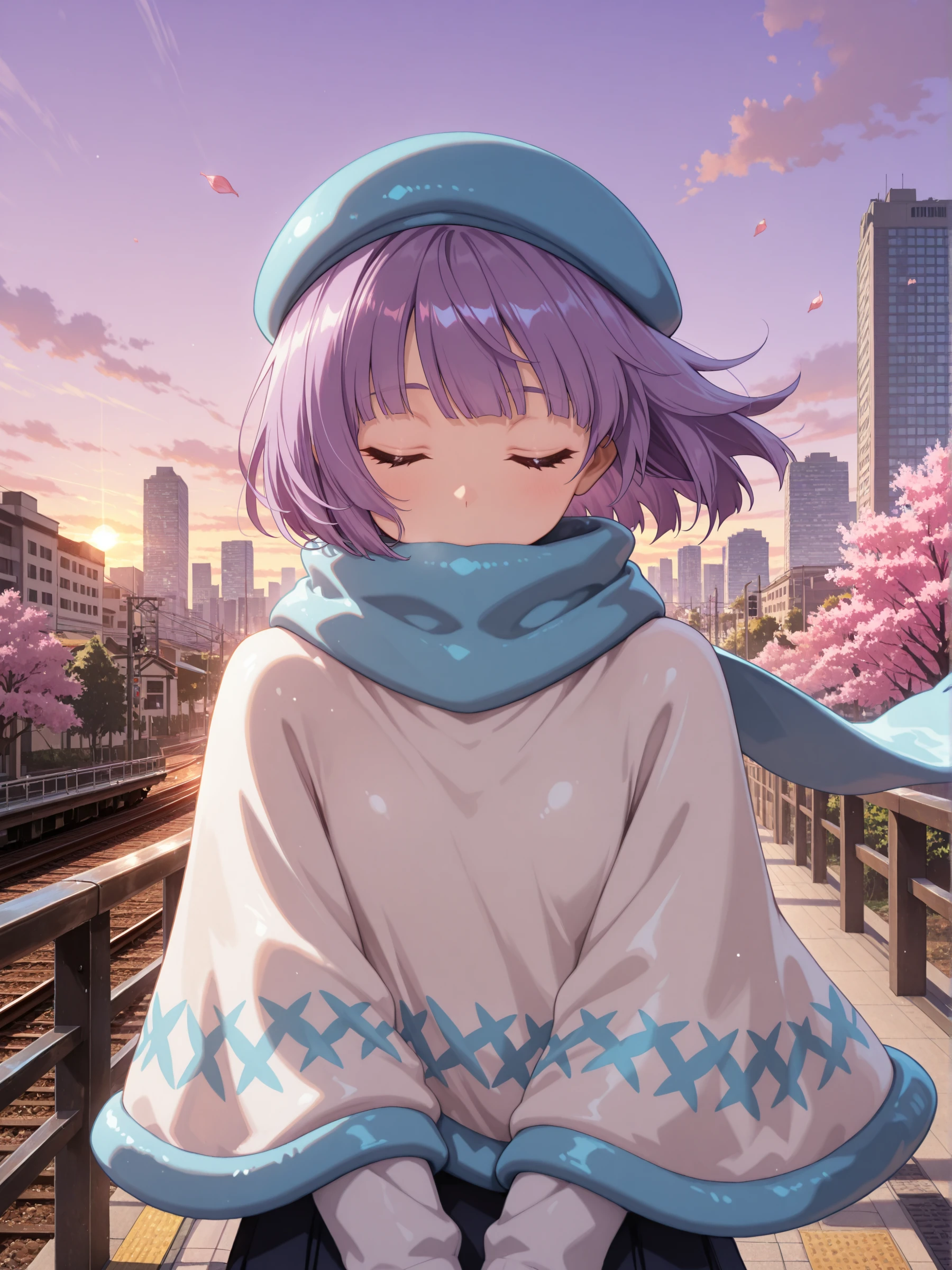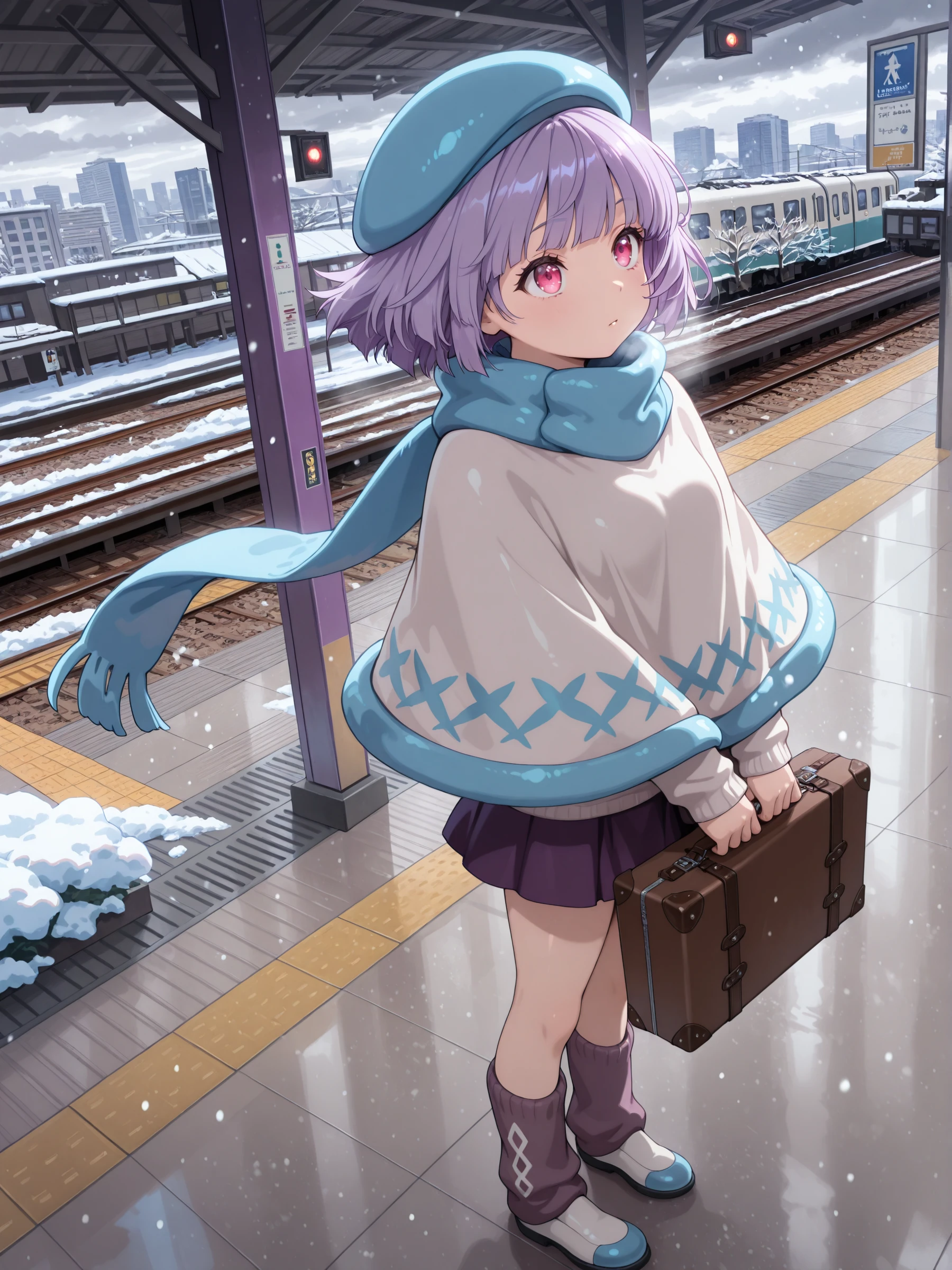 winter clothes, blue beret, blue scarf, scarf over mouth, blue poncho, white poncho, print poncho, white shirt, shirt under poncho, sleeves past wrists, skirt under poncho, purple skirt, miniskirt, leg warmers, purple kneehighs, loose socks, blue shoes, white shoes