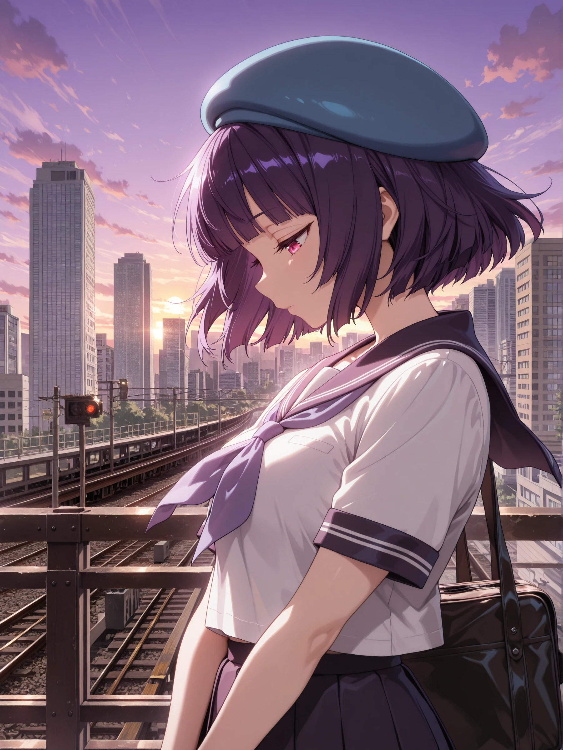 <lora:aretha_djmax_illustrious:1>, arethadjmax, short hair, purple hair, bob cut, blunt bangs, red eyes, pink eyes,