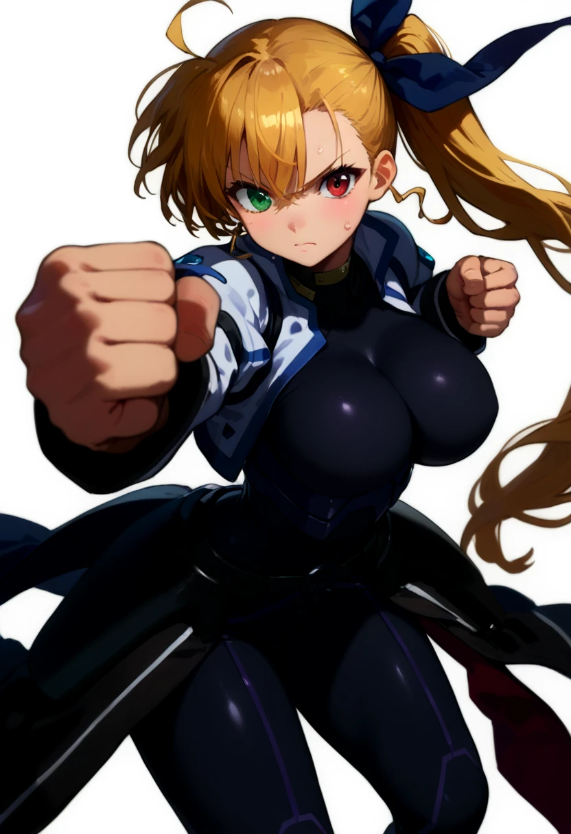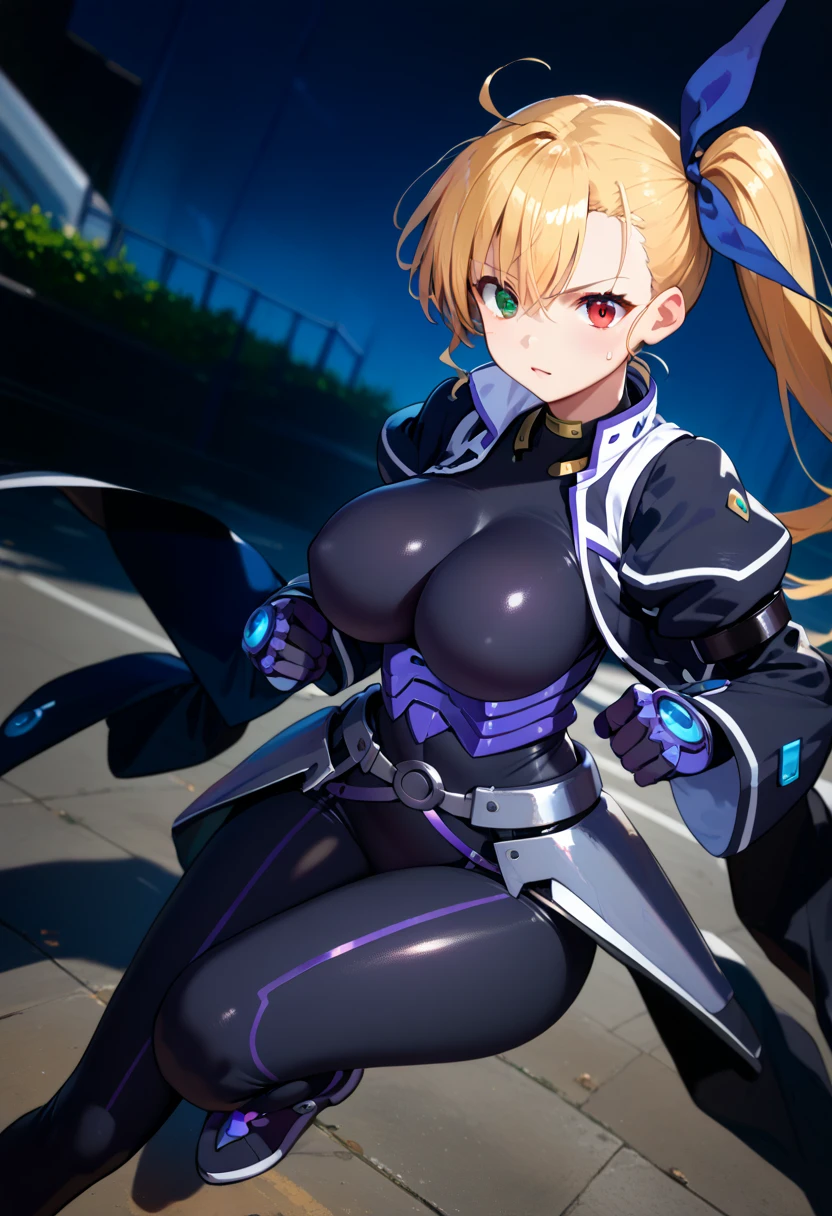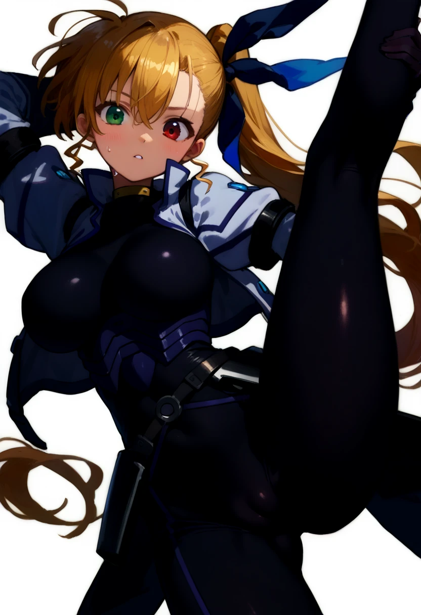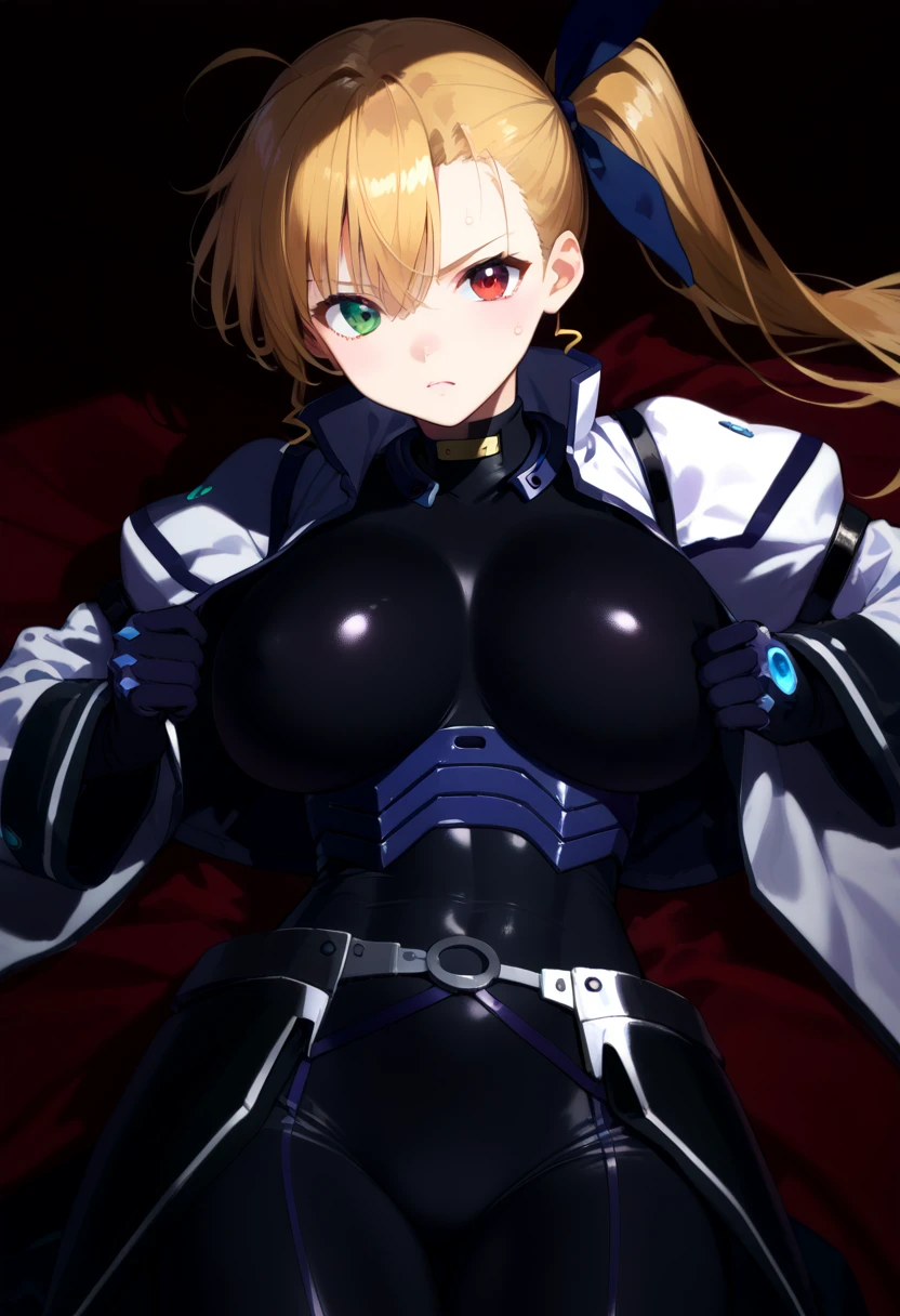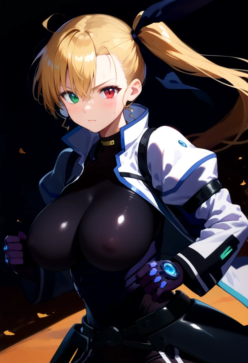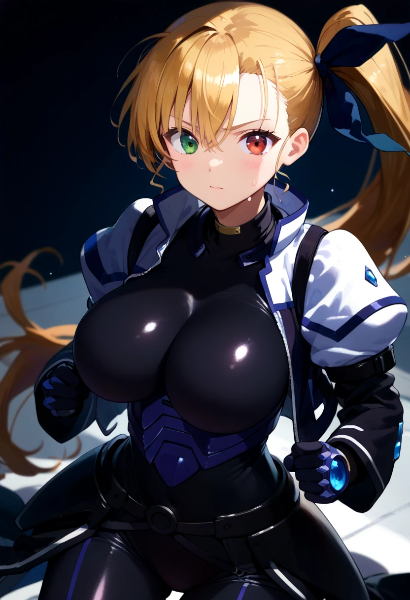 <lora:vivio:1> vivio, blonde hair, side ponytail, heterochromia, green eyes, red eyes, bodysuit, aged up, jacket,hair ribbon, blue ribbon