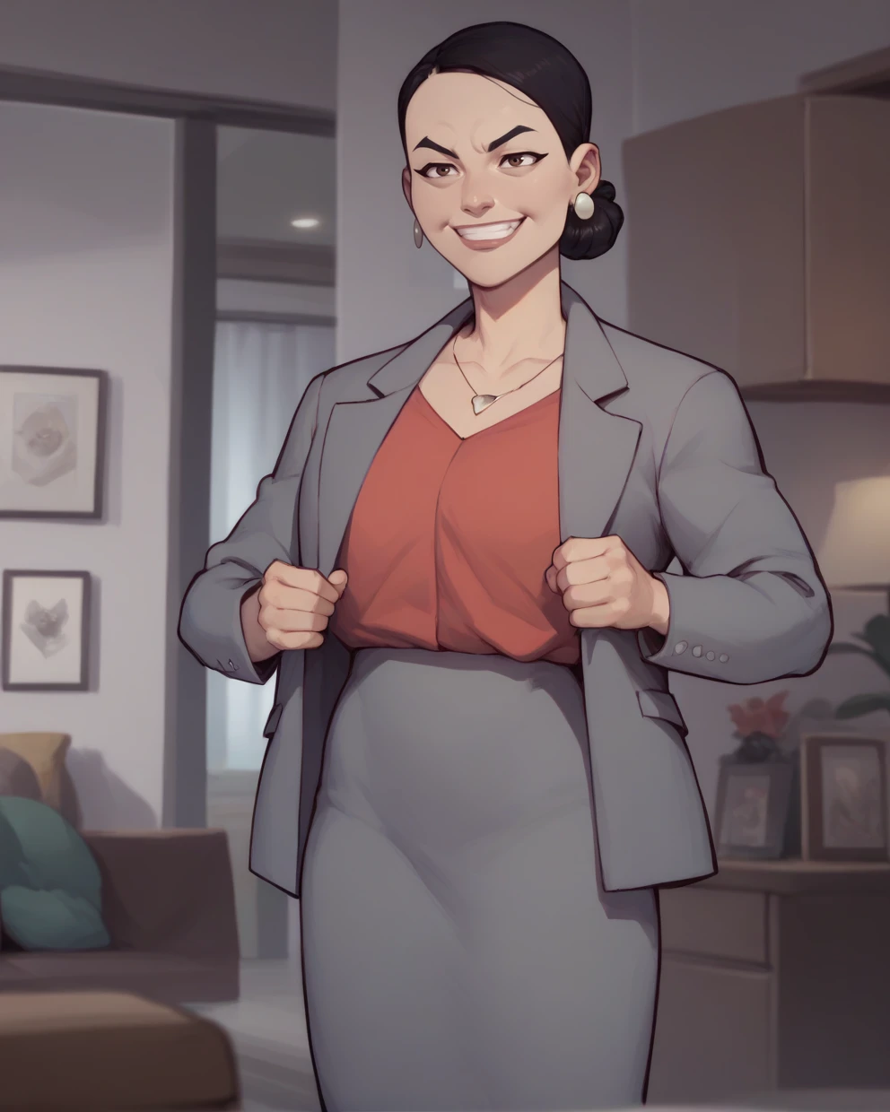 Debbie, brown eyes, or black eyes, hair bun, black hair,