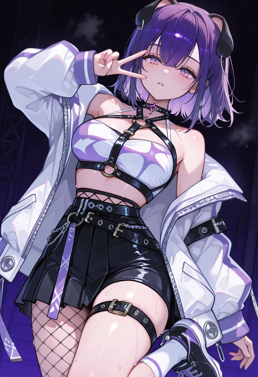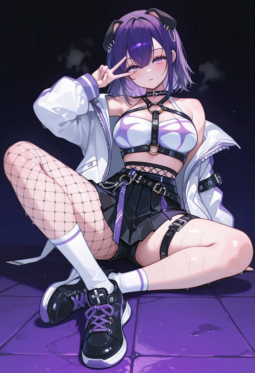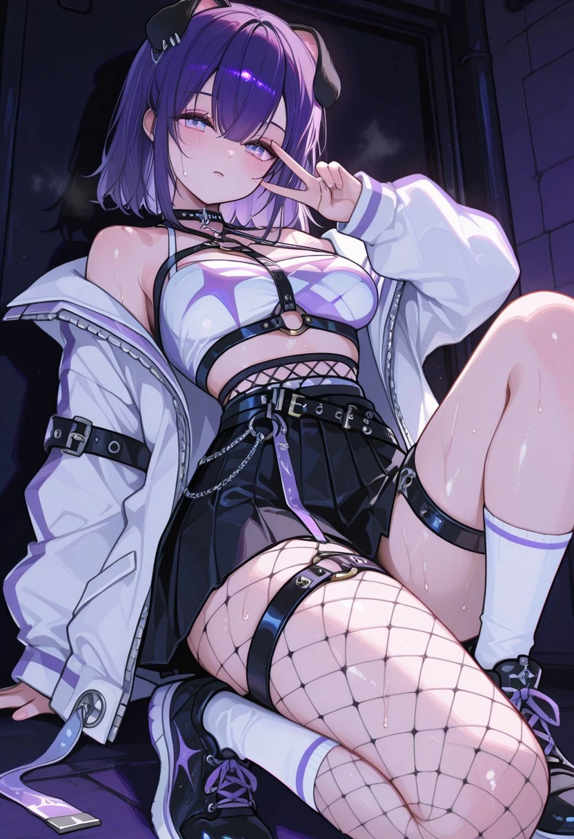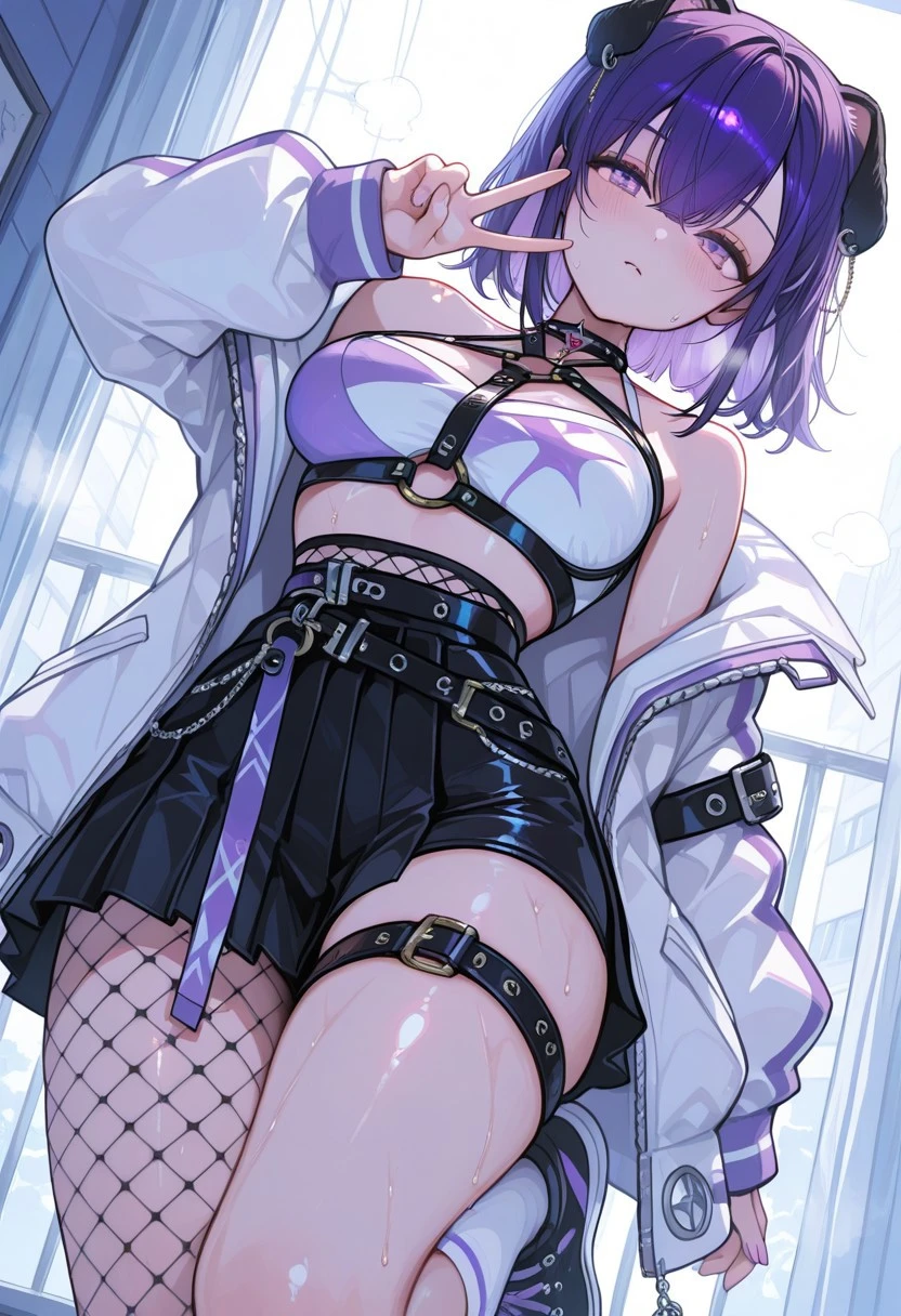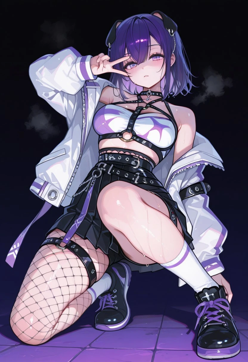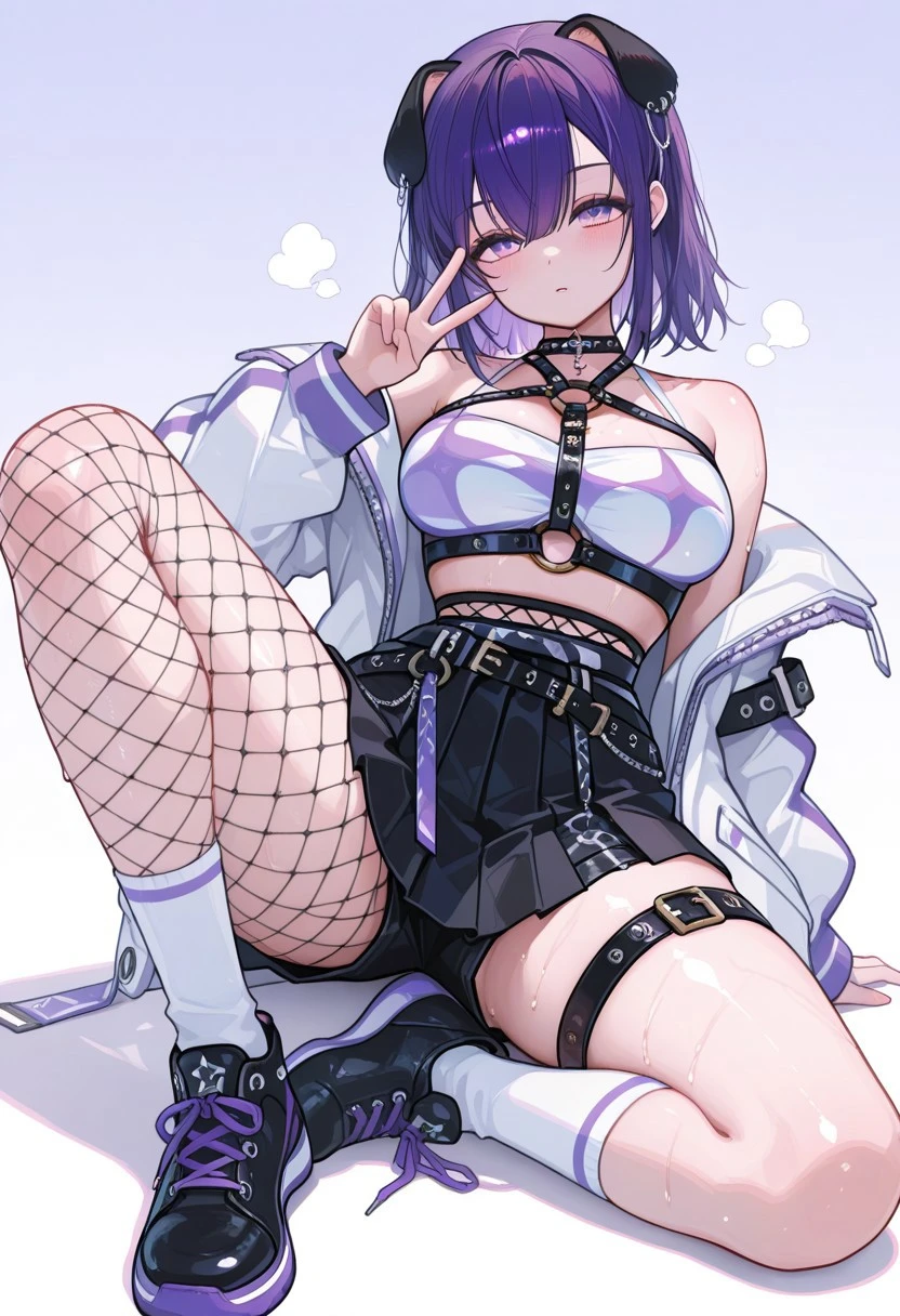 ruka shigure, fishnets, purple hair, black skirt, shoes, white socks, fishnet pantyhose, white jacket, short hair, thigh strap, purple eyes, black footwear, breasts, long sleeves, , off shoulder, bare shoulders, asymmetrical legwear, choker, pleated skirt,o-ring, mole, , belt, sneakers, shorts