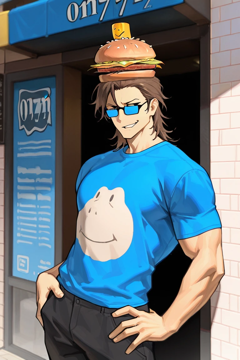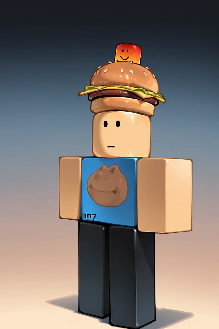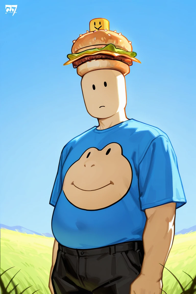 useful tags: 007n7, light skin, burger on head, solid oval black eyes, blue shirt with logo, black pantsthis one also didnt came out that great but maybe i was just bad at prompting the example images, you can give him hair if you want and make him more humanoid, or choose for him to be blocky, all depends on how you tag