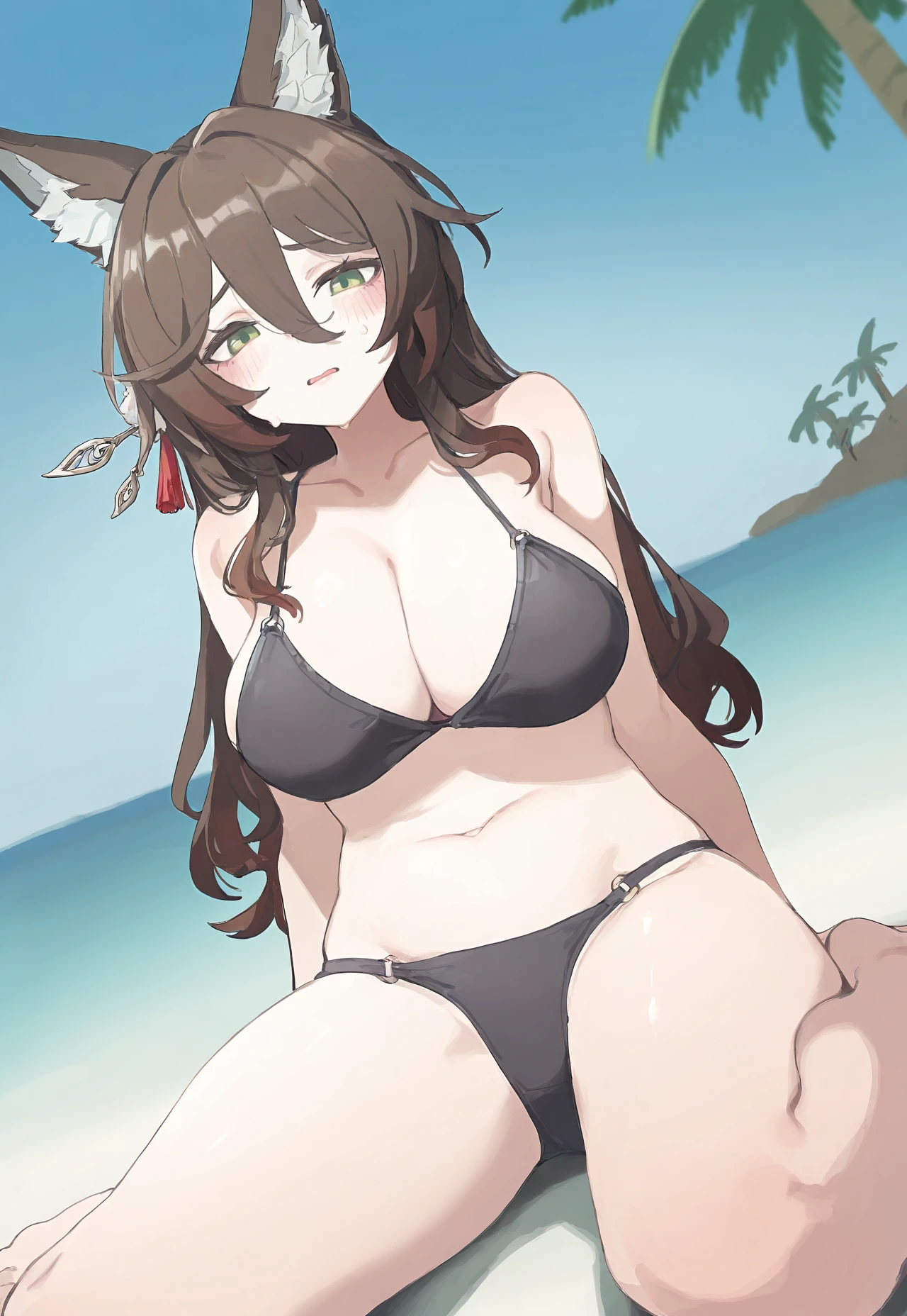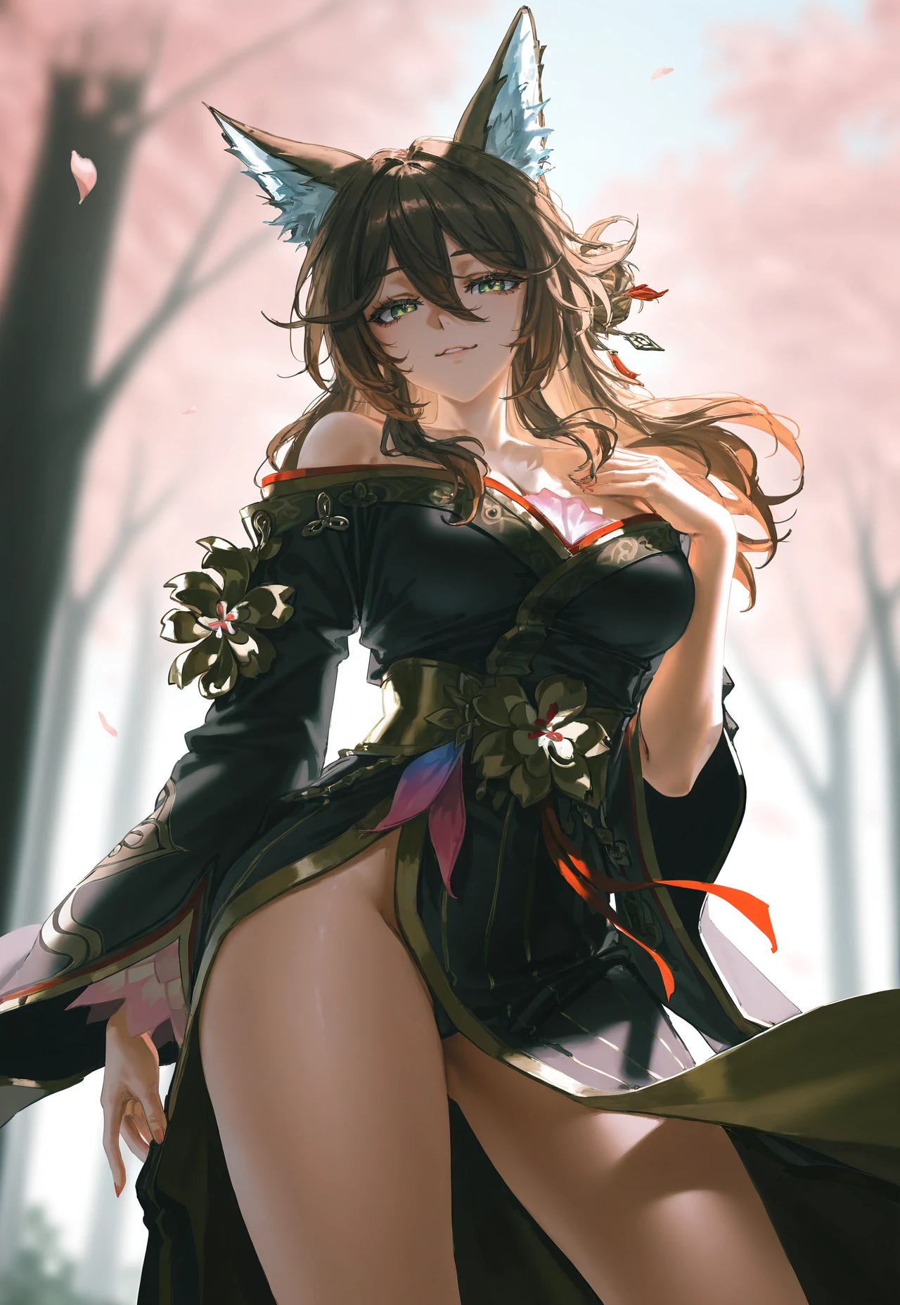 fugue (honkai: star rail), brown hair, animal ear fluff, hair ornament, green eyes,