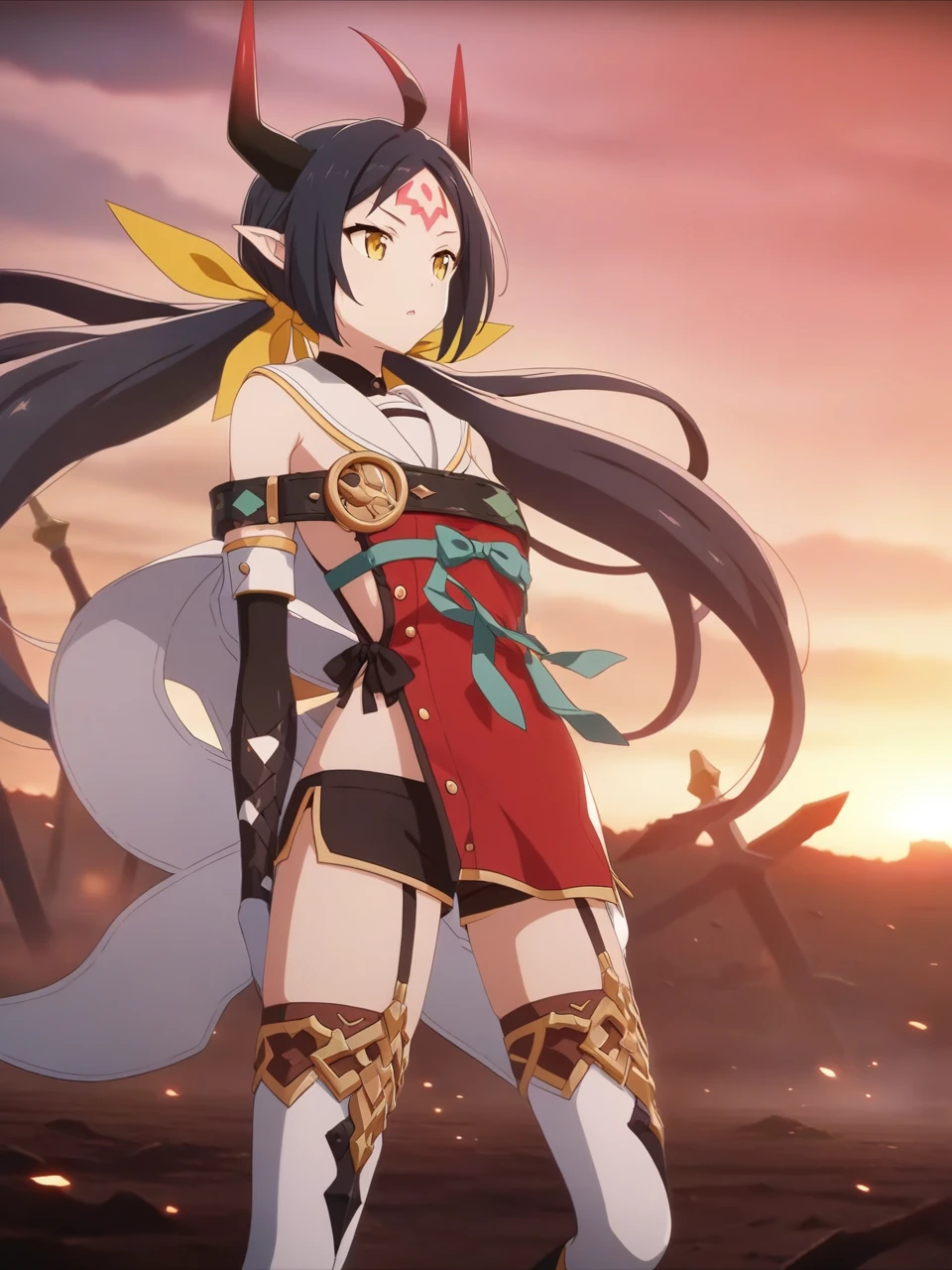 dsaravi, black hair, yellow eyes, pointy ears, very long hair, twintails, ahoge, horns, forehead mark, hair ribbon, red tabard, chest belt, elbow gloves, thighhigh boots, black shorts