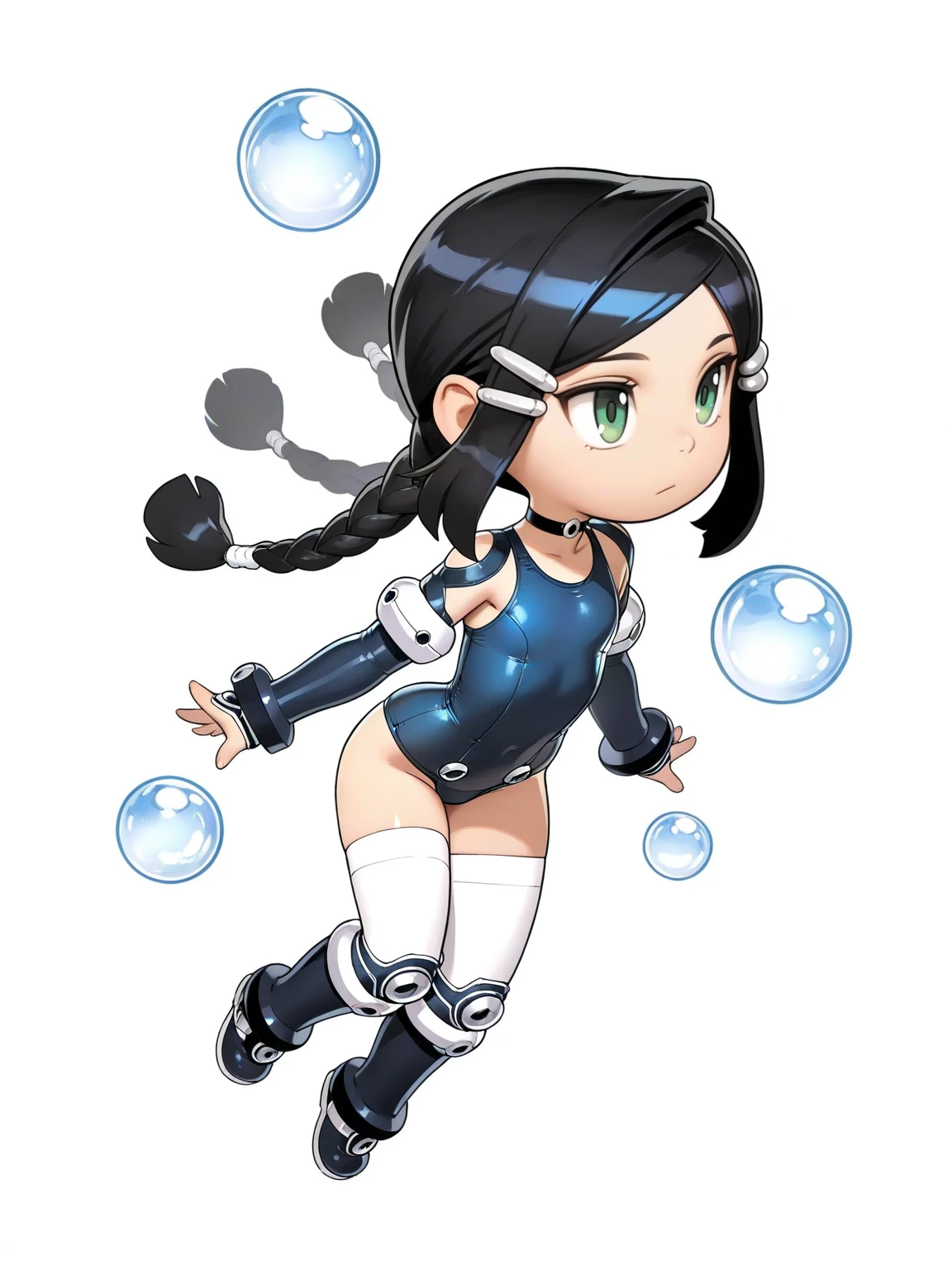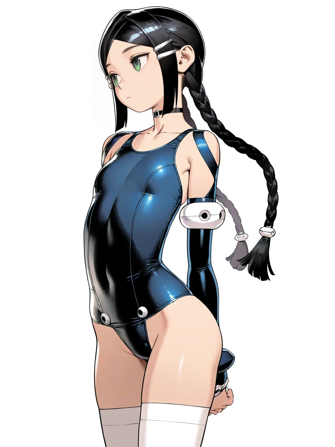 sjgojou, hairclips, black hair, green eyes, twin braids, choker, arm sleeves, one-piece swimsuit, thighhighs, flat chest