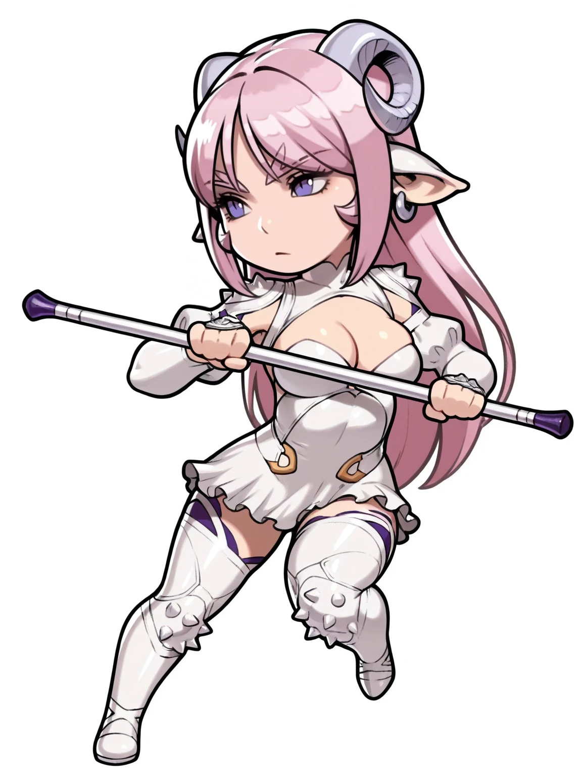 sjhakkai, long hair, pink hair, purple eyes, earrings, pointy ears, horns, shoulder spikes, cleavage, miniskirt, thighhighs, huge breasts