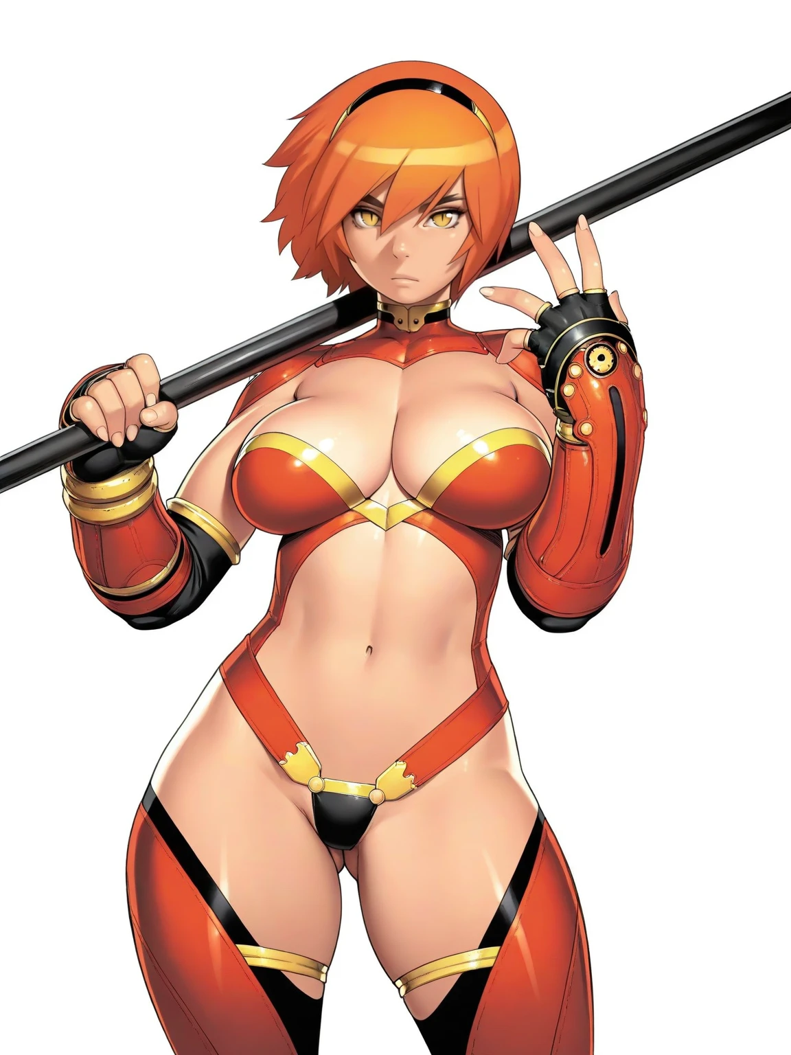 sjgoku, short hair, red hair, pointy ears, slit pupils, yellow eyes, hairband, bikini armor, fingerless gloves, thigh boots, large breasts