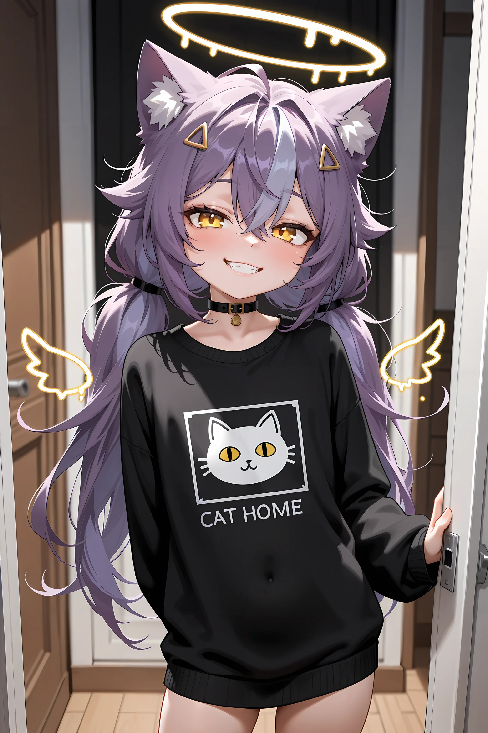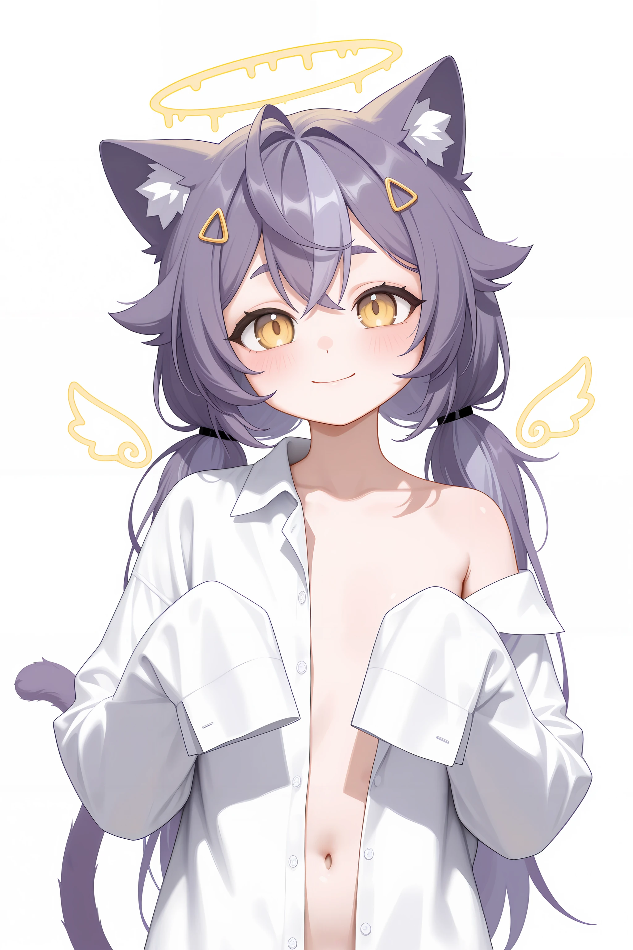 1girl,bangs,purple hair,long hair,yellow eyes,hair ornament,cat ears,tail,halo,twintails,flat chest,outfit: