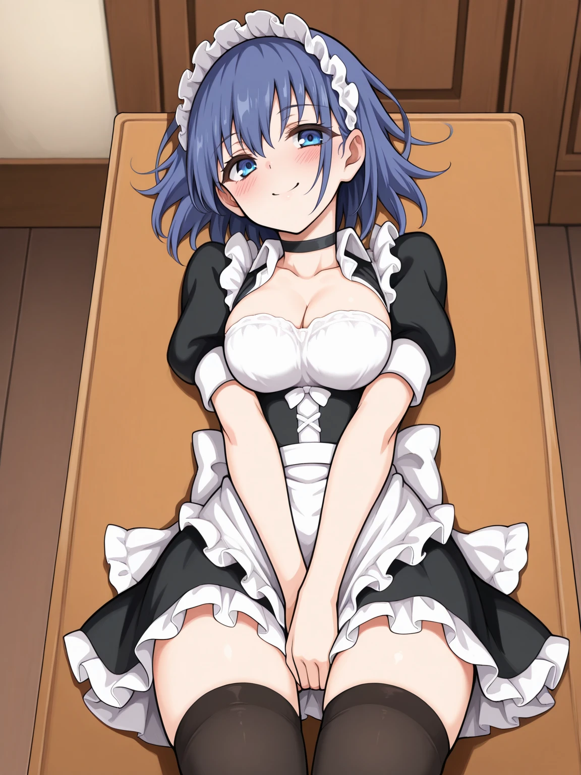 Maid: maid uniform, cleavage, maid headdress, maid apron, puffy short sleeves, black corset, short skirt, black thighhighs, black choker