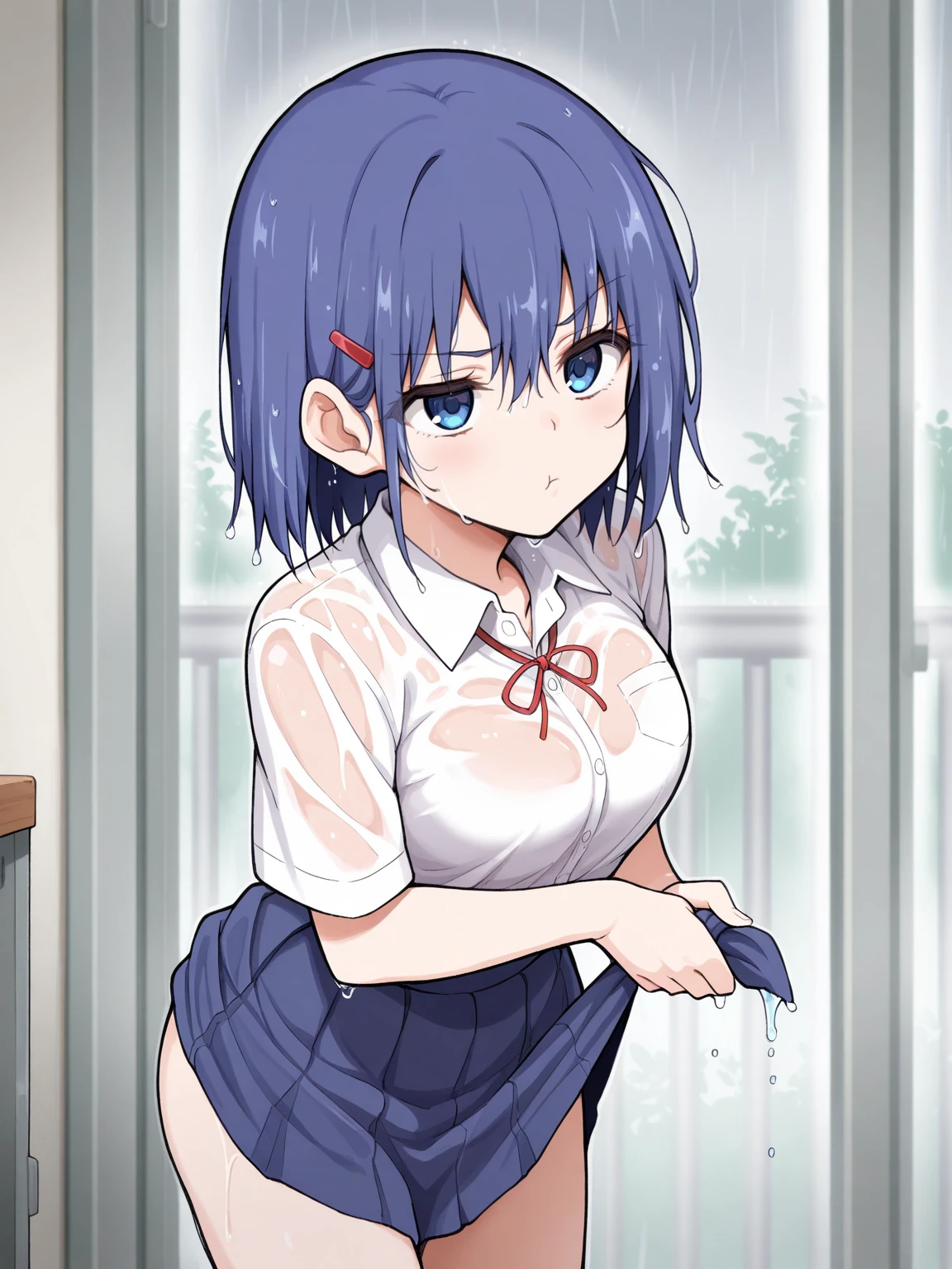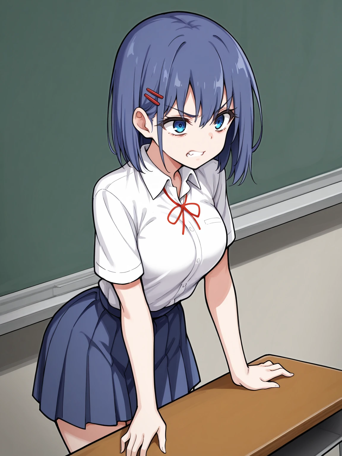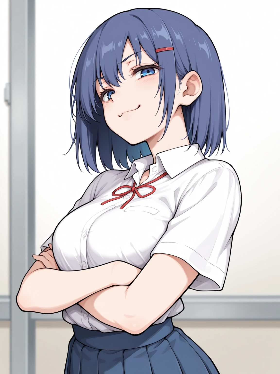 red hairclip, school uniform, white shirt, collared shirt, short sleeves, blue skirt, pleated skirt, red ribbon