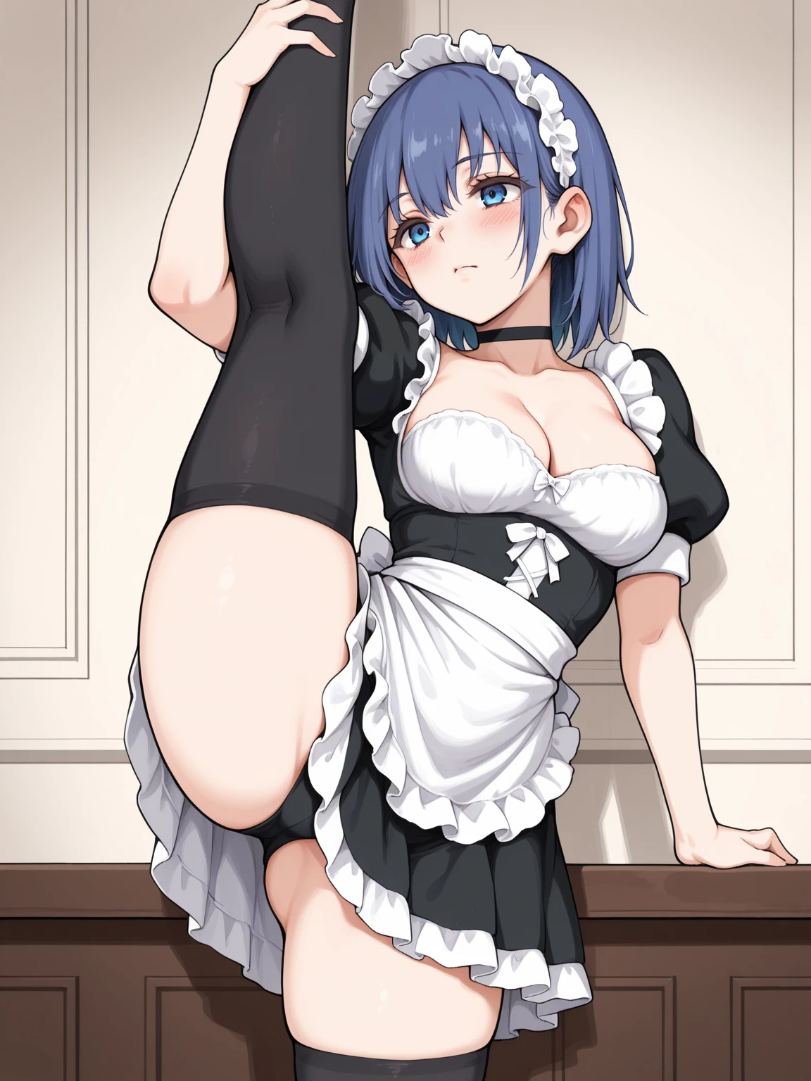 maid uniform, cleavage, maid headdress, maid apron, puffy short sleeves, black corset, short skirt, black thighhighs, black choker