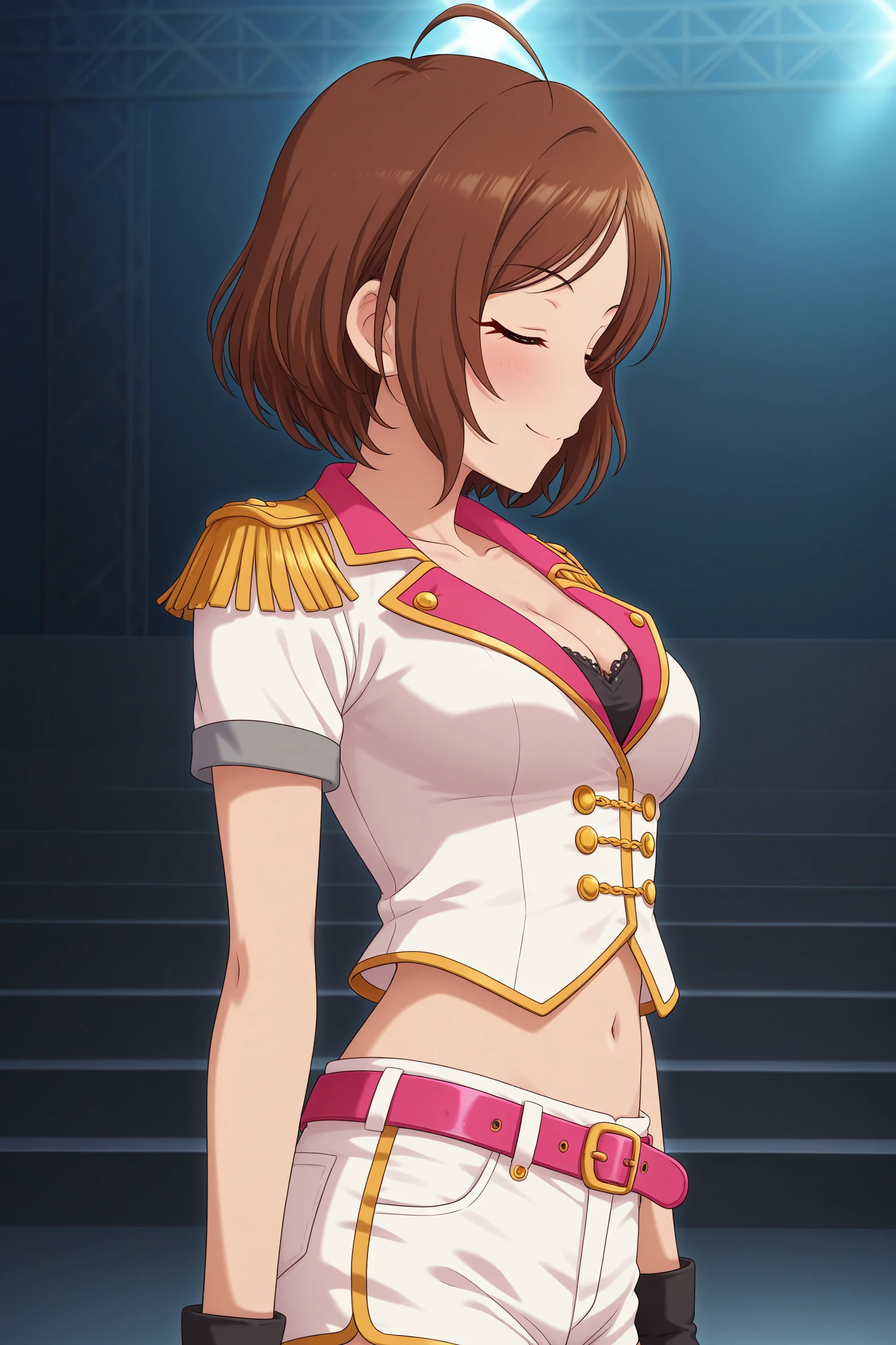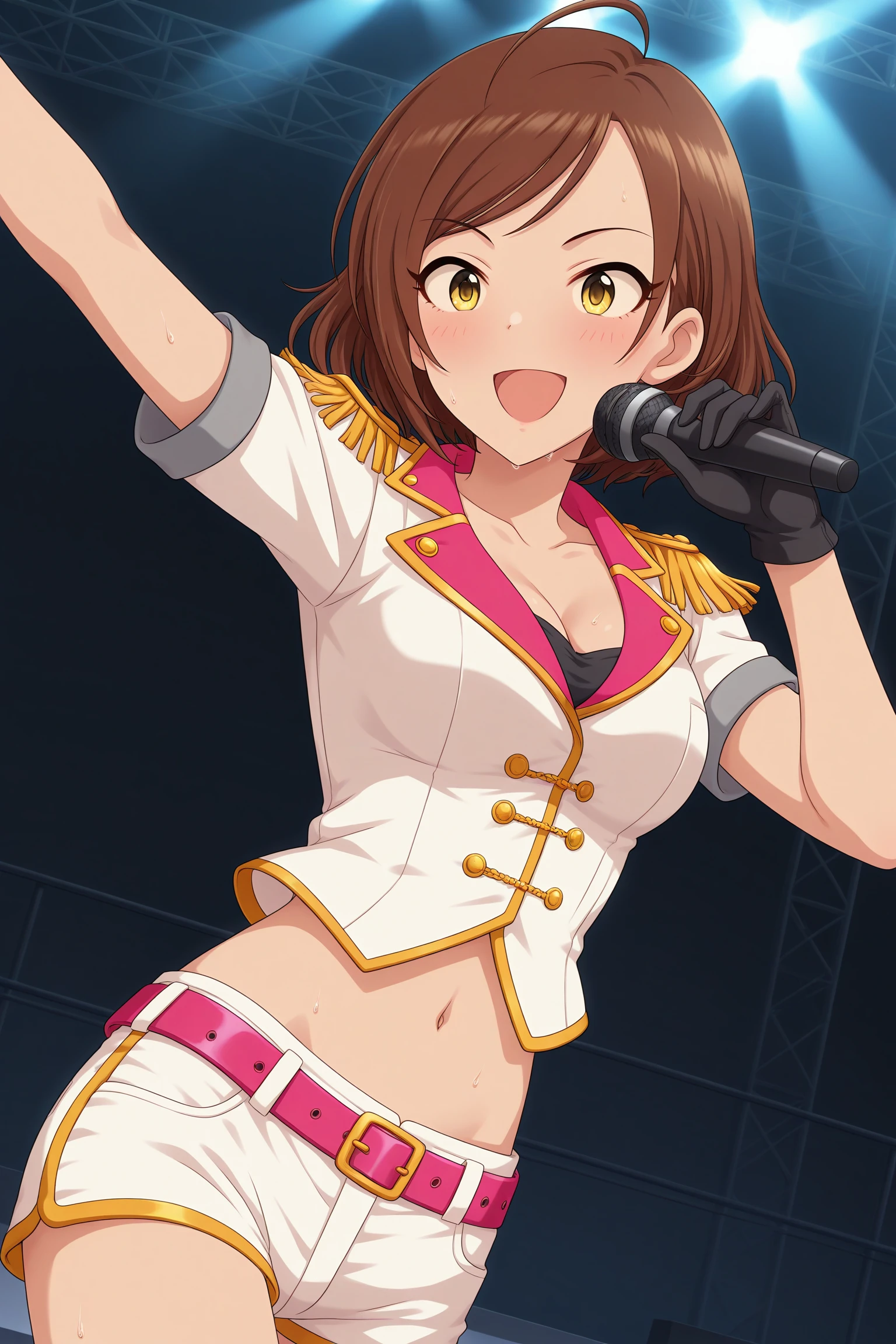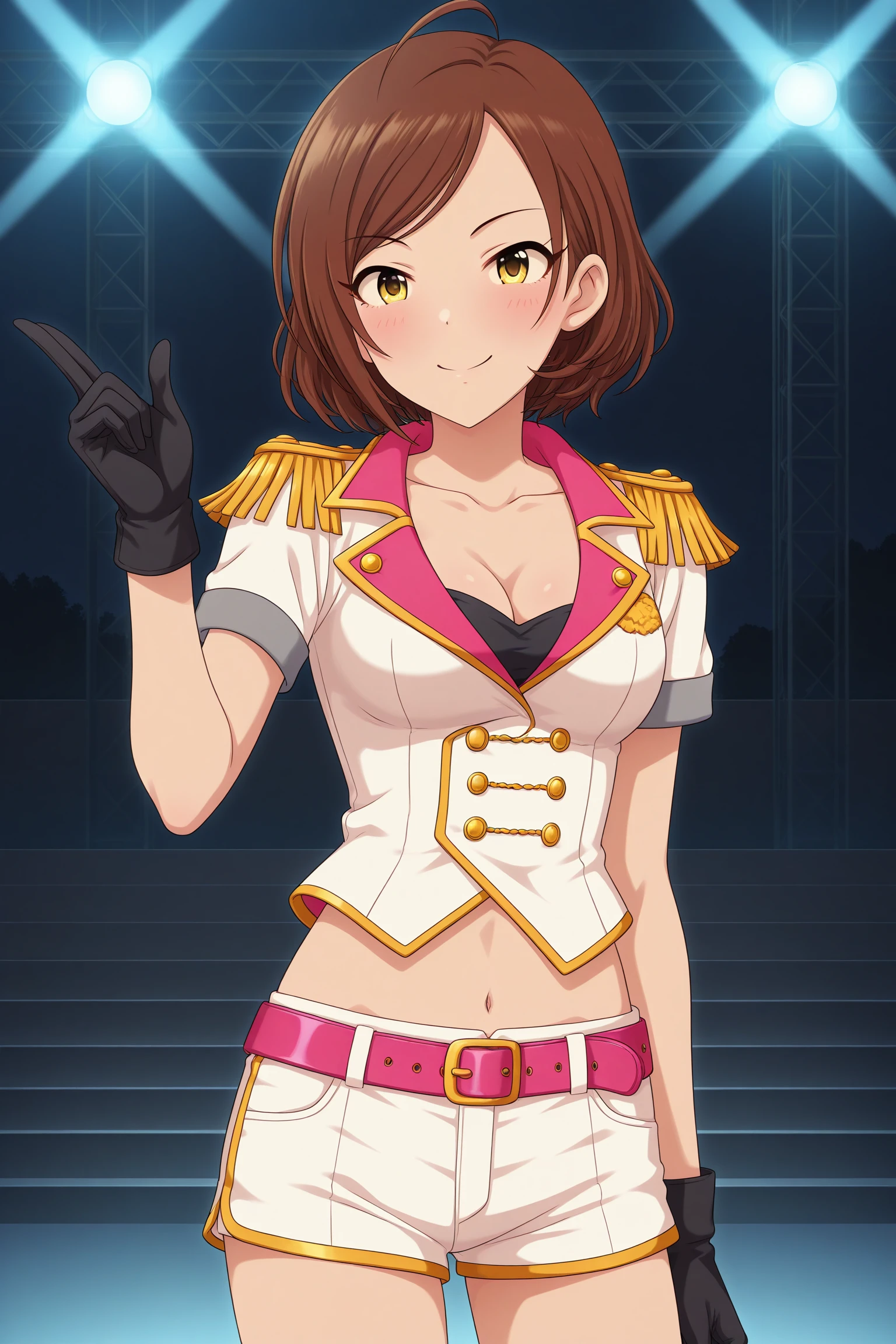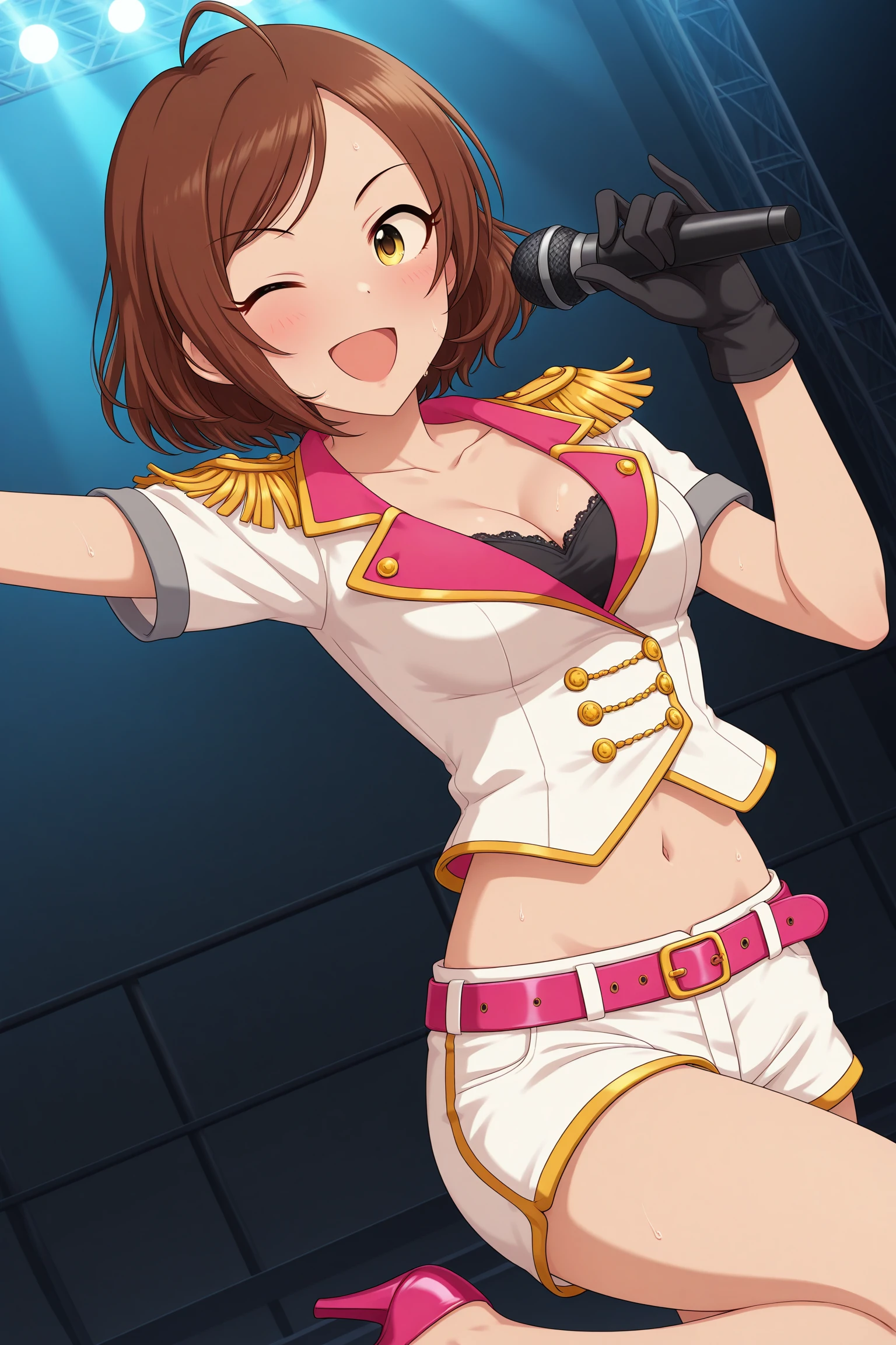 im yujin, brown hair, short hair, ahoge, yellow eyes, long eyelashes, idolmaster cinderella girls, short sleeves, grey sleeve ends, white midriff, pink two-way collar, gold epaulettes, cleavage, collarbone, navel, shorts, short shorts, white shorts, pink belt, black gloves, pink footwear, high heelsDescription