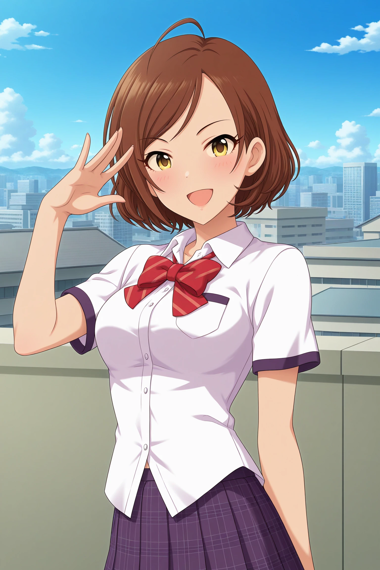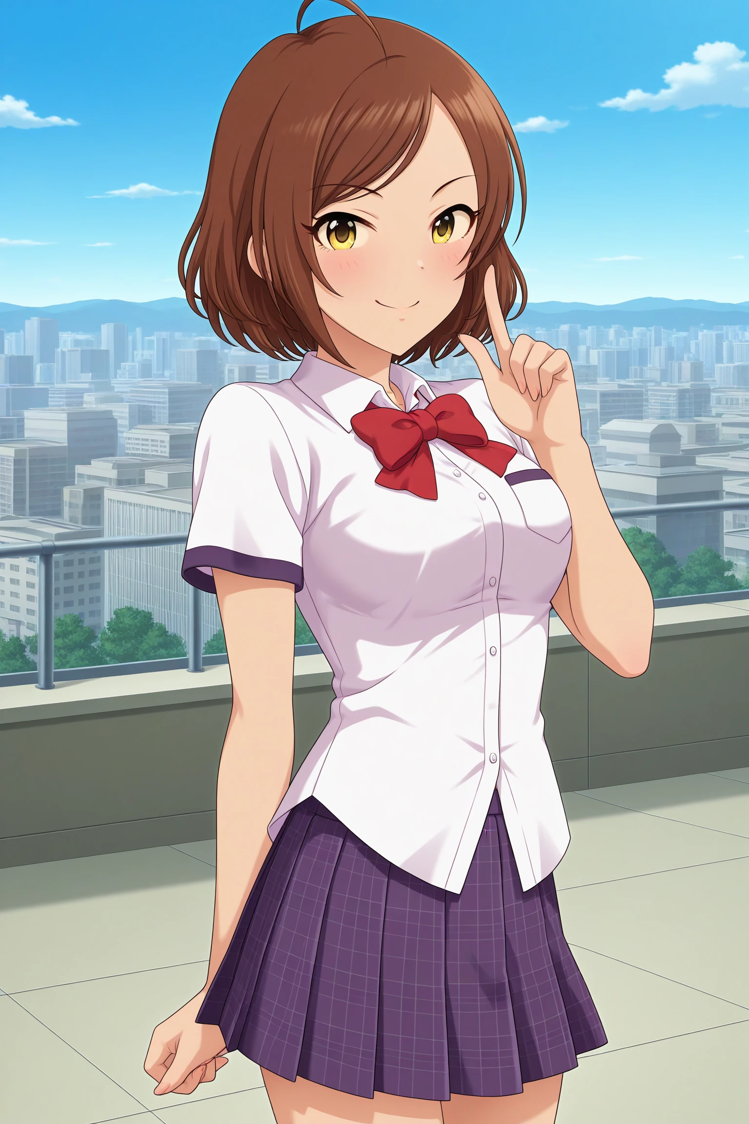 im yujin, brown hair, short hair, ahoge, yellow eyes, long eyelashes, idolmaster cinderella girls, school uniform, short sleeves, purple sleeve ends, white shirt, collared shirt, breast pocket, red bowtie, untucked shirt, purple skirt, plaid skirt, pleated skirt, miniskirt