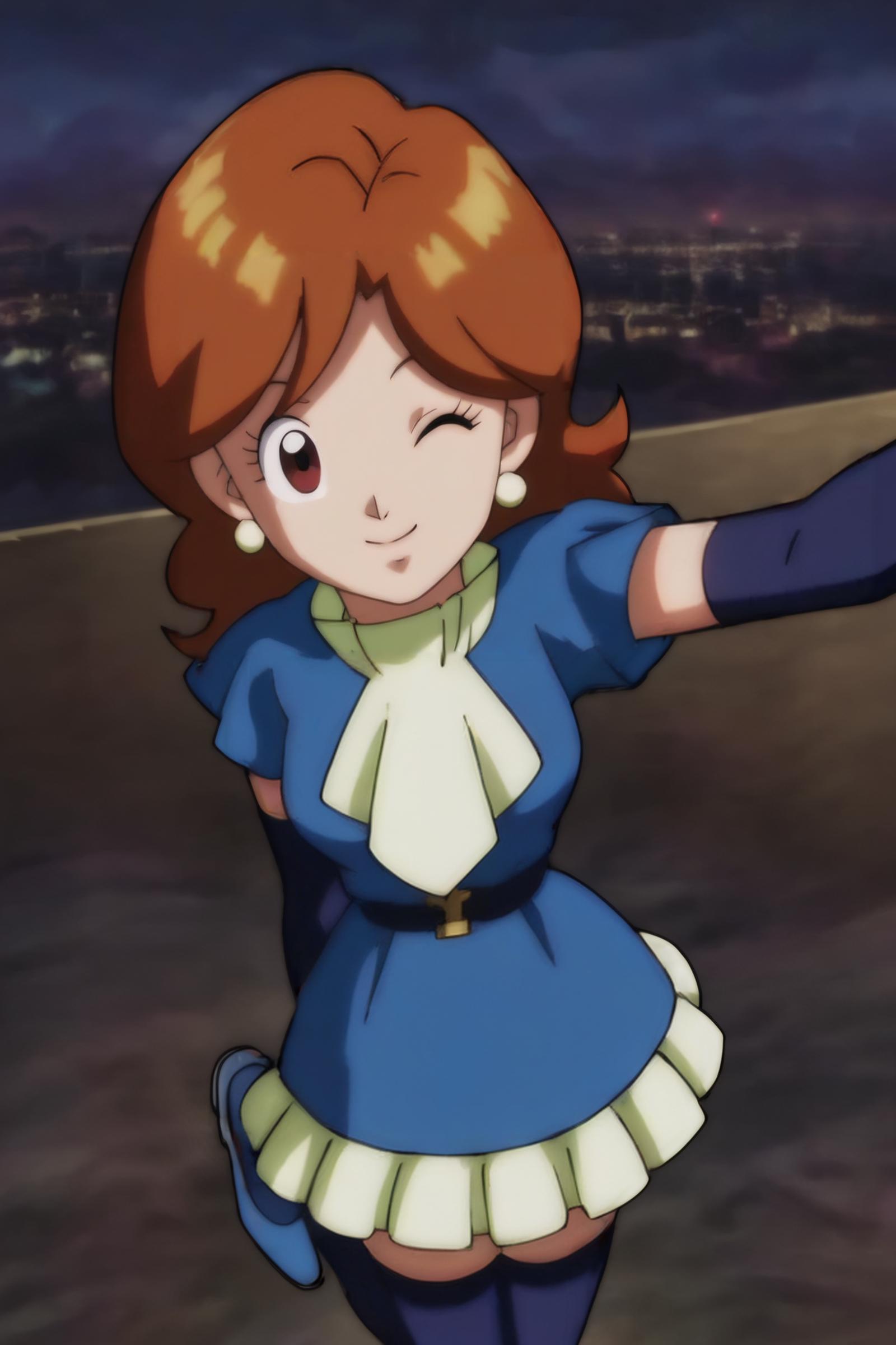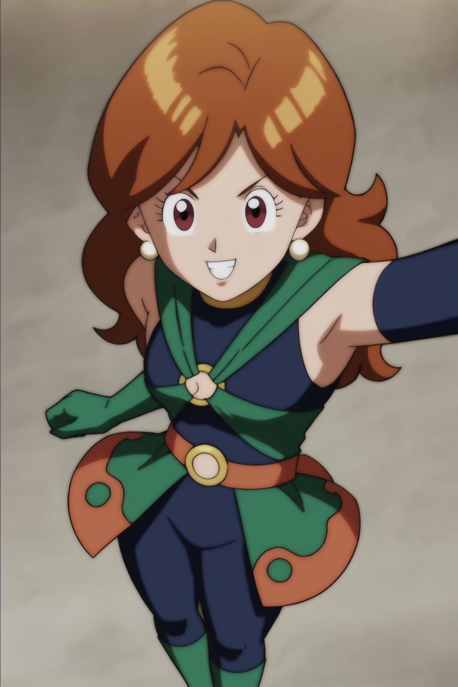 domino mask, blue bodysuit, chest belt, blue mask, green skirt, green gloves, gold choker, orange belt, open skirt, multicolored skirt, sleeveless bodysuit, boots, green footwear,