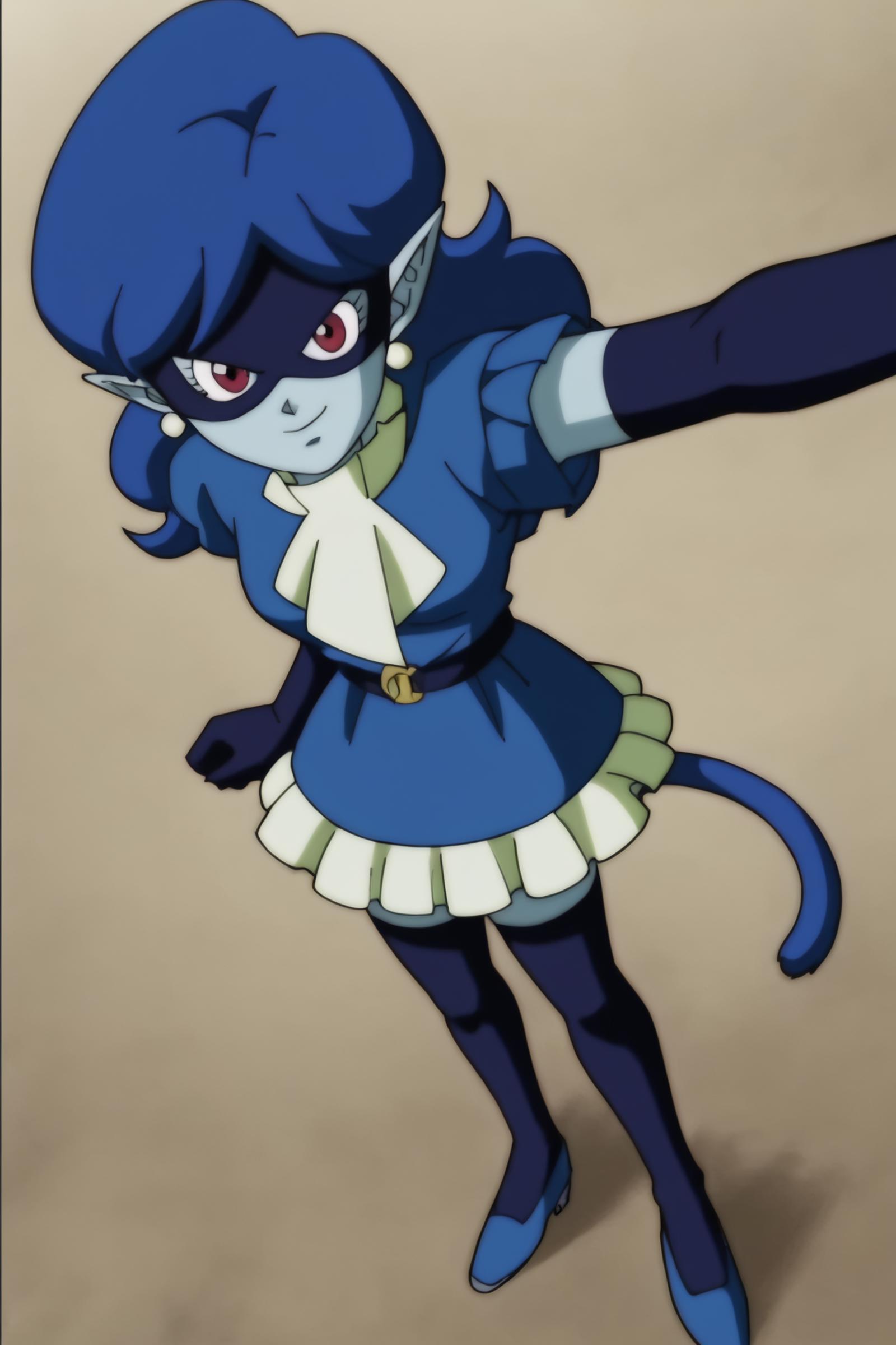 sanka coo, kakunsa, blue hair, cat tail, blue tail, blue skin, messy hair, long hair, pointy ears, red eyes,