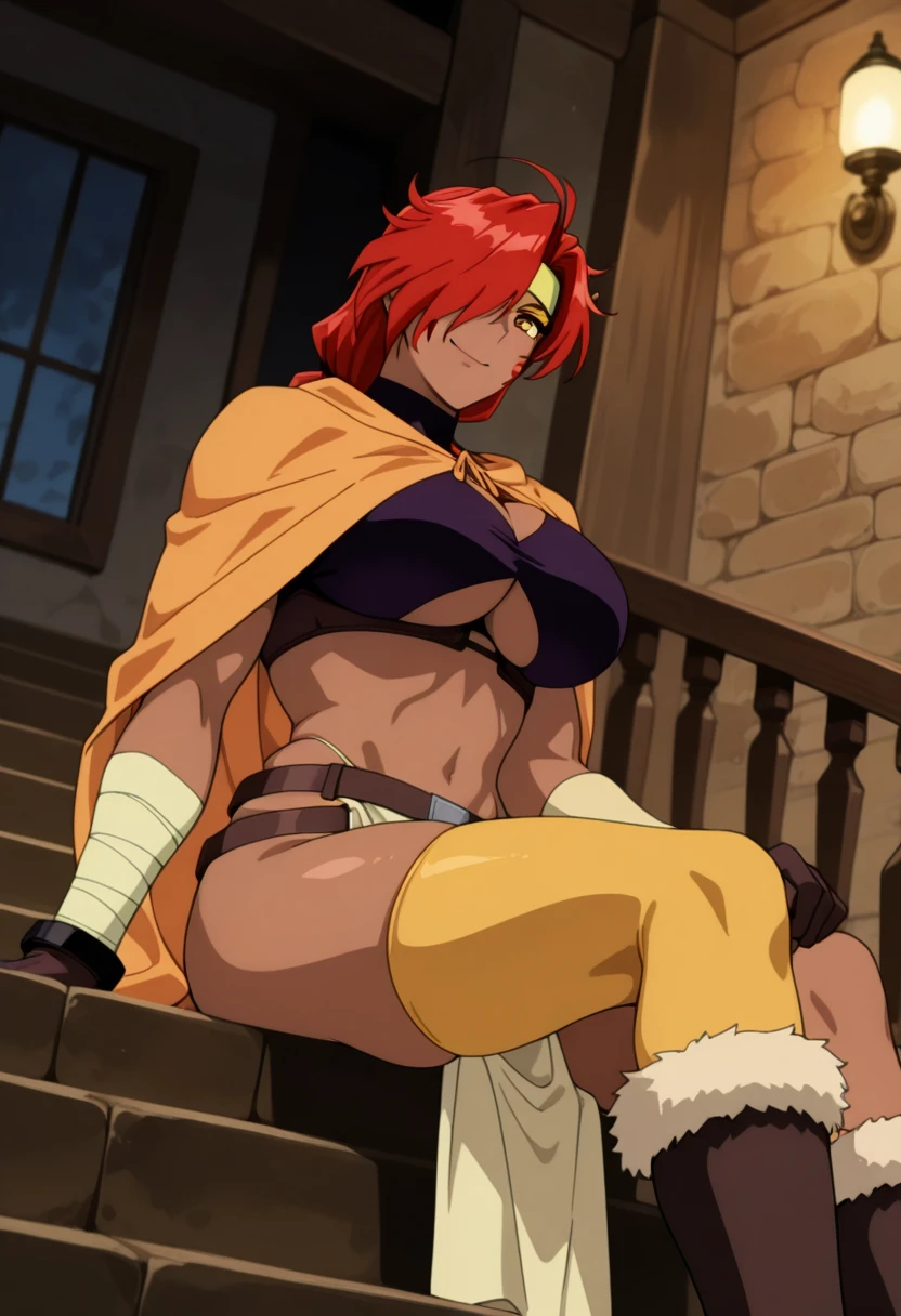 yellow headband, hair ornament, orange cloak, breasts, cleavage, underboob, cleavage cutout, crop top, purple turtleneck shirt, midriff, yellow bandages, bandaged arm, brown single gloves, yellow single wrist guard, brown belt, yellow loincloth, yellow single thighhigh, fur-trimmed boots,
