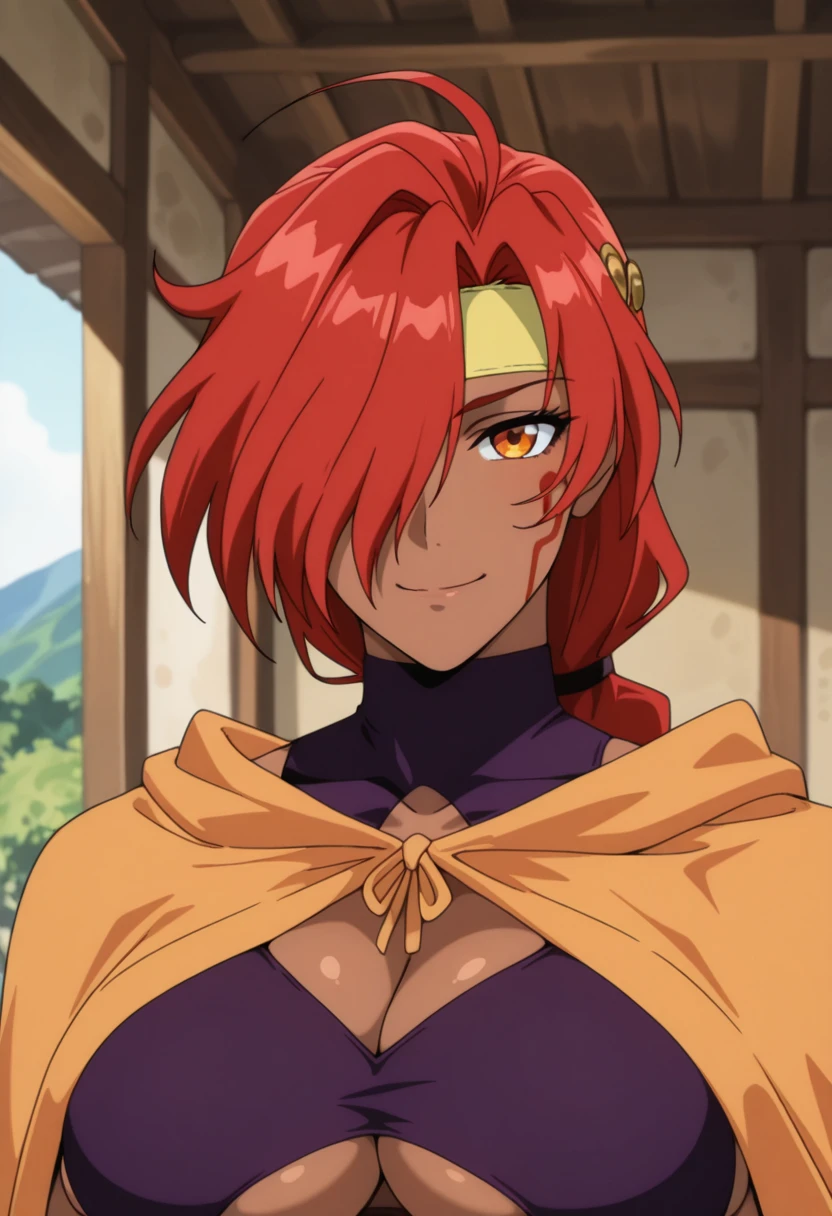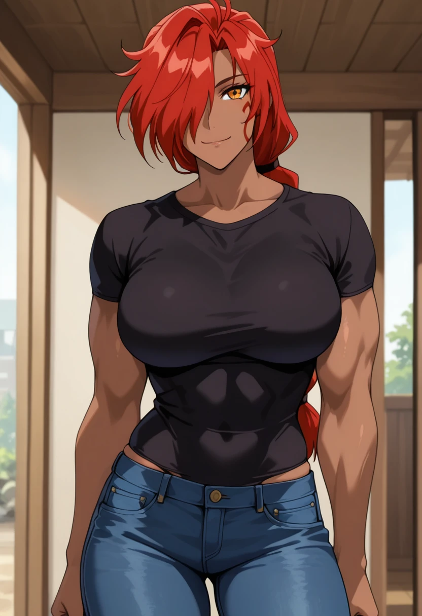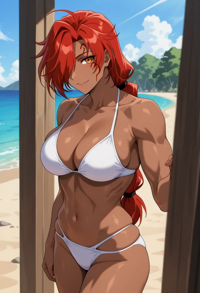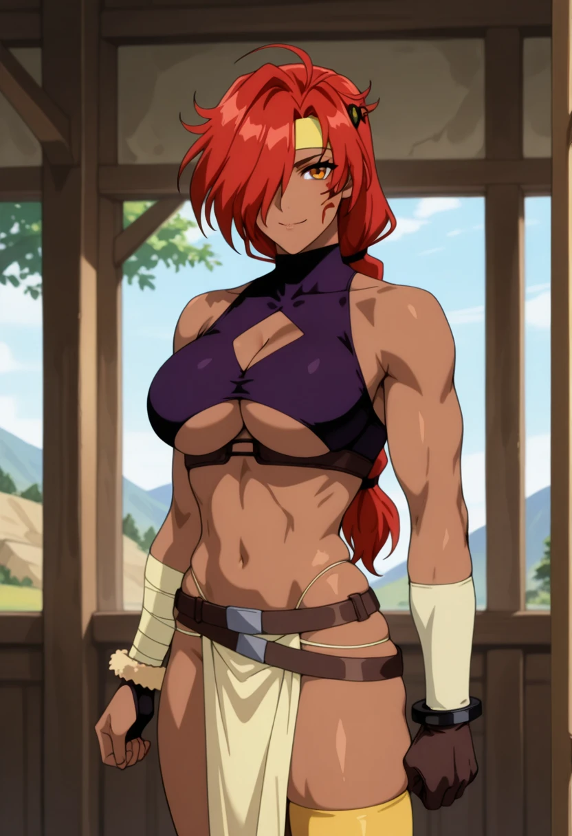 genieww, mature female, dark skin, dark-skinned female, muscular female, orange eyes, red hair, low-tied long hair, single braid, hair over one eye, facial mark, large breasts,