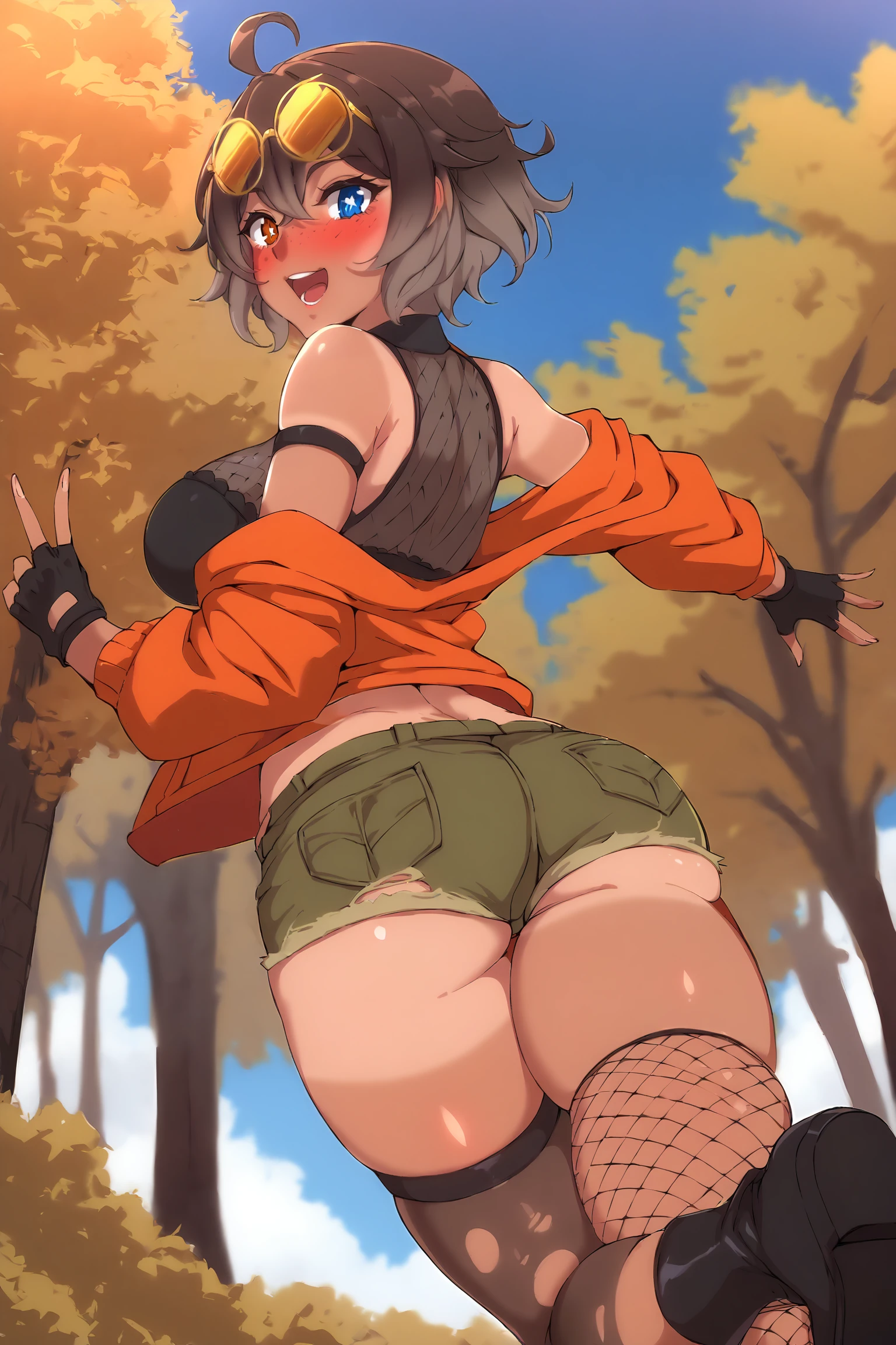 black gloves, fingerless gloves, eyewear on head, yellow-framed eyewear, midriff, torn clothes, orange jacket, open jacket, bare shoulders, short shorts, green shorts, fishnet thighhighs, asymmetrical legwear, torn thighhighs,