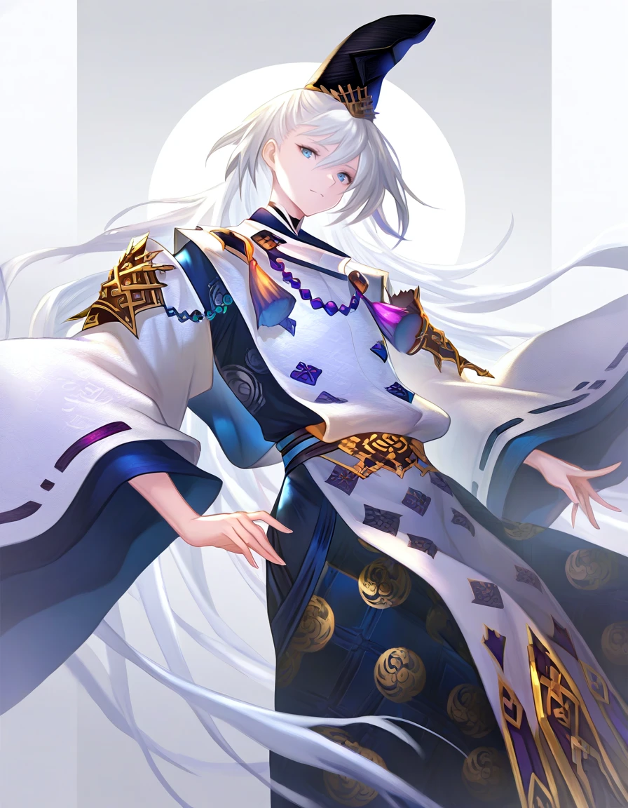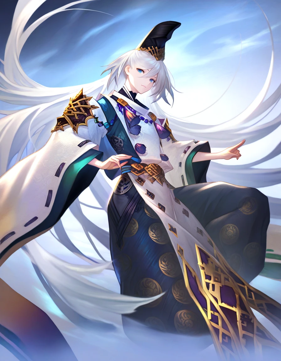 szbjiuyuan, solo, 1girl, tate eboshi, hat, kariginu, long hair, wide sleeves, japanese clothes, white hair, blue eyes,black headwear, very long hair, ribbon trim, ribbon-trimmed sleeves, shoulder armor, long sleeves, pants, tassel, armor