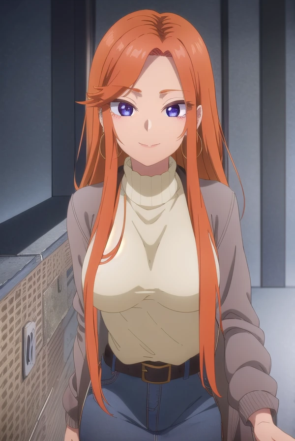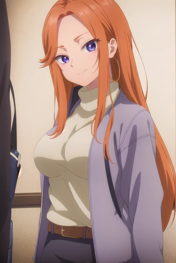 mai fuyuki, long hair, orange hair, (purple eyes:1.1), (forehead:1.2),