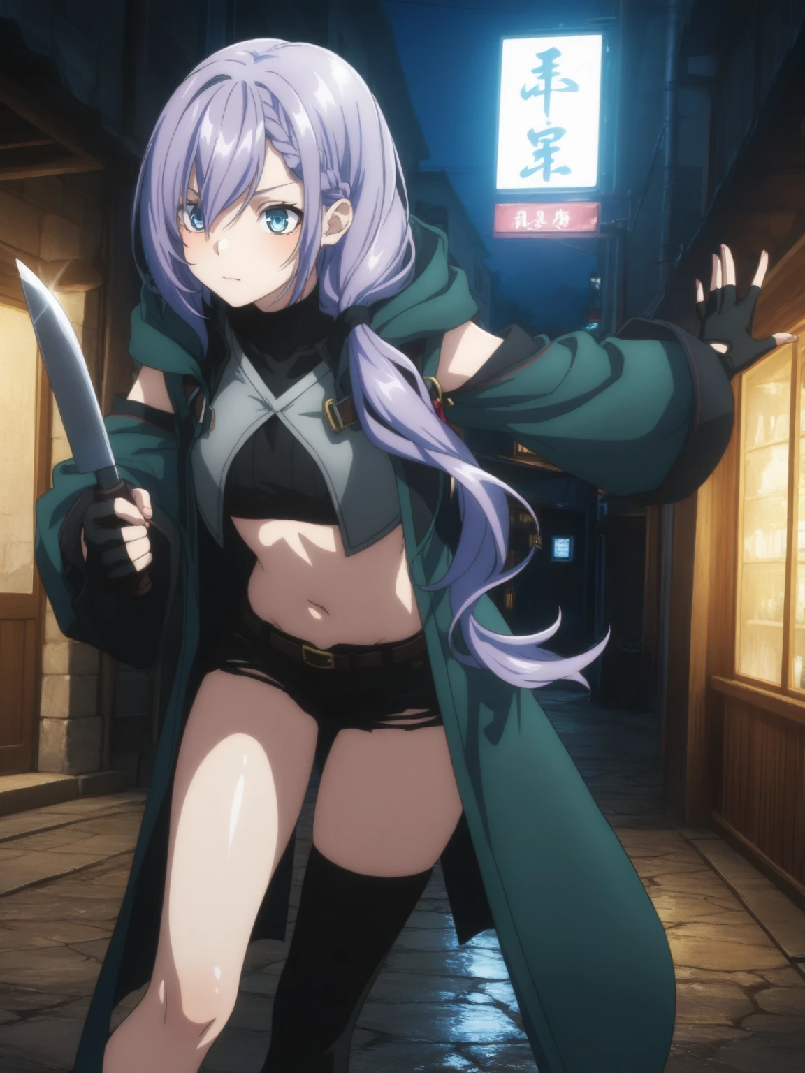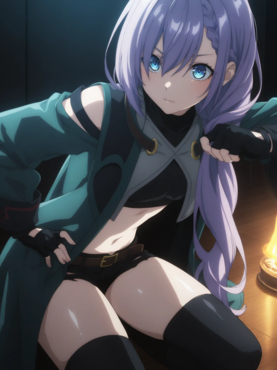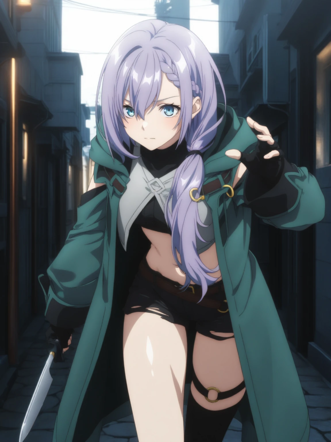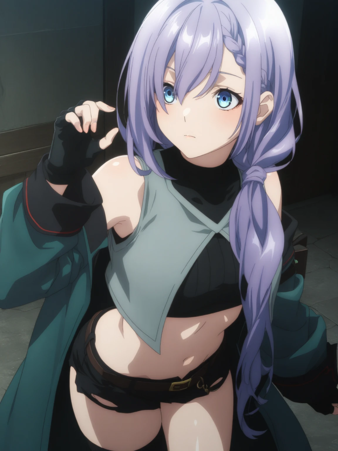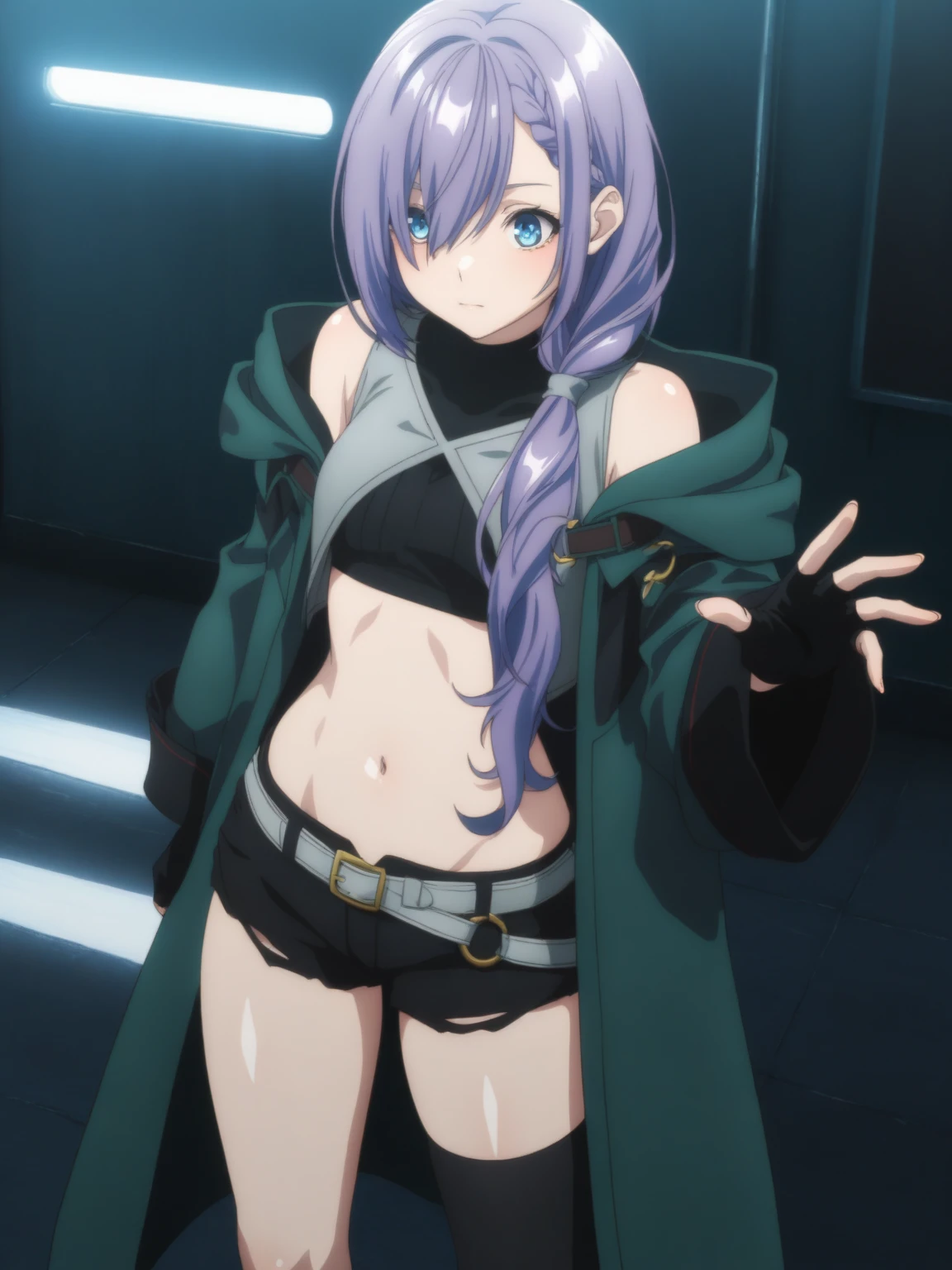Clothes: (black midriff, gray half vest, green coat, clothing cutout, black short shorts, asymmetrical legwear, black fingerless gloves, white ankle boots)
