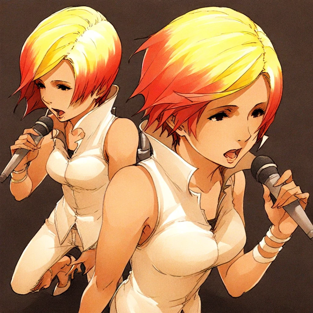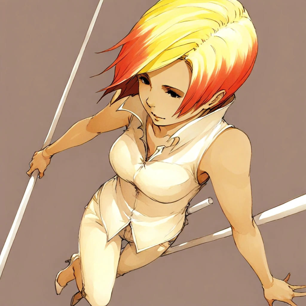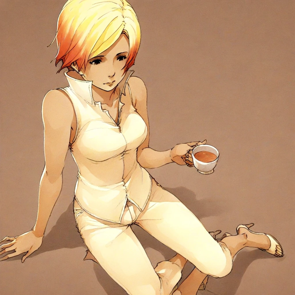 adelebaccano \(baccano\), blonde hair, short hair, brown eyes, collar, white shirt, white pants, heels, large breasts, 1girl, solo