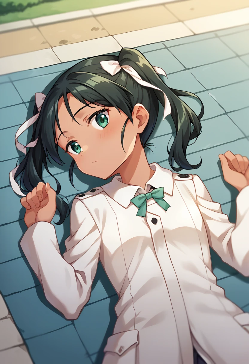 Clothing: white uniform, white ribbon, neck ribbon, striped panties,