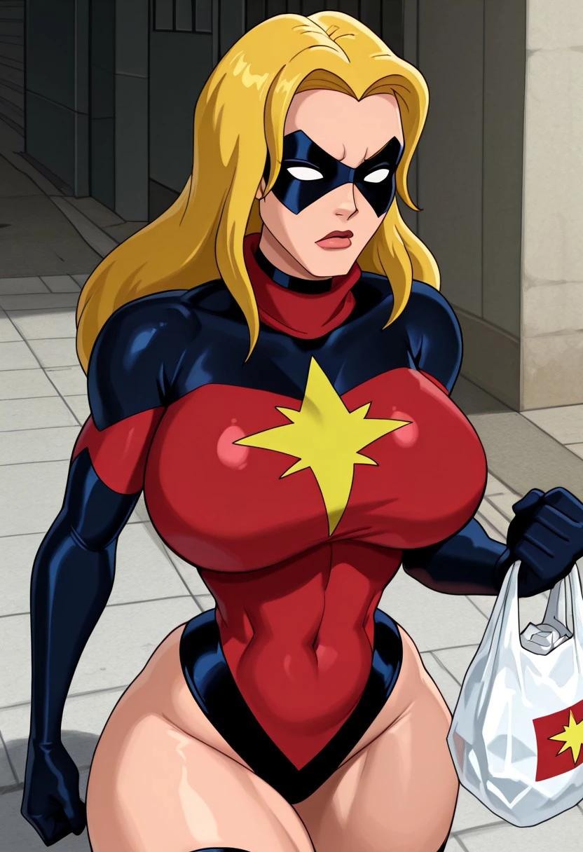 blonde hair, long hair, dark blue domino mask, white eyes, blank eyes, no pupils, parted bangs,
