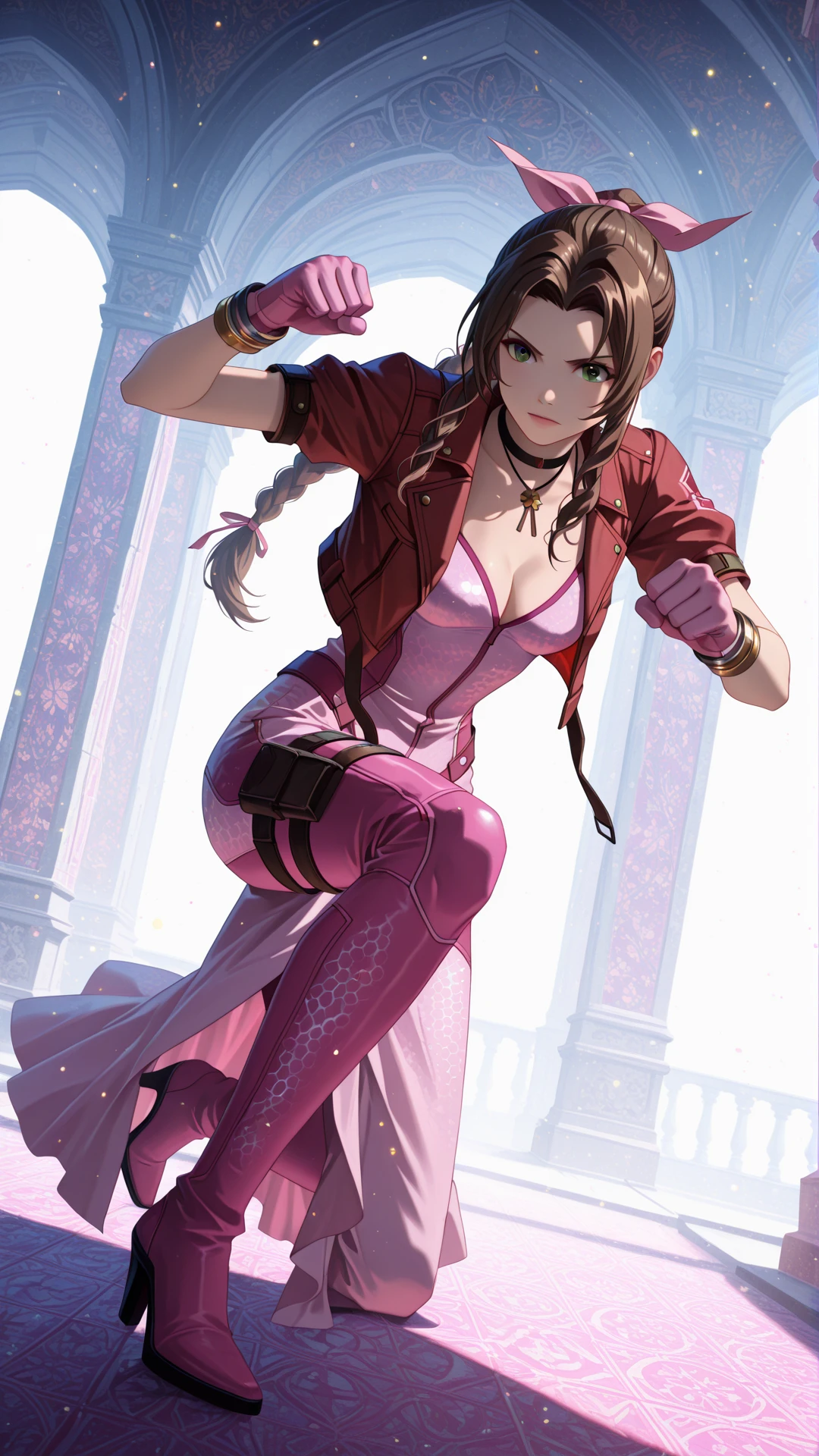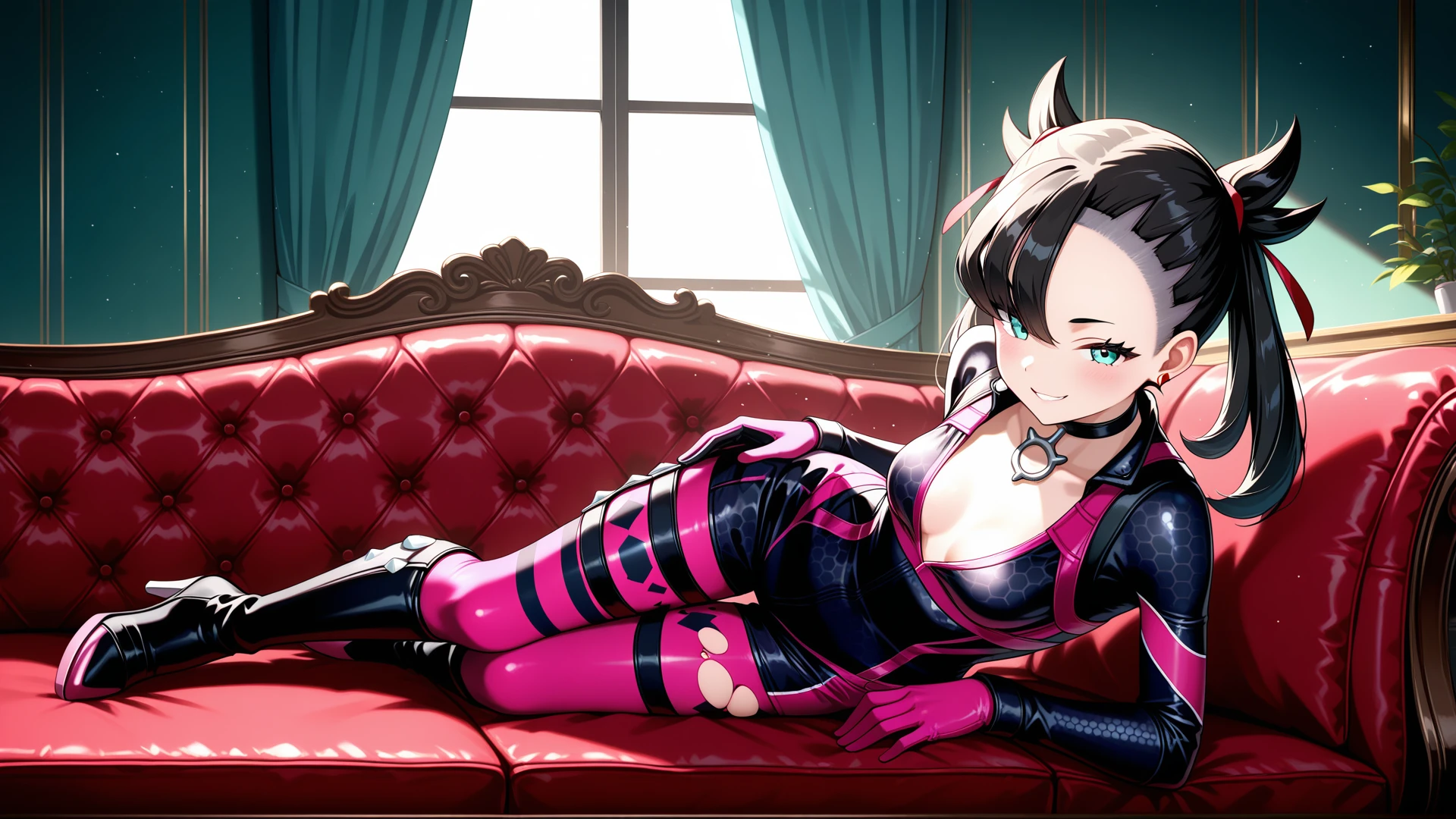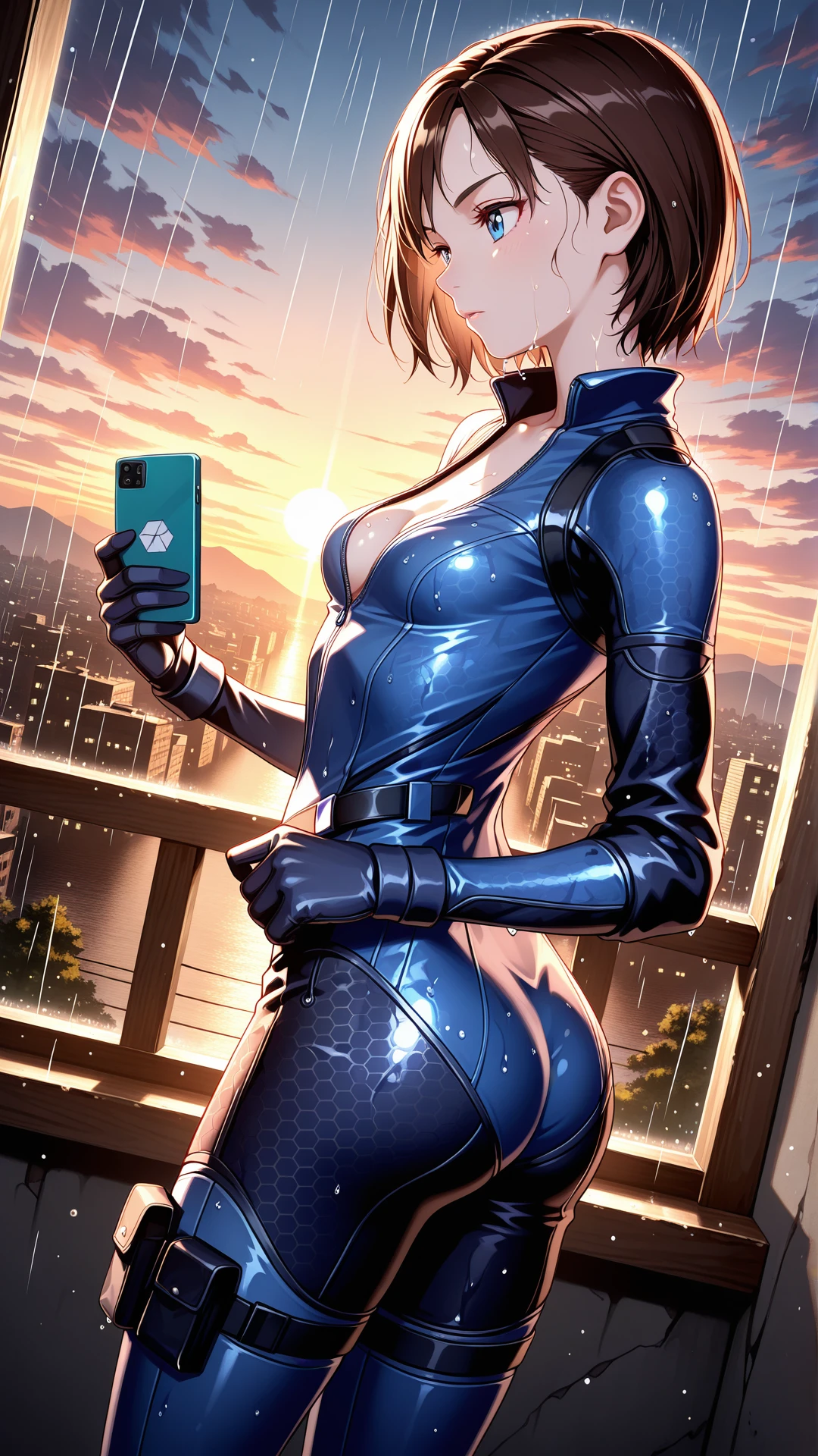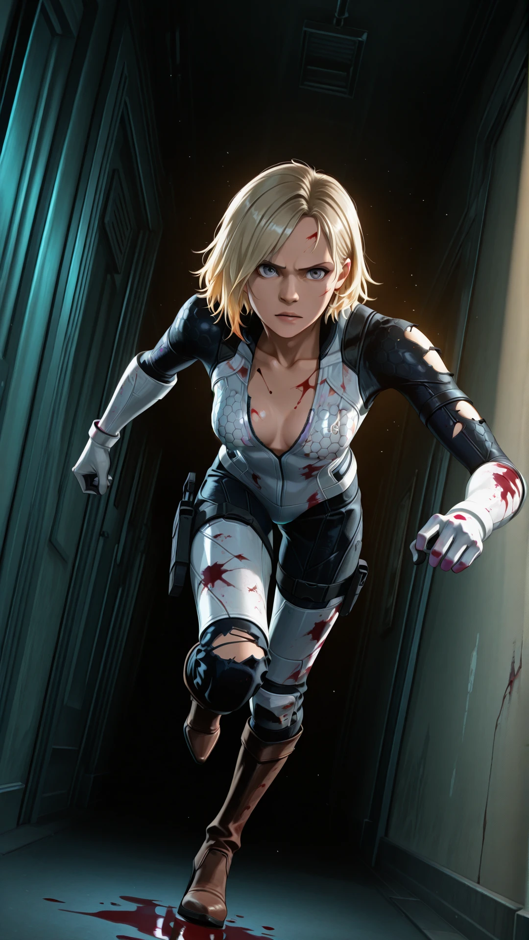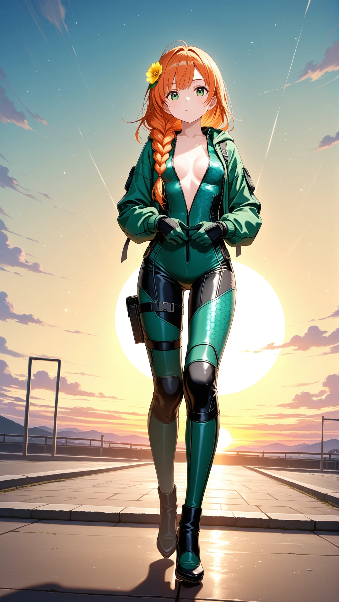 <lora:Battlesuit-10:0.8>, battlesuit, (hexagon print on bodysuit), detailed texture,skin tight, thigh strap, cleavage, gloves, high heels